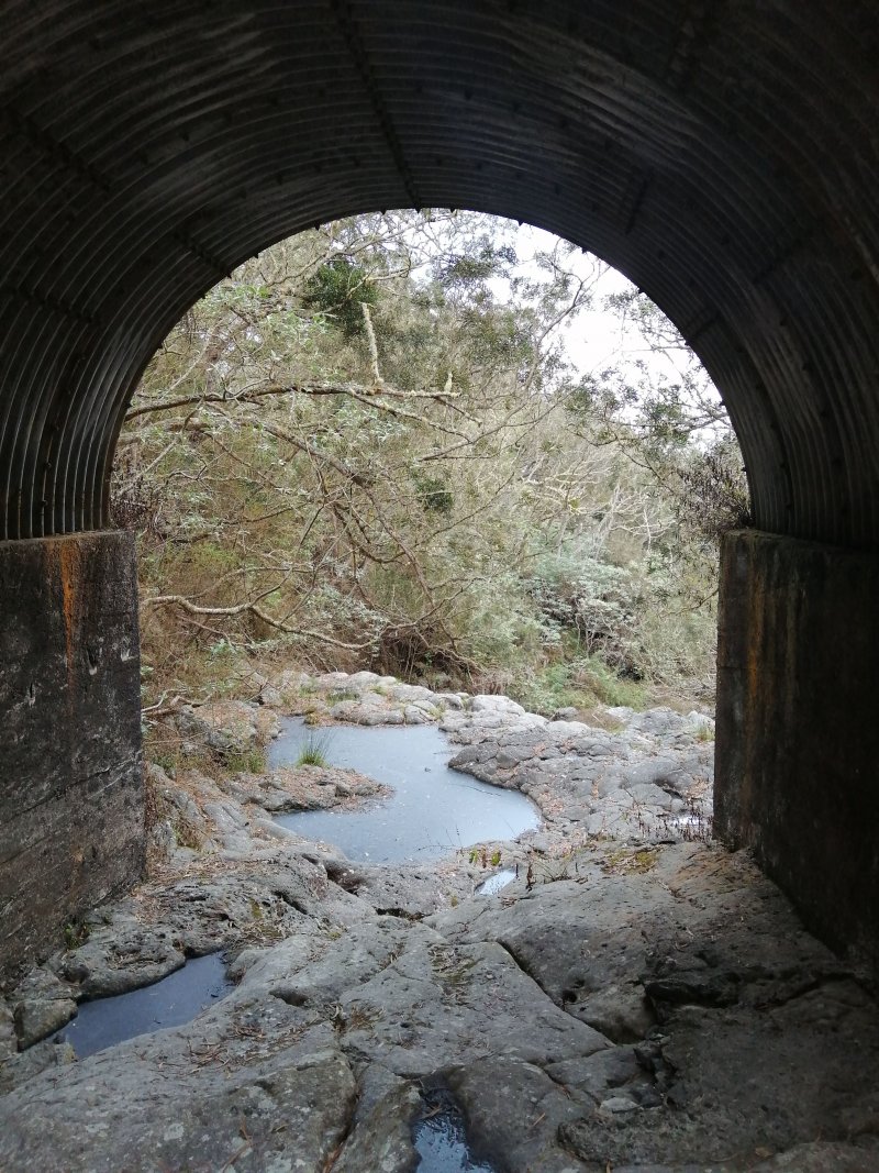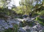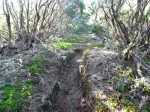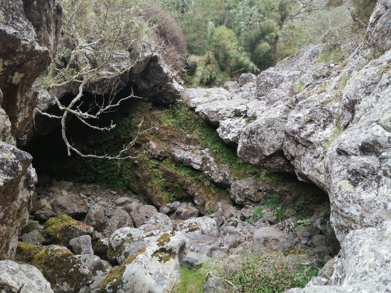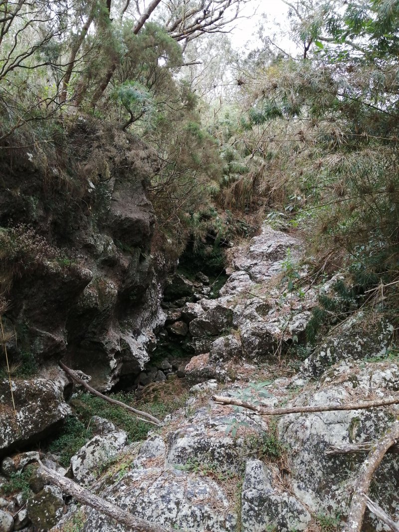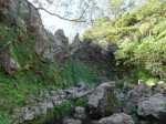 Petite boucle aventure : Suivre la route sur une courte distance à l'ombre des tamarins (Photo 9). Une citerne joliment décorée par une demi-douzaine de Gouzous de Jace occupe la rive gauche de la Ravine Bernica (Photo 10). Prendre aussitôt la RF de l'Eperon rencontrée à droite. 300 m plus loin délaisser cette piste puis obliquer à gauche sur la PF de St-Gilles, envahie de hautes herbes et très étroite (Photo 11). Si elle fait rêver sur la carte, il en va tout autrement sur le terrain. Elle disparaît dans les calumets au moment de franchir la Ravine Saint-Gilles. L'aventure débute dans les bambous endémiques par une courte descente sans danger vers le lit de la ravine. Pas d'échappatoire visible sur l'autre rive. Entamer sans hésiter la remontée de la ravine pour un hors sentier qui ravira même les allergiques aux fonds basaltiques. On côtoie une succession de cassés, grottes, cavernes, cascades à sec à l'aspect très sauvage (Photo 12). De rares escalades sont nécessaires pour éviter des gouffres creusés par les crues (Photo 12). On parvient de manière très ludique au pont de la RF des Tamarins (Photo 14). Avant de trouver la trace en amont du pont, en rive gauche pour rejoindre la route, ne pas hésiter à pousser pour la dernière découverte d'un cassé infranchissable (Photo 15).