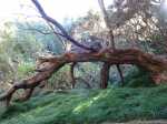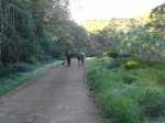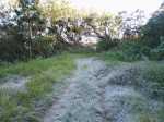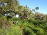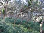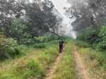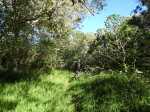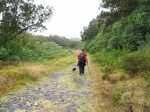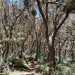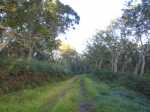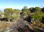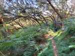 Retour à une randonnée ordinaire. Une fois revenu sur la route, reprendre la direction du sentier de découverte de la Tamarinaie. Suivre la route ou emprunter le magnifique sentier dans les fougères à quelques mètres de la route (Photo 16). Les tamarins sont de taille respectable mais on rencontre assez peu de gros spécimens comme à la Ravine Blanche par exemple (Photo 17). Avant de reprendre la route, saluer un des mastodontes au sol qui continue à vivre comme beaucoup de ses congénères n'ayant pas supporté certains cyclones (Photo 19). On foulera peu de béton avant de retrouver le Pare-feu Chemin de Bout (Photo 20). Quelques mètres après le panneau annonçant ce pare-feu, trouver le sentier remontant le talus vers une nouvelle forêt de tamarins envahie de hautes fougères (Photo 21). Les 100 premiers mètres s'effectuent dans ces fougères qui ne bouchent jamais le sentier. Quelques passages s'effectuent sur des racines mais le sentier est en général en très bon état malgré son étroitesse (Photo 22). A l'approche de la piste des 1800, le sol est encore creusé par les passages des VTT à l'époque où le circuit était utilisé plus souvent (Photo 23). Plus haut, ce sont les branles verts qui ont envahi le sol basaltique (Photo 24). Les derniers mètres s'effectuent dans les ajoncs sur une courte distance. On parvient à la piste des 1800 entre deux radiers en béton. Prendre à gauche et marcher une centaine de mètres jusqu'au début de la Piste Bolon, bien indiquée par un grand panneau. Elle débute presque à plat sur un sol rocailleux (Photo 25). Elle est constamment bordée de hauts tamarins et de nombreux bringeliers ayant envahi les fossés latéraux. L'herbe remplace les cailloux et la marche s'effectue sur un véritable tapis amortisseur (Photo 26). Les longs lacets dans la forêt lui permettent de rester en pente faible. Les fougères ont remplacé les bringeliers mais l'herbe demeure pour la balade de fin (Photo 27). Après un dernier virage au milieu de cette belle forêt, la piste se termine à la Route Forestière des Tamarins, juste en face du point de départ (Photo 28).