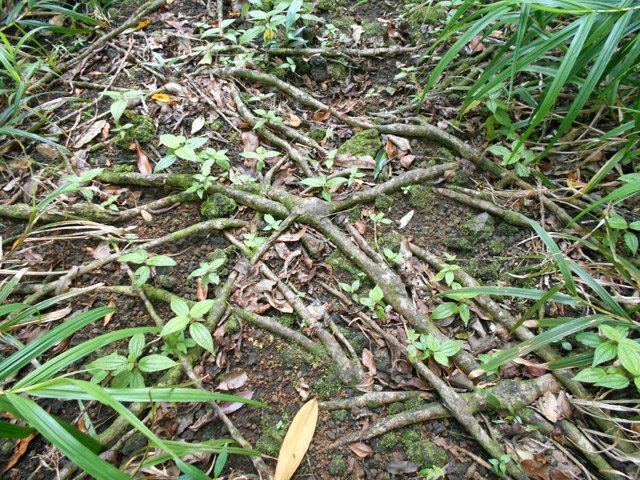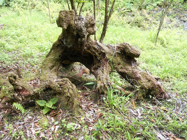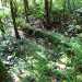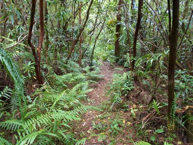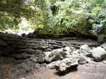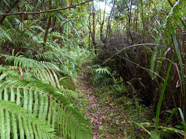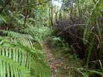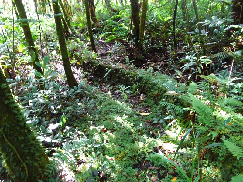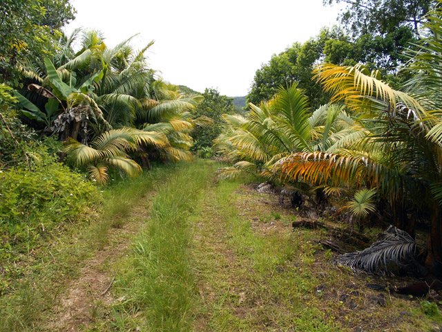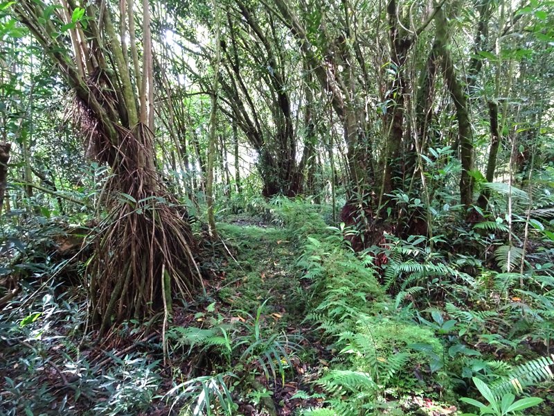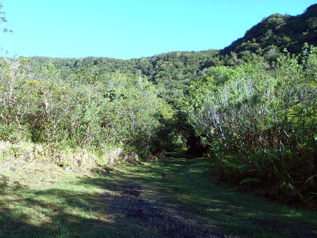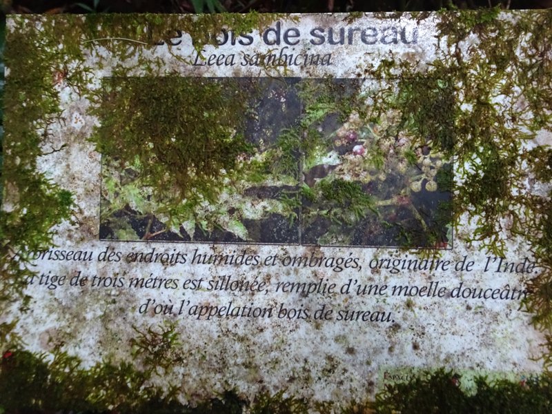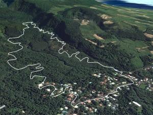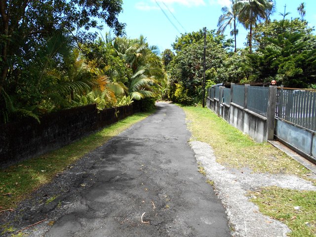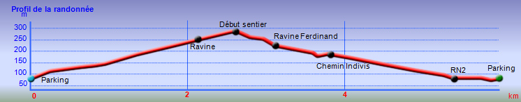 La randonnée débute à la petite aire de pique-nique implantée au cœur du village près du pont sur la Ravine de Bois Blanc. La piste commence à quelques mètres de là en marchant vers Sainte-Rose et en bifurquant sur la gauche. Elle est accessible sur autorisation et serait sinon très fréquentée en raison de la beauté du lieu. Une barrière, le plus souvent levée marque le début de l'espace naturel kilomètres (Photo 1). La montée est faible et régulière sur deux kilomètres sous les grands nattes et quelques autres essences (Photo 2) . Quelques raccourcis sont laissés aux plus sportifs car la pente qui relie les lacets de la route sont en pente assez forte. L'endroit est bien entretenu, la route propre, la pente faible et de larges clairières rendent le lieu reposant kilomètres (Photo 3). La route se transforme en piste herbeuse avant la fin de la montée (Photo 4). Elle se rapproche très près du rempart et de la petite ravine qui le longe. Certaines zones non boisées sont couvertes de fougères parmi lesquelles poussent de hautes orchidées bambous kilomètres (Photo 5). Après les derniers lacets courts, on remarque sur la gauche un panneau délabré souhaitant la bienvenue aux marcheurs (Photo 6). Le sentier pénètre aussitôt en sous-bois et longe une petite murette construite à l'époque avec goût mais depuis recouverte de fougères et de mousse (Photo 7). Les parties plates du sentier retiennent l'eau et le rendent boueux par endroits kilomètres (Photo 8). Des vestiges de cette murette sont en meilleur état par moments kilomètres (Photo 9). La parcours traverse quelques clairières où pourrissent tranquillement des racines kilomètres (Photo 10). Des pancartes moussues et de plus en plus difficiles à lire sont plantées près de certaines variétés de plantes kilomètres (Photo 11). Le sentier, étroit et parfois un peu boueux passe au plus près de cette murette avant d'arriver à une clairière ou des flèches dirigent vers une petite plantation de cacaoyers. Le sentier semble s'arrêter là mais on le retrouve sans difficulté si on retourne à la murette avant d'entamer une légère descente. Sur la droite, un autre panneau, tout aussi délabré que le premier, souhaite cette fois la bienvenue aux marcheurs sur la coulée de 1977 (Photo 12). De cette coulée, il ne reste rien de visible dans les bois de goyaviers qui l'ont recouverte kilomètres (Photo 13). Les fougères semblent se plaire beaucoup si on en juge par la longueur de leurs frondes mais elles en gênent pas la progression kilomètres (Photo 15). On longe la Ravine Ferdinand qu'on devine à travers la végétation puis on la coupe un peu plus loin par un gué à sec (Photo 17). Difficile de trouver des traces nettes de la coulée en raison de l'envahissement du sentier par de nombreuses racines (Photo 18). Si elle comporte de belles portions plus en hauteur, elle ne mérite pas ici qu'on tente une exploration. La forêt devient un peu moins touffue (Photo 19). La Ravine de Bois Blanc est plus imposante avec son large lit basaltique entrecoupé de cassés dangereux si on s'approche de trop près (Photo 20). Contrairement à la précédente, il est possible, par temps sec d'en remonter une partie pour donner un petit goût d'aventure à cette boucle banale kilomètres (Photo 21). On parvient en quelques minutes aux premières cultures, vergers et cocoteraies kilomètres (Photo 22). Il suffit alors de bifurquer sur la gauche pour suivre le Chemin Indivis à travers les cultures. Le cheminement sur l'herbe puis sur le béton est très facile et on rejoint la route nationale sans aucune difficulté après avoir longé quelques habitations kilomètres (Photo 25). Le véhicule est à environ 500 mètres en longeant la route où il faut tout de même prendre garde à la circulation.