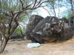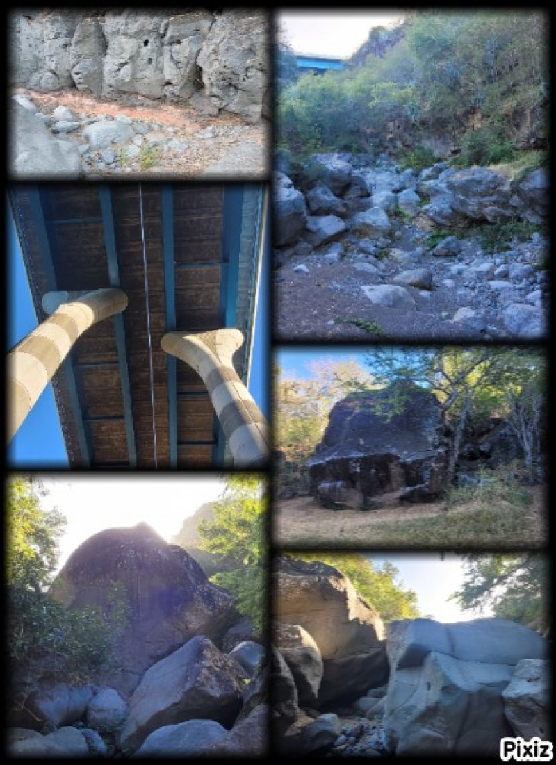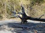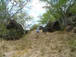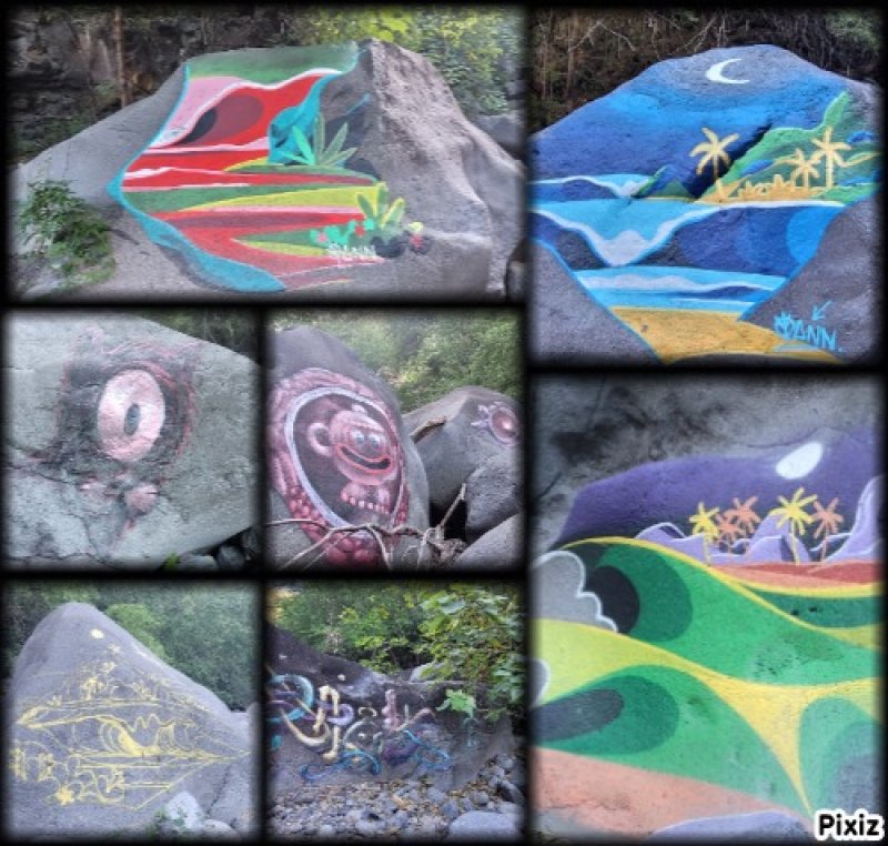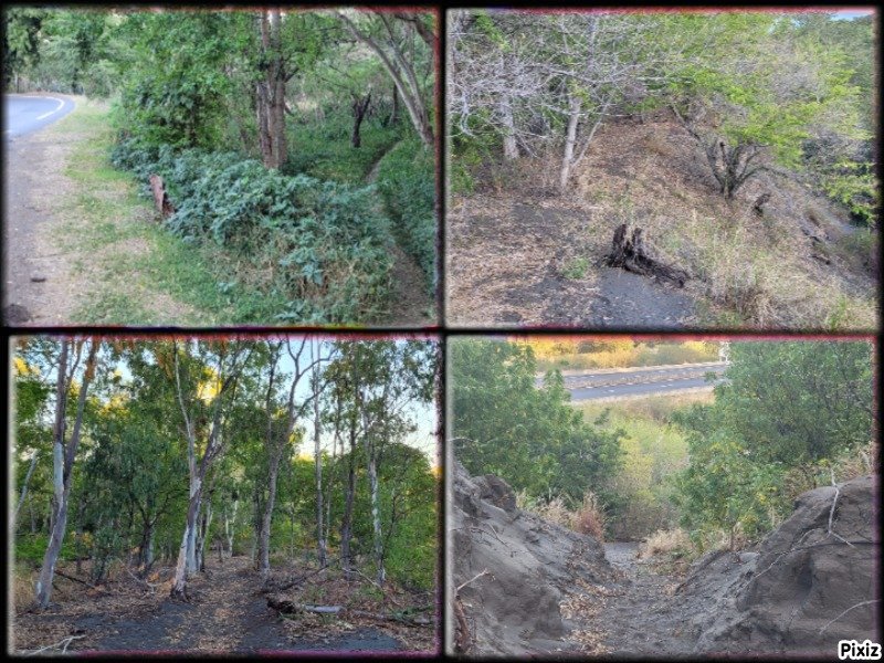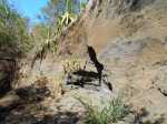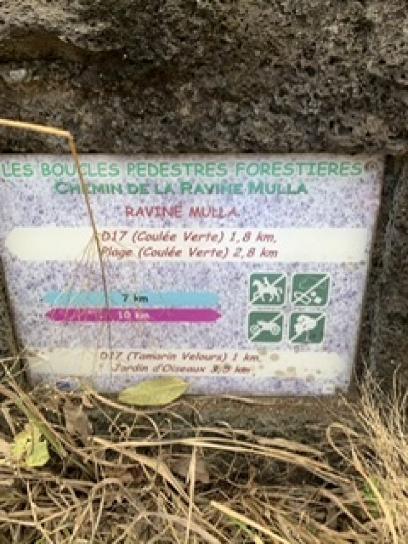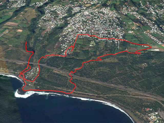 La randonnée débute ici sur la route des Avirons après avoir quitté la RN1 à l'échangeur. Un petit emplacement de trois véhicules est situé à gauche de la route dans un des derniers lacets de la route avant le prochain croisement (voir carte). Un sentier sableux (Photo 1) sillonne entre chocas et épineux et rejoint plus loin la piste qui chemine entre une petite forêt d'eucalyptus et la Ravine Mila (Photo 2). A cet endroit, la ravine est profonde et recouverte de végétation touffue (Photo 3) ou de quelques cultures de taros. Ses pentes sableuses doivent être ludiques dans la descente mais moins amusantes si on doit remonter. Le mieux consiste donc à suivre les traces de pas des curieux qui ont déjà arpenté ce bord de ravine et poursuivre sans réfléchir sous les arbres odorants en se contentant de longer le bord de la Ravine Mila. La ravine fait un coude vers la gauche et le cheminement est toujours aisé (Photo 8). Plus loin, une sorte de tranchée dans le sable montre que c'est là qu'il faudra descendre pour atteindre le fond de la ravine. La descente s'apparente à du ski car le sable, extrêmement fin et glissant, a tendance à suivre ou à précéder le randonneur. Afin de préserver le lieu et ne pas user prématurément la colline, essayer de marcher sur les côtés, là où de l'herbe envahit les flancs sableux. Le sentier se poursuit dans le fond même de la ravine. Plus loin, on passe sous l'autoroute par un long tunnel (Photo 9). On arrive très vite entre deux petits falaises de sable tassé par le temps où certains visiteurs ont gravé leur noms (Photo 11). Merci d'avance de ne pas faire de même car l'opération n'a rien d'esthétique et la multiplication de ces gravures ne sert qu'à la fragiliser. Traverser toute la zone et arriver à la Plage de l'étang Salé en passant cette fois sous la RN1a. Chercher sur cette large plage de sable gris le meilleur passage pour éviter de s'enfoncer (Photo 15) puis rejoindre, un kilomètre plus loin, l'embouchure de la Ravine des Avirons reconnaissable à son filao sur des rochers empilés (Photo 16). La remontée sportive débute par des petits galets qui grossissent rapidement. Après le pont de la RN1a, ils sont remplacés par des rochers tellement imposants qu'ils sont utilisés par les grimpeurs (Photo 18). La zone d'escalade se poursuit jusque sous le haut pont de la Route des Tamarins. Poursuivre, sans difficulté, vers l'amont en cherchant le meilleur passage entre ces rochers. On rencontre des grottes ou une bouche de tunnel de lave. Le sentier, qui remonte vers Bois de Nèfles Cadet est de plus en plus envahi (Photo 22) et nous ne l'avons reconnu que sur une vingtaine de mètres. La piste, soutenue de murettes, située en rive droite et venant de Bois de Nèfles Piton a également été envahie d'épineux rendant sa recherche aléatoire et douloureuse pour les bras griffés. Marcher jusqu'à un bassin d'eau croupie, poursuivre jusqu'à une falaise comportant le trou d'un petit tunnel de lave puis remonter encore une centaine de mètres assez facilement. La remontée est encore possible mais devient plus aventureuse. Après un demi-tour pour de nouvelles escalades de rochers, prendre la RN1a puis le Chemin Pavé et rejoindre les Avirons en suivant tout d'abord la Ravine du Ruisseau déjà reconnue pour le tour de Bois Blanc. La pente est assez forte pour une route goudronnée écrasée du soleil de l'ouest. On parvient, après quelques virages, au cimetière des Avirons (Photo 26). L'Allée du Cimetière (Photo 27) monte encore plus fortement que le Chemin Pavé et on est heureux de retrouver la D11 au cœur du village. Le retour au véhicule s'effectue par une longue descente qui fait oublier l'effort.