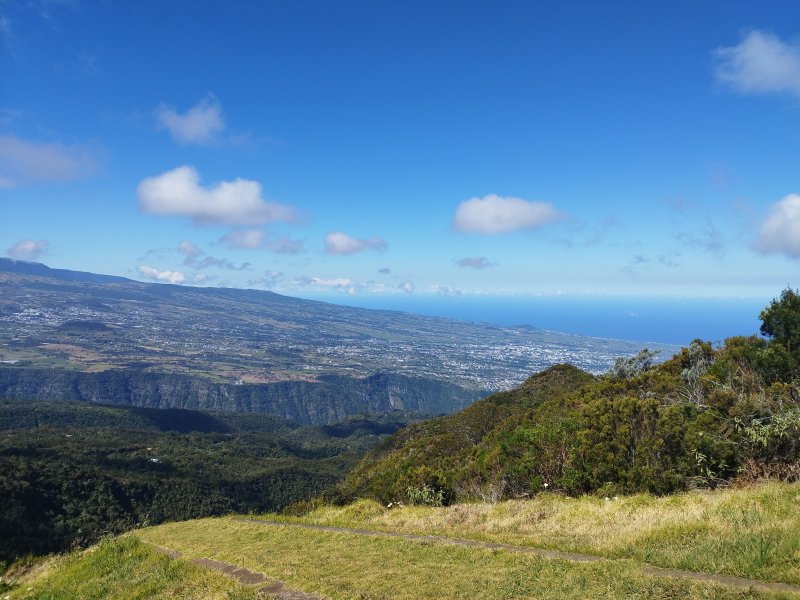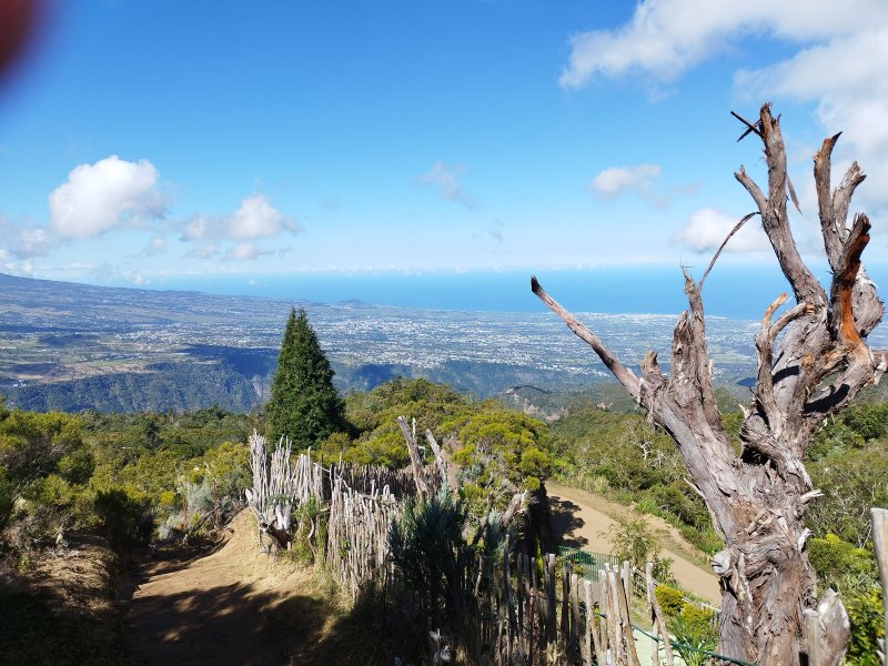 Une partie de ce trajet a déjà été présentée comme une étape de circuits plus longs comme la Jument, la montée au Sommet de l'Entre Deux ou la longue distance pour relier le Dimitile à Cilaos. A la demande de certains randonneurs voici une nouvelle fiche qui ne décrit que la montée au Dimitile par le Sentier Bœuf ou de la Chapelle et la descente par la Piste Jean Dubard. Elle permet à certains marcheurs n'ayant que peu de temps et voulant profiter des grandioses panoramas sur le Cirque de Cilaos depuis la table d'orientation du Dimitile, d'obtenir quelques éléments pour préparer ce rapide aller-retour. La montée par le sentier comporte quelques pentes assez fortes dans les bois de couleurs ou les branles verts et propose très peu de beaux points de vue. La piste qui serpente sur les flancs du Dimitile est beaucoup plus agréable à parcourir qu'on l'imagine. Elle est large et propre et fournit en revanche de nombreuses occasions de contempler la région du Tampon et des villes proches de l'océan. Quelques pièces dans la poche permettront, avant le sommet, de visiter le musée du Marronnage et voir la reconstitution de huttes sommaires du Camp Dimitil'. Conseil : repérer au passage le musée et monter, avant de le visiter, pour profiter des panoramas sur le Cirque de Cilaos avant l'envahissement fréquent et matinal des nuages.