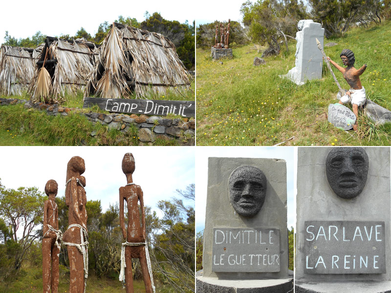 Lors de la montée vers le Dimitile ou de la descente vers l'Entre Deux, on rencontre souvent des pierres gravées en mémoire des esclaves de la région. En arrivant aux alentours des 1800 mètres d'altitude, on se retrouve face à un enclos de bois qui abrite des hommages aux marrons ayant fui la servitude pour vivre difficilement mais libres. Des sculptures, dont certaines ont souffert du passage de Béjisa ou d'autres, naïves, sont là pour rappeler la souffrance de ces esclaves. La construction du camp Dimitil' donne une idée de l'habitat des fuyards (quelques branches et de larges feuilles) quand ils ne vivaient pas tout simplement dans des grottes ou à la belle étoile. Une quinzaine de panneaux (photos interdites) retracent avec textes et dessins les origines ethniques, les emplois occupés ou les plus connus d'entre eux. Trois effigies, également naïves, présentent Dimitile, Sarlave ou Laverdure Le Roy. Une petite buvette permet de se désaltérer après cette courte mais sérieuse montée.