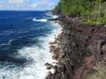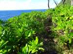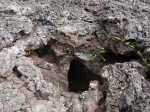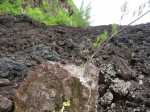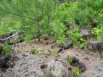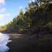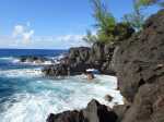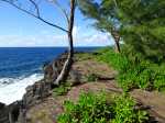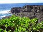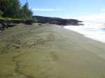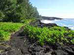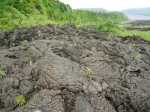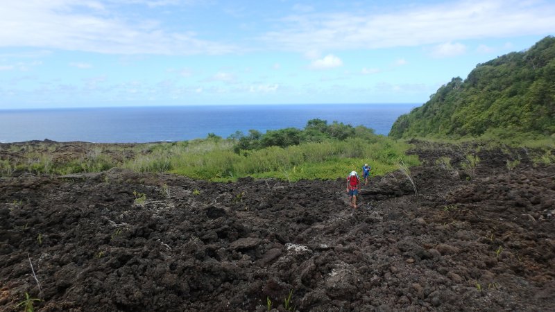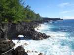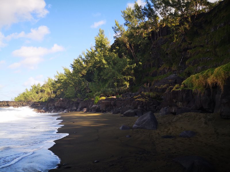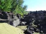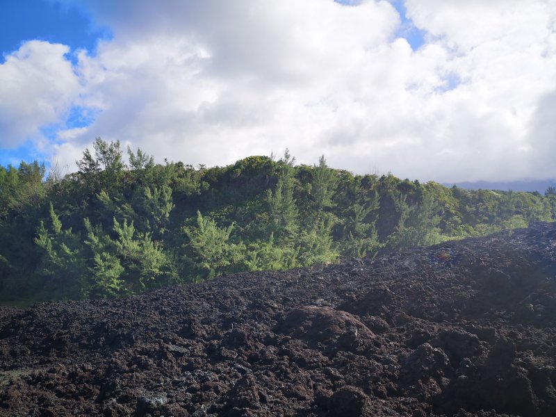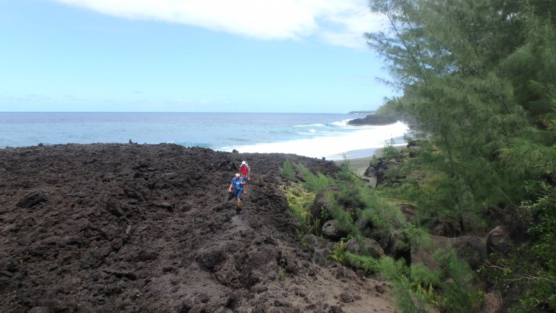 La randonnée débute à quelques pas du tunnel de Citron Galet au Tremblet. Un petit parking sous un manguier moussu permet le stationnement de 2 ou 3 véhicules. Il est hélas trop souvent fréquenté par des chiens abandonnés guettant les objets sortant du coffre d'un air triste. Quand on sait qu'on vient ici, le sandwich doit être préparé avec 10 cm de plus qu'à l'habitude. La route forestière du Vieux Port du Tremblet débute juste en face (Photo 1). Rejoindre le Vieux Port par la petite route est un pur plaisir car elle est à l'ombre des grands bois de couleurs, les oiseaux partent dans tous les sens et la pente est faible (Photo 2). Les fougères ont envahi les fossés et même les grands troncs où elles s'accrochent jusqu'à 7 ou 8 m de hauteur. On remarque quelques plantations de vanille à l'ombre des grands arbres. La route est étroite, la circulation minimaliste et la descente est une balade (Photo 3). Après quelques lacets, le bruit de la mer devient de plus en plus fort. Une pancarte de l'ONF indique le sentier littoral de Saint-Philippe qui débute ici et commence vers la droite. Partir sur la gauche et débuter la descente vers la nouvelle plage du Tremblet en passant devant un kiosque isolé (Photo 4). Le sentier comporte quelques hautes marches et un ou deux lacets. La descente est rapide jusqu'à la mer. Repérer, avant d'arriver au Quai de sel, un sentier de pêcheurs qui file sur la droite entre les filaos. On se retrouve sur un palier de la falaise sur lequel il est facile de marcher. On domine les vagues d'une petite dizaine de mètres et la balade est très facile et agréable. Après 300 m de cheminement on arrive à l'arche naturelle du Quai de Marie (Photo 5). L'endroit est magnifique, battu par les hautes vagues qui font apparaître et disparaître le tunnel sous le basalte. Attention à la chute pour tenter de s'en approcher. Les marches sont hautes ainsi que les vagues qui représentent un réel danger. En se retournant, on voit très bien la coulée de 2007, le Quai de Sel, l'arche et les filaos sous lesquels on a marché (Photo 6). Poursuivre plein sud sur un terrain plat et peu dangereux à condition de ne pas trop s'approcher du bord (Photo 7). Certaines zones sont assez friables et doivent s'éviter pour ne pas risquer une chute de pierre vers la mer (Photo 8). Une bonne partie du trajet s'effectue sur ces roches plates ou à travers les maniocs marrons qui recouvrent le rempart (Photo 9). Inutile de chercher un sentier qui monterait rejoindre celui de Saint-Philippe 60 mètres plus haut (Photo 10). Marcher ainsi pour profiter du paysage jusqu'à une cassure de la falaise qui devient trop abrupte pour la franchir sereinement et repartir vers le Quai de Sel. Retrouver le sentier officiel et obliquer à droite en direction de la nouvelle plage qu'on devine au loin (Photo 11). Le Quai de Sel est une avancée basaltique dans la mer très prisée des pêcheurs qui y accumulent hélas touts les résidus de leur loisir préféré (Photo 12) ! Après quelques marches hautes et au passage délicat, on se retrouve sur le haut de la petite falaise qui domine la plage (Photo 13). Il est possible de descendre sans danger à un filao mort couché ou à d'autres endroits comportant de hautes marches. La plage, de couleur vert-jaune due à l'accumulation d'olivine arrachée des gratons de la coulée de 2007, change constamment de forme en raison de la marée (Photo 14). En fonction de l'angle des rayons du soleil ou de la présence de nuages, la couleur passe du jaune brillant au gris (Photo 15). Se rapprocher des coulées et chercher ces cristaux dans les cailloux intacts pour mieux comprendre leur présence dans le sable gris. Après de fortes pluies, deux cascades coulent de la falaise et remplissent un bassin très prisé des nageurs (Photo 16). La montée peut débuter en repérant le premier passage entre vieux basaltes et jeunes gratons (Photo 17). On passe en une minute du sable mou aux roches volcaniques très dures et acérées (Photo 18). Deux choses à retenir : Marcher au plus près de la falaise (Photo 19) ou sinon regarder où se posent les pieds sur ces laves qui peuvent bouger sous le poids. On rencontre, tout au long de la montée, de belles concrétions qui ne sont pas encore colonisées par les lichens et fougères (Photo 21). Eviter les gratons instables, les dessus de petits tunnels ou les bords d'effondrements. On remarque un peu partout des trous plus ou moins profonds qui sont souvent des tunnels de lave déjà explorés par les spéléologues (Photo 23). Eviter absolument les petits tunnels qui cassent vite sous le poids d'une personne (Photo 24). Contourner obligatoirement les amoncellements de plaques instables, surtout si on y remarque faille ou grotte (Photo 25). On remarque à l'horizon le Piton du Tremblet en amont de la route qu'on repère aux véhicules qui passent (Photo 26). A l'approche de la route, préférer le fond de la Ravine Criais qui a bien changé de lit en 2007 (Photo 27). La montée est rapide malgré le terrain inhabituel et on se retrouve à la route les Laves en une grosse demi-heure (Photo 28). Emprunter la route vers la gauche en surveillant la circulation assez dense dans cette région touristique. Repérer les cases créoles et les jardins exotiques en longeant la route pour traverser le hameau puis terminer en marchant à plat jusqu'au véhicule qui attend à l'ombre.