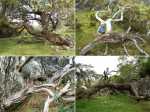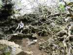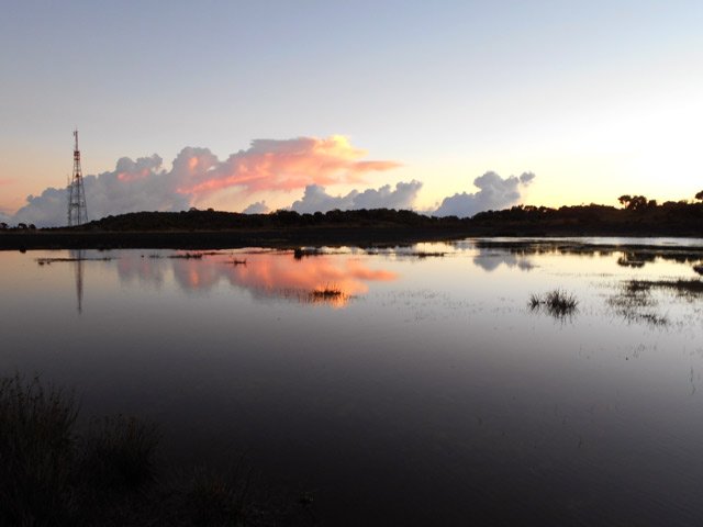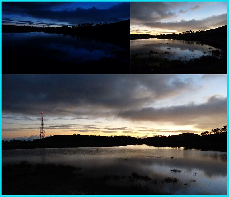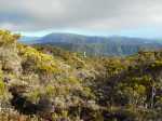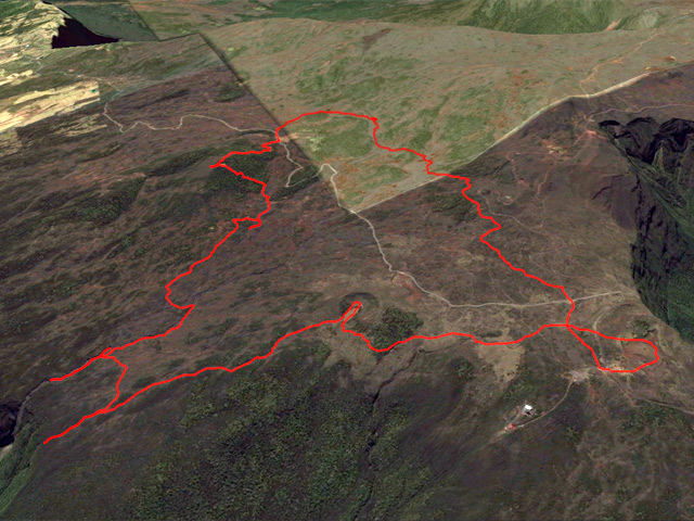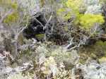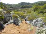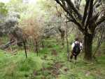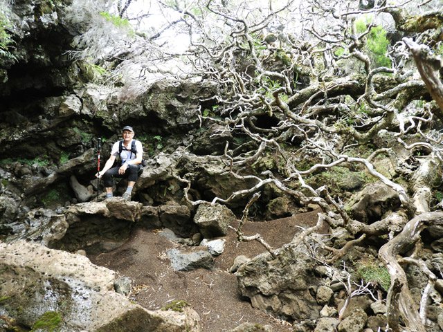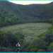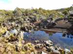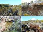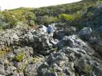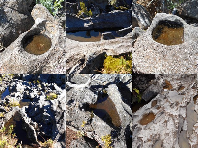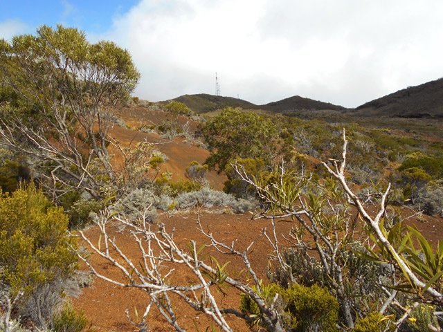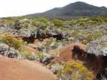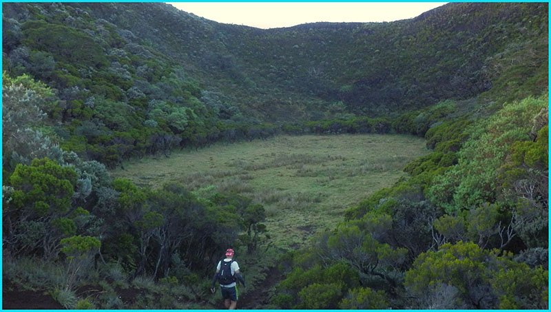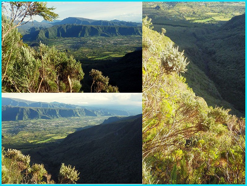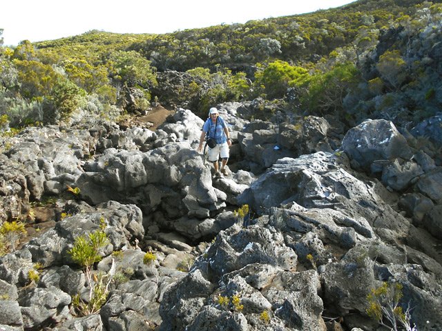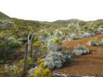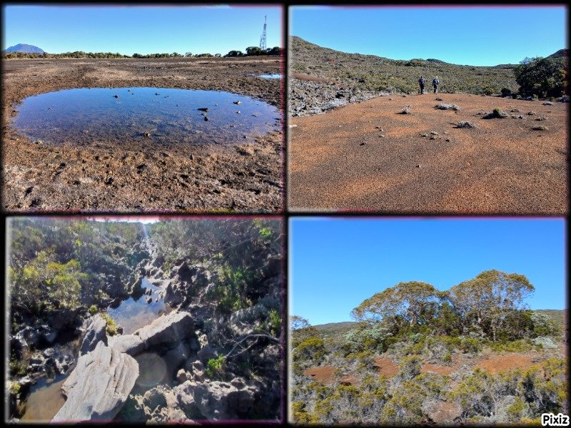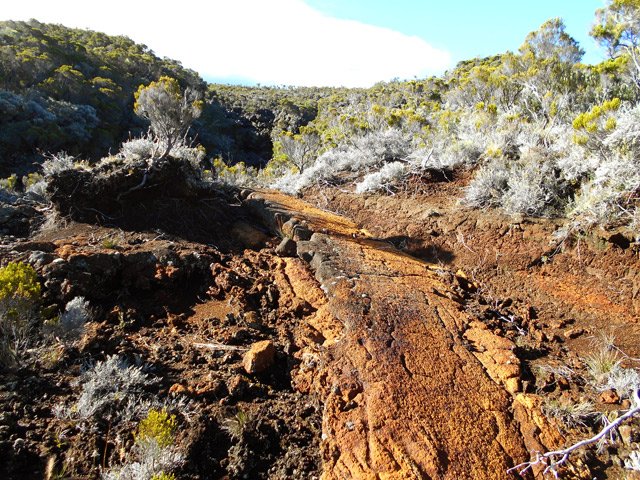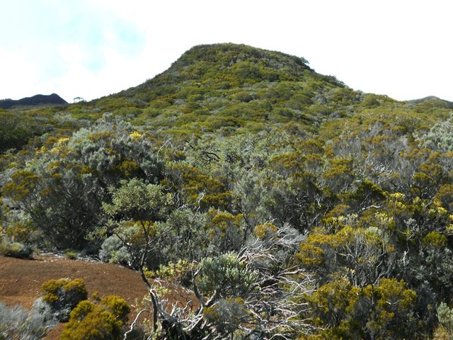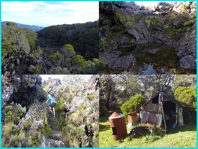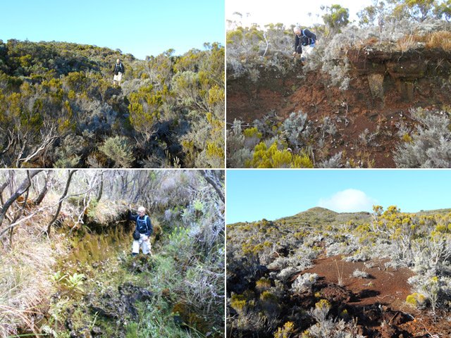 La randonnée débute au Piton de Sable dont le fond recouvert d'eau donne de beaux clichés de jour lorsque le Piton des Neiges s'y reflète. Le matin, très tôt, ce sont les nuages et le pylône du Piton Textor qui miroitent (Photo 1). Attention, il n'y a pas d'eau toute l'année mais on est assuré d'en voir après les forts épisodes pluvieux. Après cette balade semi-aquatique, rejoindre la route forestière du Volcan par n'importe quel itinéraire, comme sur la carte ci-dessous, pour bien débuter ce hors sentier de près de 10 km. Prendre la direction du Piton de Caille en filant plein nord sur des sentiers existants ou déjà en traversant la savane entourant le Piton Textor. Le centre du cratère du Piton de Caille, déjà escaladé lors d'une autre randonnée, s'atteint par un petit sentier de vaches rencontré en marchant sur le Sentier du Piton Textor. La pente est faible et le cheminement s'effectue un peu penché en raison des branches basses. La prairie qui en couvre le fond incite au bivouac malgré l'absence d'eau (Photo 2). Poursuivre vers le nord et cherchant le meilleur passage entre les plantes (Photo 3) et en repérant au plus vite la petite ravine qui grandit au fur et à mesure de la descente vers le cassé du Grand Bras Piton. On randonne sans difficulté en longeant la ravine ou ses abords dans les zones dénudées ou couvertes de petites plantes, principalement les branles verts (Photo 4). Les panoramas sur la Plaine des Palmistes et les grands massifs de la Réunion deviennent de plus en plus larges, du Piton des Neiges jusqu'au Mazerin (Photo 5). Plus on approche du cassé, plus il faut suivre le fond étroit de la petite ravine où les amateurs de natures mortes se régaleront des belles trouvailles (Photo 6). On parvient ainsi à une profonde vallée de 300 mètres de profondeur où l'on aperçoit le lit chaotique du Grand Bras Piton. Attention à la chute car la falaise est vertigineuse mais la vallée est magnifique (Photo 7). Pour rejoindre le Grand Bras Piton, rivière principale de la zone, il faut revenir sur ses pas et obliquer sur la gauche dès que le sol dénudé revient. Ne pas hésiter à descendre cette ravine basaltique offrant tous les 10 mètres une petite merveille de la nature. Attention tout de même lors des franchissements de plus en plus difficiles vers le cassé qui ne sont pas obligatoires. Le sentier, ou plutôt le passage, s'effectue par moments sur de belles plaques de lave jaunies par les oxydes (Photo 9). Repartir en remontant la ravine, le plus souvent dans le fond (Photo 10). On remarque sur la gauche des poteaux et une clôture barbelée qui semble sortie de nulle part (Photo 12). Rejoindre cette longue enfilade de poteaux réguliers et la suivre au plus près. Il faut parfois s'en éloigner d'une dizaine de mètres pour contourner une touffe de plantes, mais on la retrouve très vite. On arrive près d'une petite case en tôle (Photo 14) entourée de beaux tamarins (Photo 13) avant de rejoindre à nouveau le fond de la ravine (Photo 16). Remonter un peu sur le basalte puis obliquer sur la gauche pour entamer une rude montée vers le sommet du Piton des Treize Cantons. Il y a partout des sentiers de vaches et le but consiste à atteindre le haut par le chemin le plus court pour les sportifs ou le plus sinueux si la fatigue se fait. Le fond se trouve facilement après cette petite grimpette. On retrouve une nouvelle prairie qui tapisse le fond du cratère, fort heureusement délaissée de toute plante invasive (Photo 17). On a de ce bord de piton de magnifiques vues sur la Plaine des Palmistes (Photo 18). Le cheminement reprend dans les branles (Photo 19) pour se retrouver nez à nez avec cette longue clôture barbelée. Reprendre donc le chemin en longeant toujours au plus près sur une forte descente (Photo 20) bordée de magnifiques tamarins des Hauts aussi biscornus les uns que les autres (Photo 21). Même les arbres morts sont superbes. La clôture fait de nombreux zigzags et il suffit de la suivre sans réfléchir. Elle se termine à la Route Forestière du Piton de l'Eau. Traverser la RF, retrouver le sentier du Piton de l'Eau et le franchir pour garder à l'esprit le hors sentier total. Viser le petit piton, bien visible dans la végétation (Photo 22. Comme précédemment, chercher les meilleurs passages pour franchir le col entre deux nouveaux pitons. On retrouve sans surprise le Grand Bras Piton dont un affluent propose un petit coin très sauvage près d'un cassé de cascade (Photo 23). Ne pas hésiter à l'atteindre. On devine même une grotte en partie cachée par des tamarins maigrichons et de grands branles verts (Photo 24). A partir de là, on aperçoit certains virages de la route du volcan et des véhicules qui servent de repères. Marcher sur les meilleurs passages, souvent recouverts de lapillis (Photo 25) entre la route et le sentier du Piton de l'Eau. De minuscules ravines creusées dans le tuf orangé créent ce beaux paysages (Photo 26). Le pylône du Textor sert également de repère s'il n'y a pas de brouillard (Photo 27). Les balises rouges et blanches rencontrées en fin de ce long hors sentier indiquent qu'on a retrouvé le GRR2 qui remonte à l'Oratoire Sainte-Thérèse. Suivre le GR jusqu'à la route et au parking du Piton de Sable.