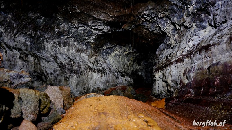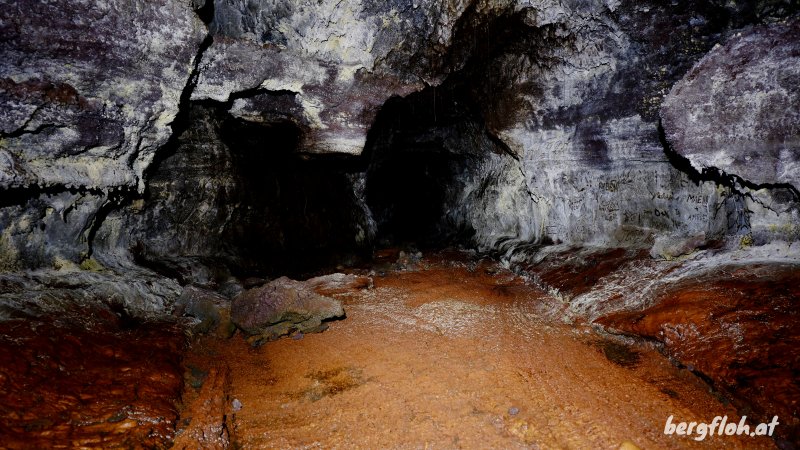 La randonnée débute à une vingtaine de mètres de la petite route menant au Puits Arabe. Des bananiers et des bambous proches d'un poteau télégraphique abritent le départ du sentier (Photo 1). Le panneau d'interdiction concerne les parcelles longeant le sentier mais pas le passage suivant au plus près la limite domaniale. Bien qu'un peu encombré d'herbe, de tabac marron et de fougères, il est facile à suivre et très visible (Photo 2). Les goyaviers, comme partout, font très vite leur apparition en bordure du sentier qui devient caillouteux et peut comporter de hautes marches glissantes (Photo 3). Ailleurs, ce sont les racines qu'on retrouve en travers du passage mais sans rajouter de difficulté (Photo 4). Attention à quelques trouées dans les petits tunnels de lave qui bordent le passage car une chute pourrait faire mal à la jambe (Photo 5). S'il n'y avait pas autant de goyaviers, les sous-bois seraient agréables dans cette forêt humide de basse altitude (Photo 6). La pente est très faible jusqu'à la ravine (Photo 7). Les gros arbres sont rares et se remarquent de loin (Photo 8). On trouve même quelques bois de couleurs difficilement identifiables en raison des fougères poussant sur leurs troncs (Photo 10). De beaux palmiers, (sans doute Livistona saribus), aux longues tiges terminées par de grands éventails poussent ça et là en sous-bois (Photo 11). Quelques affouches aux racines étrangleuses bordent le sentier par endroits (Photo 12). Le sentier rencontre la petite ravine à quelques mètres d'une arche surmontant un bassin à sec (Photo 13). Le champ de canne à sucre n'est jamais loin ainsi que quelques bananiers envahis de lianes (Photo 14). Le sentier est toujours correct en raison des passages réguliers du propriétaire des cultures de vanille empêchant la végétation d'envahir. On chemine de plus en plus près de la ravine quand on ne l'emprunte pas carrément (Photo 15). Plus haut, après un passage sur des cailloux moussus (Photo 16), on est obligé d'emprunter le fond (Photo 17). On ne le quittera qu'exceptionnellement jusqu'à la bouche du tunnel de lave. Il y a rarement de l'eau dans cette rigole même si on y repère des petits bassins créés lors des dernières pluies (Photo 18). Le fond de la ravine est moussu et peut être glissant après les pluies. La pente étant assez faible le risque n'est pas bien grand. La végétation est assez dense par endroits, créant un vrai tunnel végétal (Photo 19). Après 1000 m et moins de 30 minutes de montée régulière, on parvient à un tronçon de la ravine plus encombré qu'ailleurs. Prendre alors à droite et suivre les traces de nombreux passages sur les racines recouvrant le sentier avant d'arriver à quelques roches qu'il faut escalader. On a devant soi une espèce de petite ravine qui est le résultat de l'effondrement de la voute du tunnel. Ne pas tenter de pénétrer dans la petite grotte aperçue à gauche à la descente de moins de 2 m. Partir sur la droite sur une quinzaine de mètres. L'entrée de la grotte est là, impossible à manquer même si quelques troncs de goyaviers tentent de la boucher (Photo 20). L'accès est facile et le plafond assez haut (Photo 21). Le sol, rougi par les oxydes de fer, débute à même l'entrée (Photo 22). Pénétrer de quelques mètres pour mieux apprécier la taille du tunnel et allumer les lampes. La visite est impossible sans lumière et il est préférable d'être casqué. Le boyau est court, beaucoup plus sec que certains autres, et ne comporte qu'un embranchement. Le sol est une pure merveille de couleurs chaudes (Photo 23). Plus loin, un rai de lumière indique un puits de sortie mais la cavité devient de plus en plus étroite, à laisser aux spéléologues (Photo 26). Le retour s'effectue par le même itinéraire.