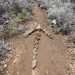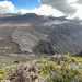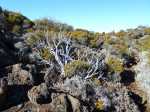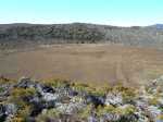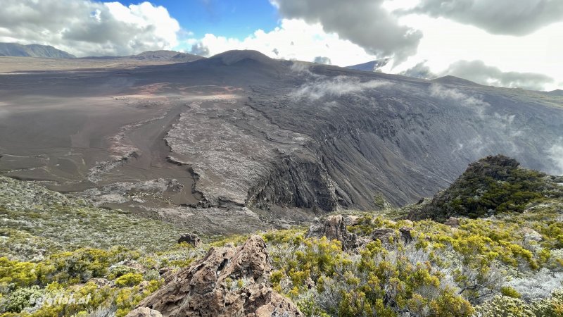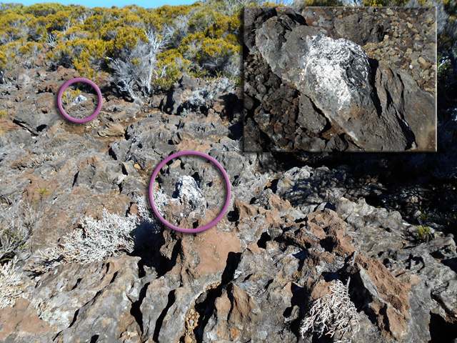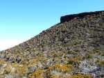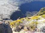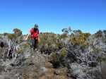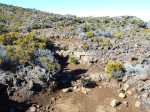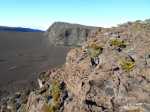 C'est le début du hors sentier, qui, paradoxalement, va s'avérer le plus agréable de la boucle. La végétation est parfois rabougrie (Photo 18), parfois inexistante et rarement touffue (Photo 19). Comme toujours dans ce type de marche, prendre au hasard du sol en se fixant des objectifs visuels. Ici, c'est le Piton Rouge des Remparts qui sert de repère et de cible. La trace ci-dessous semble zigzaguer dans plusieurs directions. Elle reflète simplement les dizaines de petits détours pour éviter des plantes. En suivant à la lettre cette trace, testée pour l'occasion, on est certain de revenir au véhicule sans une égratignure, donc en préservant les plantes. Le rempart qui domine le Piton de Colignet et le Bras Caron n'est pas dangereux et offre de magnifiques points de vue sur la vallée (Photo 17). On peut donc le frôler sans danger. Prendre son temps à la traversée de la Ravine Germeuil pour la visiter et dénicher des petites merveilles de la nature rarement observées ailleurs comme ce dolmen naturel (Photo 20) ou ces plaques empilées dans le fond. Il faut faire un détour par la droite pour descendre dans le lit mais il permet de se balader dans des zones totalement vierges (Photo 21). A partir du dolmen, filer tout droit vers le Piton Rouge des Remparts (Photo 22). La végétation grandit un peu mais les espaces vides sont toujours là. Au pied du piton, remarquer cet empilement de larges plaques tombées au cours des siècles (Photo 23) et ne pas chercher à remonter vers le sommet. On serait de toute façon bloqué au rempart infranchissable. Contourner le piton et viser désormais le Puy du Pas des Sables qui sert de nouvelle cible même s'il dépasse peu de la végétation (Photo 24). On peut passer n'importe où en évitant les branches. Des vieilles bombes volcaniques gisent parfois au sol (Photo 25). L'escalade s'effectue en deux étapes et on arrive au sommet en moins de 20 minutes pour apercevoir la route forestière et les véhicules allant au Pas de Bellecombe. S'il y a de l'eau dans le cratère, c'est mieux mais en son absence, le spectacle est aussi agréable (Photo 27). Faire le tour par la droite et rejoindre le Pas des sables en cherchant le meilleur passage dans le même type de végétation que précédemment.