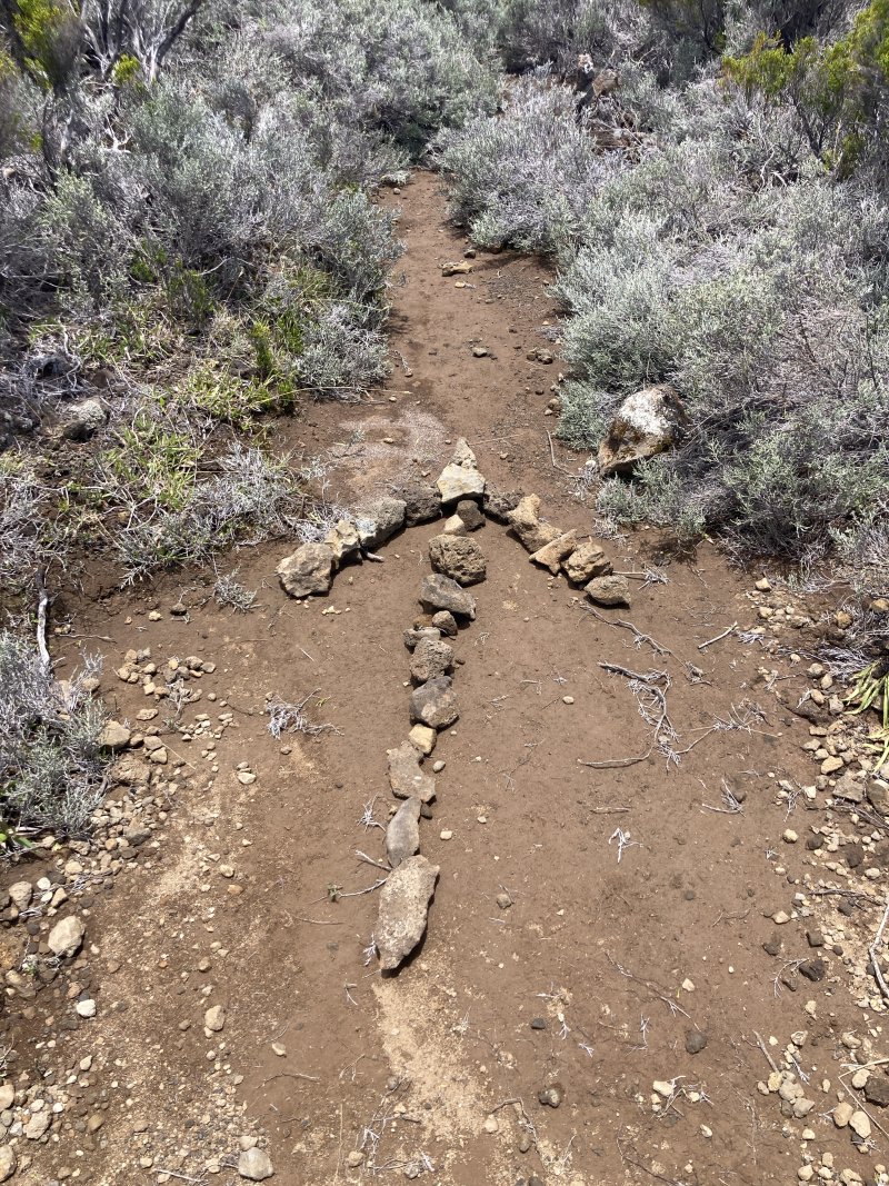 Ce sentier, encore marqué sur la carte d'un très discret trait noir, se suit sans problème si on en trouve le départ et qu'on repère les balises régulièrement espacées. A l'époque, ce magnifique sentier comportait des centaines de tâches de peinture blanche pour éviter de s'égarer par temps de brouillard. Recouvertes de peinture noire à l'édition du premier arrêté de fermeture, les balises étaient censées avoir disparu. Seulement, la peinture noire employée, de moins bonne qualité que la blanche, a été détruite par les UV et les balises grises qui demeurent sont presque aussi faciles à suivre que sur n'importe quel sentier officiel. Le plus délicat est donc de trouver la première tâche grise à mi-parcours de la descente. Une fois cette vieille balise repérée, il suffit de marcher les yeux au sol et on arrive à l'éboulis sans hésitation. Plus loin, après l'éboulis, elles sont plus rares mais des cairns ont été régulièrement élevés, même si certains sont discrets.