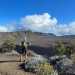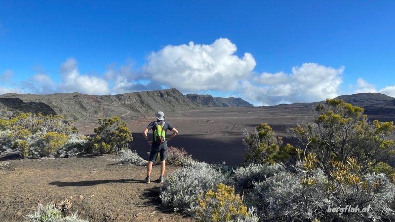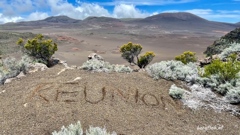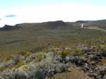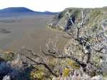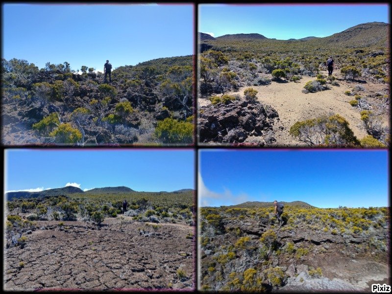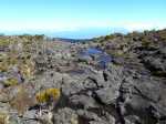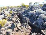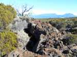 La randonnée débute au Pas des Sables où un parking attend les visiteurs qui s'empressent de monter au petit belvédère afin de photographier la Plaine des Sables sous toutes ses coutures. Ne pas hésiter à s'y rendre, mieux, emprunter sur moins de 100 m le sentier de l'Oratoire Ste-Thérèse pour une vue d'ensemble beaucoup plus profonde. Partir calmement sur les plaques de lave puis sur le sentier de bord qui chemine, tantôt sur des petits lapillis glissants ou sur des cailloux de lave (Photo 1). Certains arbres morts créent déjà de belles natures mortes (Photo 2). On domine la Plaine des Sables pour une bonne heure et on se régale déjà de la vue du Chisny qui cache à peine le Piton de la Fournaise (Photo 3). Le sentier ne s'éloigne jamais de plus de 30 mètres du bord. Dans l'ensemble, les obstacles et les hautes marches sont rares et la randonnée est agréable, surtout que la pente est insignifiante. La végétation est la plus haute de toute celle qu'on traversera au long de la matinée. Elle est constituée presque exclusivement de branles, petits tamarins des hauts, ambavilles et fleurs jaunes (Photo 4). Au pied du morne, commence le grand cassé minéral créé par une coulée spectaculaire qui s'est figée jusqu'à la prochaine éruption (Photo 5). En cherchant bien, on devine le sentier qui redescend vers Grand Pays et Grand Galet. Ne pas manquer l'arche naturelle et la première grotte à gauche du sentier avant d'arriver à la grande grotte, marquée sur la carte d'un point noir, pouvant abriter plusieurs personnes (Photo 7). Plus loin, le sentier commence à descendre en direction des antennes qu'on aperçoit au loin. Au point de vue, les paysages sont impressionnants vers Grand Pays, Grand Coude, Grand Galet et la côte (Photo 9). La première partie, la plus facile est terminée.