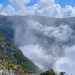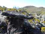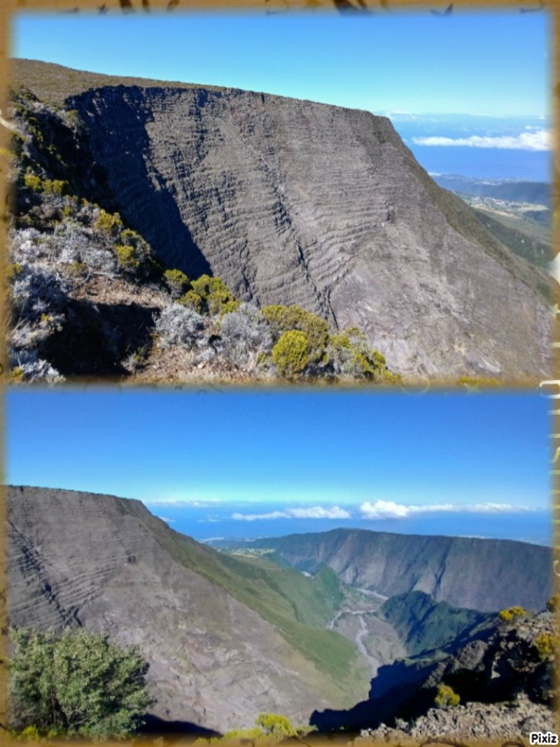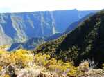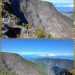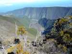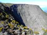 Commence alors une traversée du Morne du sud au nord sur un ancien sentier assez facile à suivre (voir § ci-dessous). La descente débute au poteau de l'ONF à 50 mètres du point de vue. Le sentier, un peu abrupt est encore en très bon état (Photo 10). Profiter des magnifiques nouveaux points de vue sur le Piton des Neiges à l'horizon (Photo 11) ou vers le Sud et la Rivière des Remparts qu'on domine (Photo 12). Attention, à mi-parcours, il faut obliquer à droite alors que des traces et des vieilles rubalises indiquent des passages pour se rendre à Grand Coude. Le terrain, peu végétalisé par endroits est très rocheux (Photo 13). Débuter sur l'ancien sentier repérable aux premières taches grises (Photo 14). Revenir sur ses pas si, au bout de 20 mètres, on n'a pas vu de balise au sol pour reprendre à la dernière trace de peinture. Au grand éboulis, entouré de failles et dangereux, s'éloigner du bord en traversant la végétation sur 2 ou 300 mètres afin de gagner en sécurité et en sérénité. Pour une fois, en voyant les dégâts (Photo 15), on comprend la raison de la fermeture du sentier. On est tellement habitué à marcher sur des sentiers fermés officiellement et sur lesquels on ne repère rien le justifiant, qu'on est un peu honteux d'enfreindre la règle. Plus loin, le sentier devient moins dangereux quoique proche du vide. On peut ainsi jeter un coup d'œil sur le fond de la vallée jusqu'à la cascade de Mahavel et tenter d'imaginer un pan de falaise de plusieurs millions de tonnes descendre ces centaines de mètres. Poursuivre sur le sentier qui fait un virage à angle droit vers la droite et rejoint, 250 mètres plus loin, le sentier vers la Caverne de Cotte. Peu de difficulté pour trouver cette grande cavité ombragée qui peut contenir une dizaine de personnes sans problème (Photo 16). La deuxième partie de la boucle, sur sentier oublié prend fin à la caverne. Il est temps de rentrer pour ceux qui n'aiment pas le hors sentier, même sans danger.