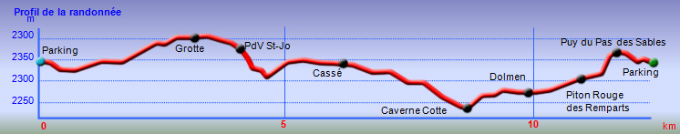Se rendre à Bourg Murat et rouler jusqu'au Pas des Sables par la Route Forestière du Volcan - Se garer au Pas des Sables et utiliser la totalité du sentier du Morne Langevin - Au point de vue, descendre par l'ancien sentier et obliquer à droite pour rejoindre la Caverne de Cotte - A la caverne, partir en suivant le rempart jusqu'au Piton Rouge des Remparts - Obliquer en direction du Puy du Pas des Sables et grimper au sommet pour observer le cratère - Redescendre plein sud et rejoindre le parking du Pas des Sables.