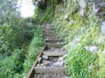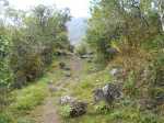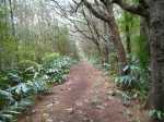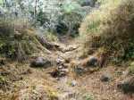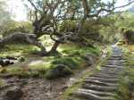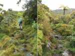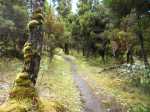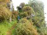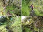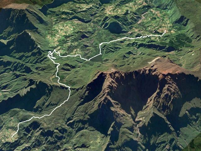 La randonnée débute à la chapelle de la Nouvelle, un édifice composé de deux toits touchant le sol à quelques mètres de la petite cloche fixée sur un trépied. Le sentier caillouteux passe au plus près du cimetière, tout aussi empierré et monte vers le départ du Chemin Charrette (Photo 1). Des grognements de cochons se font entendre sur la gauche et ne semblent pas gêner les vaches qui paissent. Au Plateau Rose, laisser le croisement à droite vers le point de vue sur la Nouvelle et poursuivre jusqu'à une jolie clairière. Poursuivre sur des montées de plus en plus fortes avec marches de bois vers la fin du Chemin Charrette (Photo 2). Les premiers tamarins font leur apparition. Une échelle en bois marque le début de la Plaine des Tamarins (Photo 7). Il y en a partout, tous aussi beaux les uns que les autres (Photo 9). Le sentier est le plus souvent à plat ce qui explique les zones boueuses car la pluie ne peut pas s'écouler (Photo 11). Des planchers en rondins de tamarins sont censés éviter cette boue mais des sentiers étroits sont creusés de chaque côté par les multiples passages (Photo 12). On laisse encore le sentier de droite qui file vers Marla et on poursuit sur les caillebotis ou zones boueuses sur quelques centaines de mètres. Des zones marécageuses sont recouvertes de joncs jaunissants du plus bel effet (Photo 10). Le Gros Morne derrière les Tamarins crée de splendides paysages. Les bois au sol disparaissent et sont remplacés par des cailloux alors que le sentier commence à monter (Photo 13). Prendre le premier embranchement sur la droite vers le Col de Fourche. Le sentier est étroit et pierreux au début puis s'élargit par la suite en montant toujours fortement et régulièrement (Photo 14). Lorsqu'il devient plus plat, la marche s'effectue dans d'épaisses couches de boue ! On atteint le col en moins de 30 minutes pour profiter de belles vues sur la Plaine des Tamarins et le Col des Bœufs à 400 mètres de là, à vol de tec tec. Profiter également des remparts de Mafate, de Marla jusqu'aux Orangers. Les fushias ont tout envahi (Photo 16). Certes la fleur est belle mais cet envahissement peut tout de même inquiéter tant il est rapide. La descente peut débuter (Photo 17). Elle est immédiatement abrupte et constituée par endroits de hautes marches bétonnées. Un T shirt symbolique est là pour rappeler la mort d'un concurrent du Grand Raid et le danger que représente la descente si on ne prend pas garde sur cette pente à 45% (Photo 18). Ce tronçon est heureusement de courte durée et on poursuit la descente par de longs lacets sans difficulté sur la terre, dans les herbes ou parmi de grosses roches. On a de très belles vues sur la forêt de cryptomérias qu'on ne tardera pas à rejoindre (Photo 19). C'est un moment aussi magique que la traversée de la Plaine des Tamarins. Les arbres très hauts procurent une ombre agréable et le soleil crée des couleurs splendides sur les mousses, les troncs ou les grands branles qui poussent entre les conifères (Photo 21). Le sol humide peut être glissant parfois, voire boueux par temps de pluie. Quand ces arbres disparaissent, les longoses les remplacent sur des surfaces impressionnantes. On rejoint la route du Col de Bœufs mais le sentier se poursuit. Les longoses ne diminuent pas malgré de hautes herbes le long du sentier qui monte et descend souvent mais jamais suffisamment pour créer de la fatigue (Photo 23). Il faut se préparer à affronter le goudron jusqu'au Bélier par de longs lacets qui n'en finissent pas. Remarquer les longoses qui on envahi les flancs du Morne de Fourche jusqu'à des hauteurs difficile à deviner. Tourner à droite pour pénétrer dans le village et marcher jusqu'à l'ancienne chapelle délabrée et squattée. Prendre à droite et trouver facilement la suite du GR qui passe dans les champs de chouchous. Il monte et descend sans cesse au gré du relief ou des petites ravines à franchir. Les filaos deviennent de plus en plus nombreux et la marche peut s'avérer glissante sur les tapis d'aiguilles. Après une descente, le sentier longe des cultures de Camp Pierrot puis se transforme en une large piste donnant de jolies vues sur le Gros Morne. Cette piste se termine d'un seul coup et se transforme en sentier qui sera la plus forte descente de la journée. Lacets très courts et cailloux imposent de vérifier la position des pieds. La plongée se termine à la Rivière des Fleurs Jaunes qui se passe facilement à gué entre de petites cascades très agréables. Remonter un peu la rivière pour voir une chute double un peu plus haute que les précédentes. Plus loin, le sentier du Col de Fourche remonte vers la droite mais on poursuit en longeant la Ravine de Grand Sable. Le nouveau gué est plus délicat à franchir et il vaut mieux avoir un bâton comme troisième patte. Une courte montée dans les filaos permet d'atteindre le Grand Sable pour une traversée ombragée. D'un côté des arbres de grande taille, de l'autre de jeunes plantations et des roches partout (Photo 25). A gauche, un monument attire l'attention sur les 63 personnes emportées par un immense éboulis. Un sentier part sur la gauche mais il faut avoir du temps car Hell Bourg est encore loin. Après une courte visite à l'abri vieillissant de l'ONF, le sentier chemine entre les filaos vers la Mare d'Affouches qui sont petit à petit remplacés par de hautes herbes. Le sentier, large au départ, se rétrécit et descend de plus en plus raide vers le petit village isolé. Certains passages peuvent être glissants. Magnifiques vues sur le Piton d'Anchaing, un peu gâchées par la ligne haute tension. Après l'îlet, le sentier a été remplacé par une large piste chaotique abîmée chaque jour par les 4x4. On atteint la passerelle sur la Rivière du Mât avant d'entamer la dernière forte montée sur les cailloux du sentier. Au parking, on ne peut pas dire que la traversée est terminée car il faut
