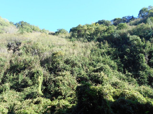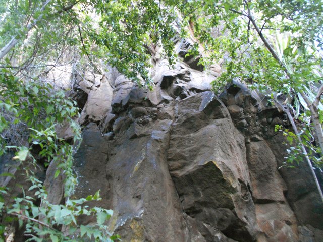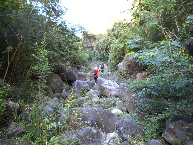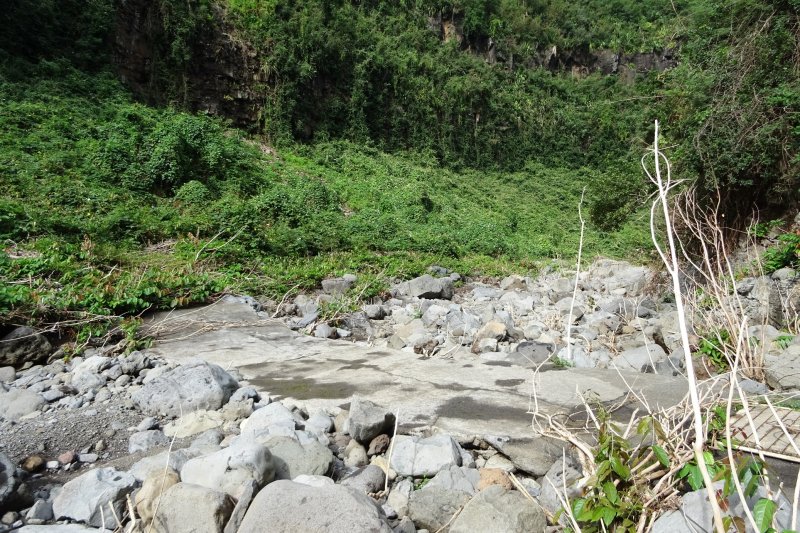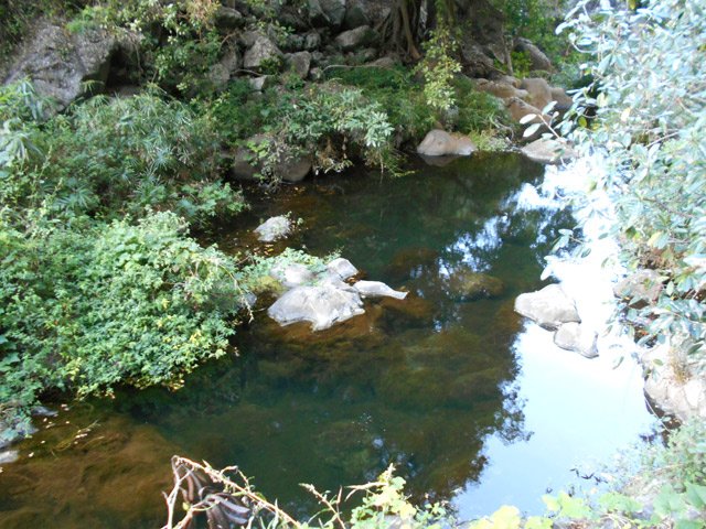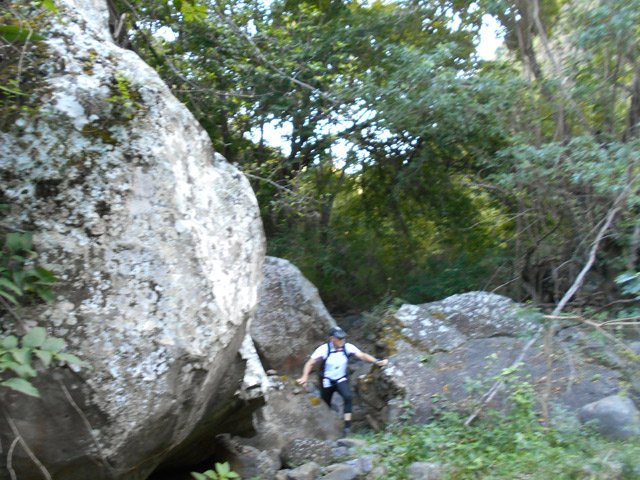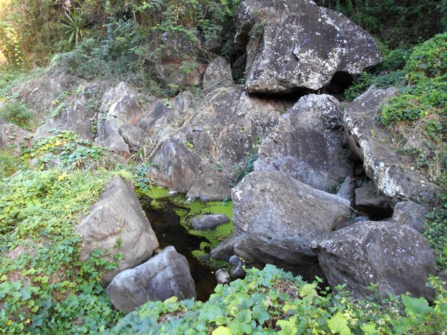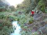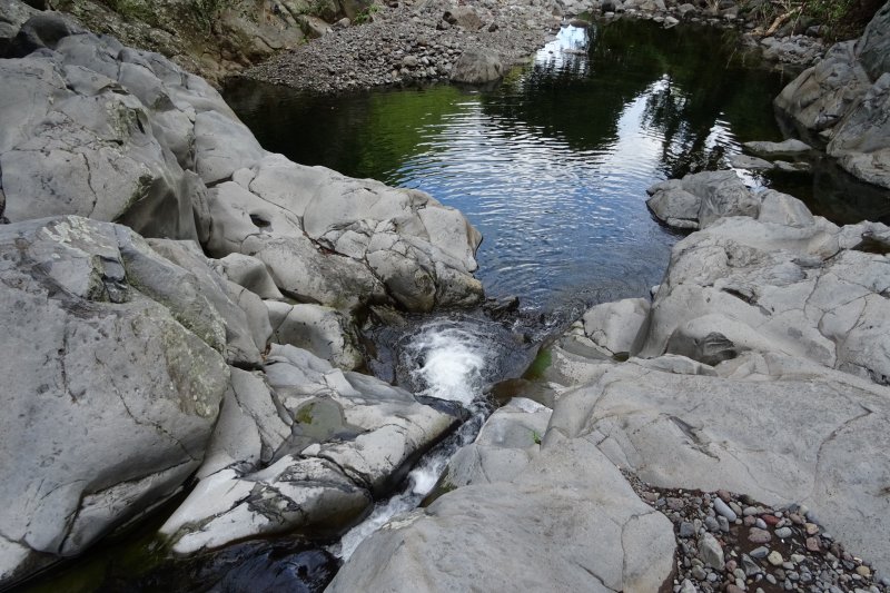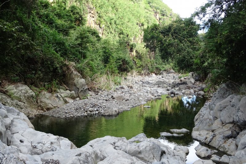 La randonnée débute au carrefour de la route de Maison Rouge, juste après avoir franchi le radier sur la ravine du Gol. Une piste en terre part près d'une zone qui fut un temps un jardin paysager mais qui mériterait un sérieux ravalement. La balade d'échauffement (Photo 1) se termine rapidement et la piste se transforme en sentier (Photo 2). Vu sa largeur et la qualité, on se dit que la remontée de la Ravine Barrage ou Ravine de Maison Rouge, sera un plaisir. Le sentier remonte le fond de la ravine en s'approchant de véritables murailles de tôle ondulée derrière lesquelles les bêlements et caquètements renseignent sur l'utilité de ces clôtures. Très vite, la trace s'estompe puis disparaît et la remontée s'effectue en cherchant des yeux le meilleur passage ou les quelques traces laissées par les chasseurs de guêpes. Peu de difficultés car la végétation est assez clairsemée et les rochers rarement très hauts. Quelques manguiers ont poussé aléatoirement en bordure de ravine (Photo 3). Les berges passent immédiatement du fond rocheux à des falaises infranchissables (Photo 5). La balade alterne partie plates, passages rocheux (Photo 6) ou végétalisés (Photo 7). A mi-parcours, des tuyaux indiquent enfin que l'eau peut exister en ces lieux arides puisque plusieurs tuyaux en mauvais état jonchent le sol (Photo 10). Plus haut, un bassin et un filet d'eau qui coule directement dans un gros tuyau explique en partie la partie sèche déjà parcourue (Photo 12). A partir de ce bassin, l'eau est toujours présente, soit dans des bassins croupissants couverts de lentilles d'eau soit sous les rochers où ils produisent cette douce musique aquatique. Sans transition, la végétation, déjà dense, bouche la totalité du fond de la ravine. La grotte en rive gauche, visible au bas d'une barre rocheuse dans un virage de la rivière s'approche au prix de quelques griffures (Photo 16) mais il est raisonnable de faire demi-tour alors qu'on est loin d'avoir atteint la route Hubert Delisle. La descente prend un peu moins de temps que la descente en tentant de reprendre le même itinéraire que dans la montée.