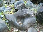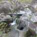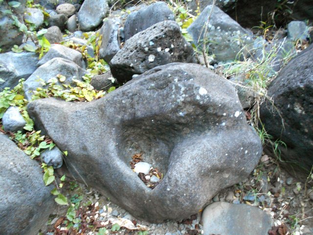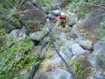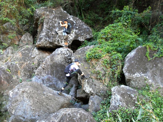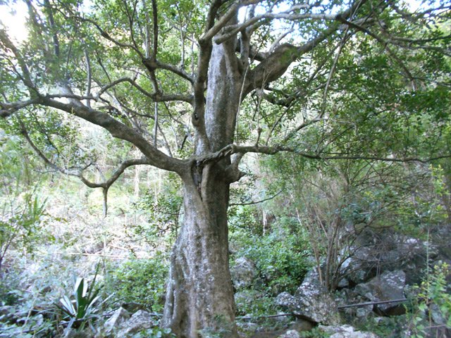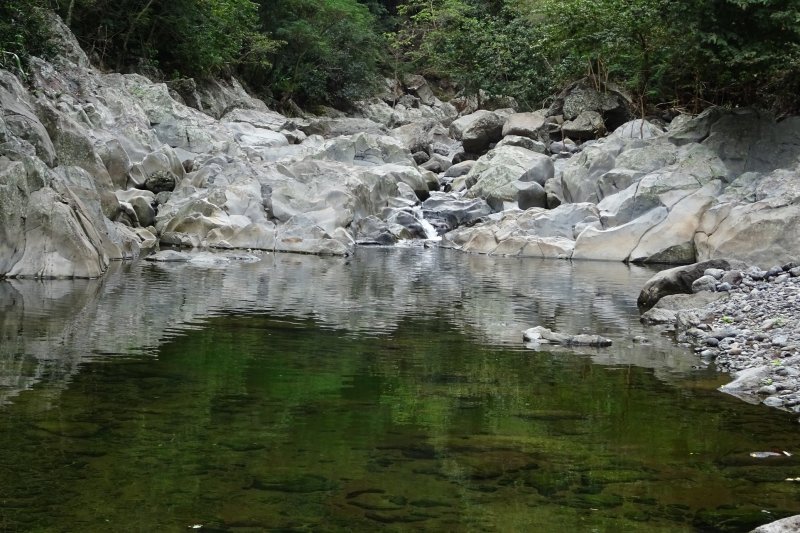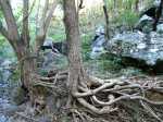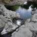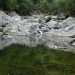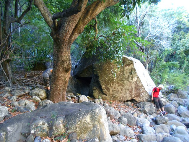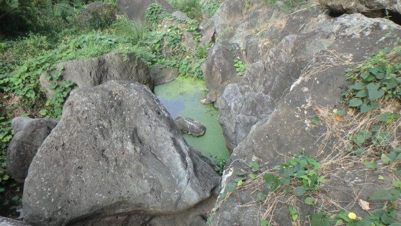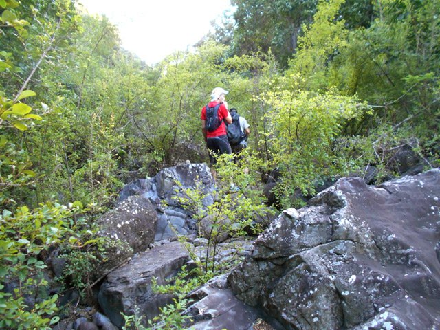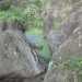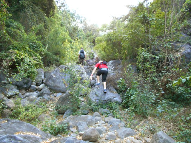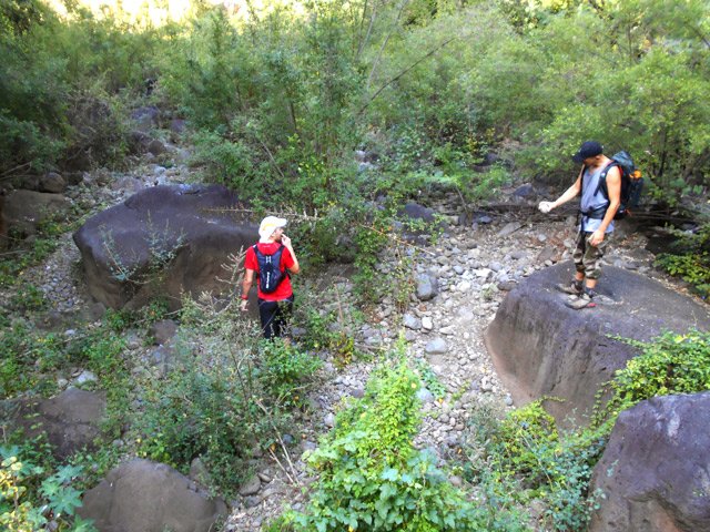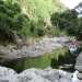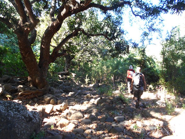 La randonnée débute au carrefour de la route de Maison Rouge, juste après avoir franchi le radier sur la ravine du Gol. Une piste en terre part près d'une zone qui fut un temps un jardin paysager mais qui mériterait un sérieux ravalement. La balade d'échauffement (Photo 1) se termine rapidement et la piste se transforme en sentier (Photo 2). Vu sa largeur et la qualité, on se dit que la remontée de la Ravine Barrage ou Ravine de Maison Rouge, sera un plaisir. Le sentier remonte le fond de la ravine en s'approchant de véritables murailles de tôle ondulée derrière lesquelles les bêlements et caquètements renseignent sur l'utilité de ces clôtures. Très vite, la trace s'estompe puis disparaît et la remontée s'effectue en cherchant des yeux le meilleur passage ou les quelques traces laissées par les chasseurs de guêpes. Peu de difficultés car la végétation est assez clairsemée et les rochers rarement très hauts. Quelques manguiers ont poussé aléatoirement en bordure de ravine (Photo 3). Les berges passent immédiatement du fond rocheux à des falaises infranchissables (Photo 5). La balade alterne partie plates, passages rocheux (Photo 6) ou végétalisés (Photo 7). A mi-parcours, des tuyaux indiquent enfin que l'eau peut exister en ces lieux arides puisque plusieurs tuyaux en mauvais état jonchent le sol (Photo 10). Plus haut, un bassin et un filet d'eau qui coule directement dans un gros tuyau explique en partie la partie sèche déjà parcourue (Photo 12). A partir de ce bassin, l'eau est toujours présente, soit dans des bassins croupissants couverts de lentilles d'eau soit sous les rochers où ils produisent cette douce musique aquatique. Sans transition, la végétation, déjà dense, bouche la totalité du fond de la ravine. La grotte en rive gauche, visible au bas d'une barre rocheuse dans un virage de la rivière s'approche au prix de quelques griffures (Photo 16) mais il est raisonnable de faire demi-tour alors qu'on est loin d'avoir atteint la route Hubert Delisle. La descente prend un peu moins de temps que la descente en tentant de reprendre le même itinéraire que dans la montée.