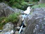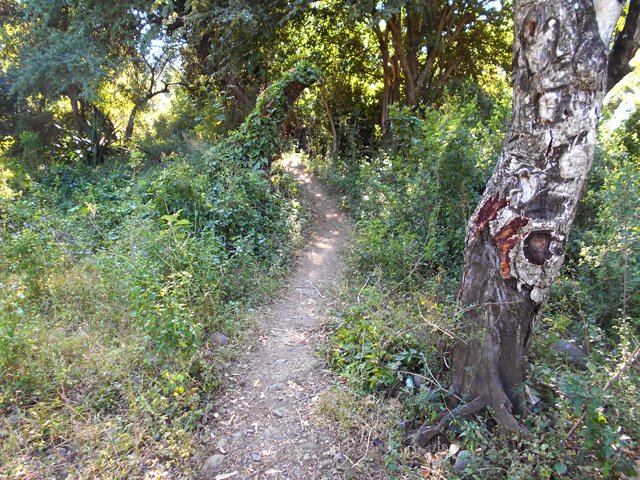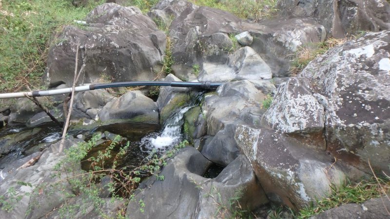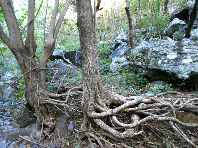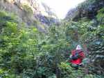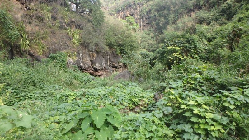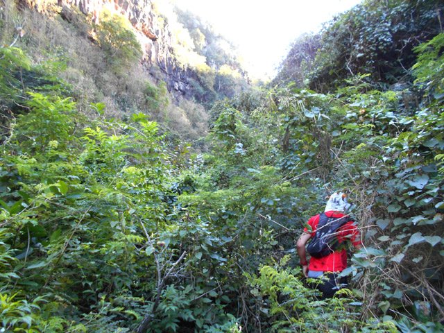 On est parfois à moins de 500 mètres de la Ravine Goyaves et ses multiples cascades alors que les bassins rencontrés sur cette ravine de Saint-Louis sont la plupart du temps à sec. Des tuyaux permettent tout de même d'approvisionner quelques élevages de volaille ou de cabris cachés derrière d'immondes plaques de tôle en début de parcours. Comme souvent dans les ravines, le cheminement s'effectue à l'instinct car il n'y a un véritable sentier que dans les premiers hectomètres. On chemine facilement malgré la végétation envahissante mais on est arrêté brusquement au niveau de la grotte par une multiplication de toutes sortes de plantes dont quelques galaberts épineux. Même muni d'un coupe-coupe, la sortie deviendrait trop aventureuse. C'est donc une courte portion de moins de 3 km qui est présentée ici pour les amateurs du genre. La liane papillon (Hiptage benghalensis (L.) Kurz) a déjà bien débuté son recouvrement végétal de toute la flore de la vallée. Même les manguiers centenaires seront bientôt recouverts et étouffés par cette liane contre laquelle il n'existe plus aucun moyen de lutte.