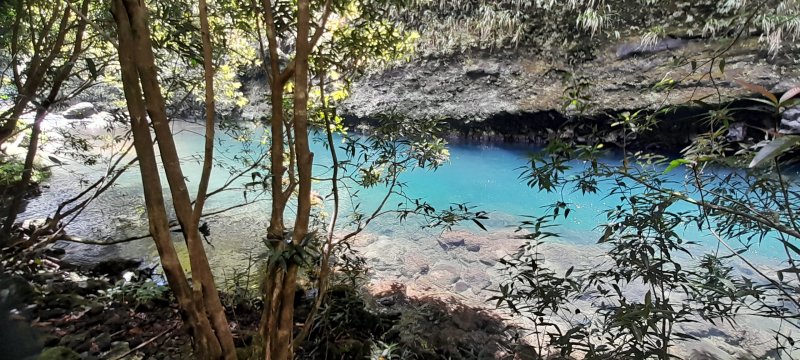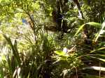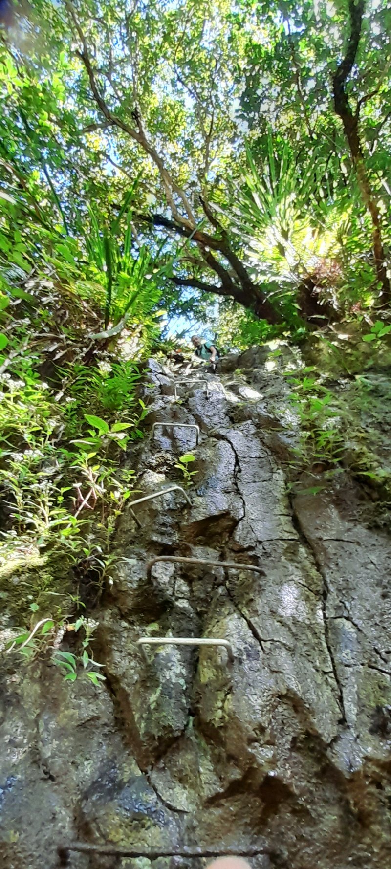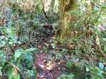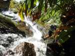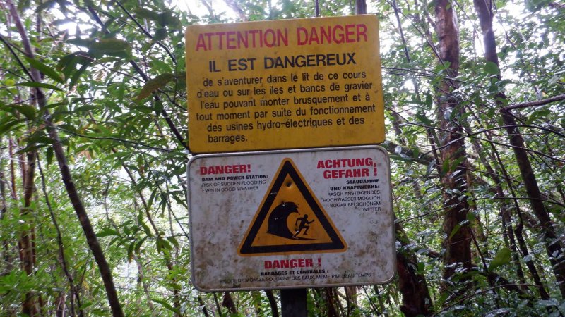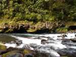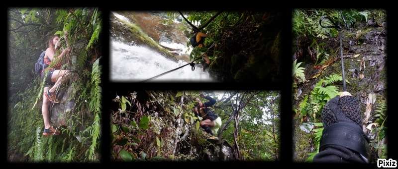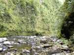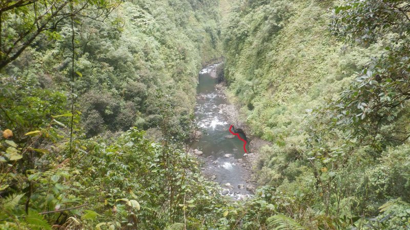 La randonnée débute au kiosque situé au départ du sentier qui mène des dizaines de familles au pied de l'avant dernière cascade de la Grande Ravine Photo 1). Sans faire de bruit, s'asseoir sur un banc sous le kiosque et guetter les lézards verts qui attendent l'insecte en se cachant entre la poutre et tôle de la toiture. Les jeunes sont moins timides mais les gros sont bien plus beaux. Partir sur la route en revenant vers Saint-Benoît. On trouve un emplacement pour stationner un véhicule à 200 m de l'entrée du sentier mais cet échauffement depuis le kiosque permet d'apprécier la route verdoyante (Photo 2). Après 600 m de marche, une trouée discrète dans les sabres et goyaviers indique le départ du sentier (Photo 3). On pénètre sous le couvert des goyaviers pour une marche facile sur les racines et la terre humide. Un panneau avertit du danger potentiel de la montée rapide des eaux. La descente réelle peut débuter. Le ton est vite donné par une forte pente qui ne cessera qu'à la rivière (Photo 4). Le sous-bois est agréable, le sentier toujours visible, les goyaviers sont partout et les racines omniprésentes (Photo 6). Ne surtout pas prendre de bâton et utiliser les centaines de troncs pour ralentir la marche lors des raidillons glissants. Des trouées dans la végétation permettent de voir l'aval de Rivière des Marsouins (Photo 7). Apprécier au passage l'énorme bois de rempart qui a poussé sur des rochers et crée par ses racines une vaste grotte. Quelques cordes de bonne qualité sont fixées aux arbres et facilitent grandement les passages glissants ou rocheux (Photo 5). Après plusieurs de ces obstacles, le terrain s'assagit mais sur une courte distance. La forêt est belle et certains spécimens de bois de couleurs ont réussi à atteindre de belles tailles (Photo 10). Après ce court repos, la pente reprend de plus belle, les cordes se multiplient, les bras travaillent autant que les jambes. Un passage rocheux vertical comporte des marches métalliques fixées par les canyoneurs. Elles reposent ainsi les bras déjà mis à rude épreuve. Après un dernier passage rocheux et glissant (Photo 11), on arrive dans les longoses qui entourent la dernière chute de la Grande Ravine (Photo 13). Un petit ruisseau coule vers le bassin et ce n'est pas la peine de chercher à éviter l'eau car bientôt, les pieds seront toujours dans le courant. La chute est haute et fine et représente une belle descente en rappel. Elle tombe dans un bassin qui se déverse dans la Rivière des Marsouins par une dernière cascade qu'il faudra longer pour atteindre le torrent qu'on voit très bien du promontoire (Photo 14). Les cordes sont là pour franchir les derniers mètres (Photo 15) mais il faut faire attention à la glissade qui pourrait s'avérer dangereuse. Une fois franchi ce dernier obstacle (Photo 16), on arrive sur la rive gauche de la rivière. Un grand bassin barre déjà le passage mais une trace discrète permet de le contourner en grimpant sur les rochers en rive gauche (Photo 17). La remontée reprend en alternant galets, sable, passage dans l'eau ou sur les berges boisées. (Photo 20) Après des traces de camping sauvage sous un rocher, on poursuit vers l'amont puis, après un coude de la rivière, le spectacle commence avec la cascade en ligne de mire (Photo 21). C'est déjà très beau et impressionnant mais pour s'en approcher, il faudra traverser la rivière un peu plus loin. Le courant est fort, les roches immergées extrêmement glissantes et on en vient à regretter le bâton resté dans le véhicule. Une solution consiste à repérer les rochers sous l'eau et y mettre les mains afin d'avoir trois ou quatre points d'appui. C'est trempé mais heureux qu'on parvient au pied de cette curieuse cascade entourée de deux grandes grottes issues de l'effondrement des orgues basaltiques qui l'entourent (Photo 25). Le spectacle est grandiose. D'autres chutes tombent d'un peu partout. A droite du canyon, admirer les orgues mélangées par de formidables forces telluriques et creusées par des cascades. La grotte de gauche peut s'atteindre en traversant la rivière et en montant sur la rive opposée mais on court le risque de déranger les salanganes qui volent par dizaines autour des chutes. La rivière vient de la gauche derrière un coude de la falaise mais il n'y a que peu d'intérêt de s'y rendre sauf peut-être pour apprécier le canyon étroit. Il n'y a pas à réfléchir pour le retour qui empruntera le même itinéraire que pour la descente. Comme souvent sur ces terrains escarpés, la remontée sera plus rapide que la descente.