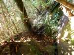Voici une très courte sortie mais qui demande une bonne condition physique pour profiter d'un des plus beaux endroits de la Rivière des Marsouins, qui en compte déjà beaucoup. Elle obtient 4 étoiles principalement pour sa cascade de fin de parcours et non pour le sentier lui-même qui est très difficile. C'est le dernier saut du Bras Sec dont les eaux viennent grossir la Rivière des Marsouins. Il y a 16 Bras sec à la Réunion. Celui-ci prend ses sources au Plateau de Marseille et ses eaux gonflent, alimentées par les Ravines Casse-Gueule, Bigarades et Mathurin. Le sentier est utilisé par les canyoneurs lors de leur remontée à la civilisation après les joies des descentes en rappel le long des hautes chutes que le randonneur se contente de regarder en rêvant. Si le Dieu des Canyoneurs a placé assez correctement racines et arbustes pour se hisser ou se retenir dans les descentes, certains de ses disciples ont efficacement complété les manques de la nature par de la solide corde à nœud. Certaines rassurent en cas de mauvaise prise, d'autres sont indispensables au franchissement de parties difficiles. La descente comporte trois parties : forte descente sur deux tiers du parcours, un replat très court qui suit la courbe des 350 m et une TRÈS forte et dangereuse descente pour rejoindre la première cascade proche de la Rivière des Marsouins. Une fois la rivière atteinte, la remontée vers la grande cascade est à la portée de tous ou presque. Une personne avertie en valant deux, ne pas oublier de lire la pancarte d'EDF qui signale que le courant peut monter brusquement en cas de lâcher d'eau de l'usine située en amont, 300 m sous-terre. Qu'il y ait lâcher ou non, le courant de la rivière est toujours fort, quelle que soit la période de l'année.