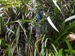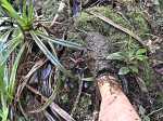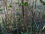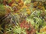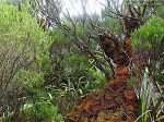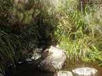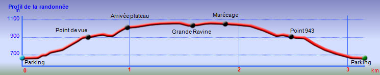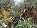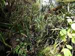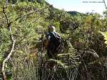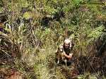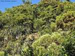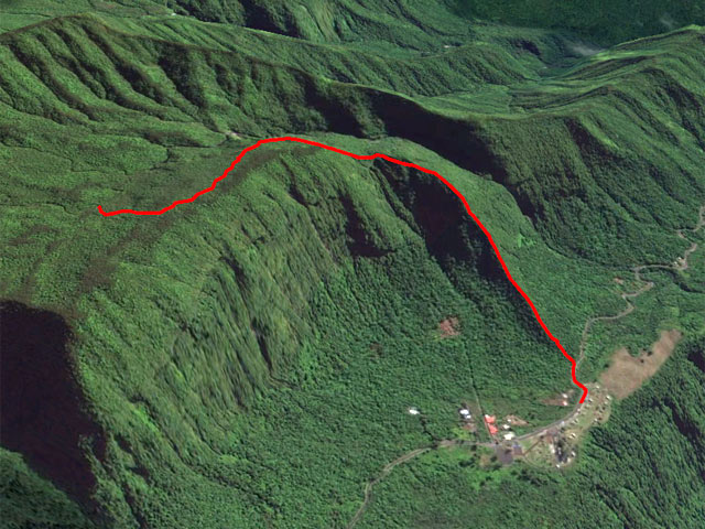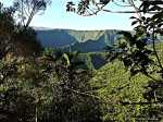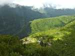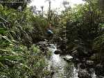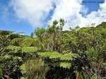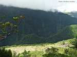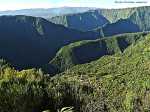 La randonnée débute par quelques dizaines de mètres de route en marchant sur le Chemin de Grand Fond vers Saint-Benoît. Quelques traces partent sous les goyaviers, créées lors de la cueillette des fruits. Une trouée plus importante que les autres se remarque de l'autre côté du fossé (Photo 1). La montée débute sous les goyaviers partiellement envahis de vignes marronnes mais heureusement de bois Noël donnant une petite touche colorée (Photo 2). Il faut se baisser sur la première centaine de mètres car les canyoneurs taillent rarement les sous-bois pour en faire des GR. Il faut d’ailleurs respecter cette habitude et laisser le sentier comme il est. Une fois passé ce court écueil, le sentier se suit sans problème en montant graduellement et régulièrement dans les goyaviers et quelques bois de couleurs. Il longe la ligne de crête qui devient parfois très étroite. Il faut se méfier de cette étroitesse et regarder où poser les pieds car le ravin sur le côté, bien que protégé de plantes, est très pentu. Les points de vue sont très rares ou masqués par les plantes (Photo 5). Un peu plus haut on a enfin une trouée qui permet d'embrasser toute la vallée du regard (Photo 7). La végétation est vraiment très touffue. Les fanjans dépassent des bois de couleurs non encore envahis de goyaviers (Photo 8). La montée se poursuit en direction du premier piton marqué sur la carte à 943 m. A son approche, le sentier part sur la gauche et évite le sommet par un contournement comportant quelques passages délicats. Les panoramas s'élargissent et le regard porte très loin (Photo 10). La végétation a déjà changé à cette altitude et les mousses, fougères et branles bordent le sentier étroit mais très marqué par les passages des canyoneurs depuis fort longtemps (Photo 11). Les sphaignes également ont envahi le parcours mais on fait tout pour ne pas les piétiner (Photo 13). Une courte descente amène à un col entre les deux sommets mais la remontée reprend aussitôt. Les sabres sont de plus en plus nombreux dans les bois de couleurs. Les mains s'avèrent utiles pour certains passages et deux cordes vieillissantes aident pour des passages courts mais raides. La montée n'en finit pas puis on commence à apercevoir de la lumière à l'approche du plateau qu'on découvre avec plaisir pour les jambes (Photo 15). On pense pouvoir marcher en se reposant mais c'est sans compter sur les sabres de près de deux mètres de long et les pimpins qui ferment le passage et les portions boueuses difficiles à éviter (Photo 16). Un peu plus loin, les pimpins se multiplient dans une zone relativement marécageuse. On a vite fait de remplir les chaussures d'une boue nauséabonde (Photo 17). On voit la vallée de la Grande Ravine sur la droite et on s'étonne de partir vers la gauche comme pour remonter vers les sources. Après une traversée de sabres le sentier repart enfin vers la droite. On se retrouve à un moment dans une petite clairière comportant des traces de tôle rouillée ; sans doute un ancien camp braco (Photo 19). Le sentier descend une dernière fois pour couper une petite ravine puis rejoint enfin la rive droite de la Grande Ravine (Photo 20). La rivière qui finit en cascade vers le PK12, est ici un ruisseau avec peu d'eau mais de gros rochers et galets. Les canyoneurs partent vers la droite vers la descente des cascades (Photo 21). Les randonneurs, eux, font demi-tour pour rejoindre par le même itinéraire l'aire de pique-nique de l'Ancienne Cité du Pk12. Le sentier comportant peu de dangers, il faut compter 30 minutes de moins pour la descente.