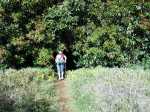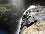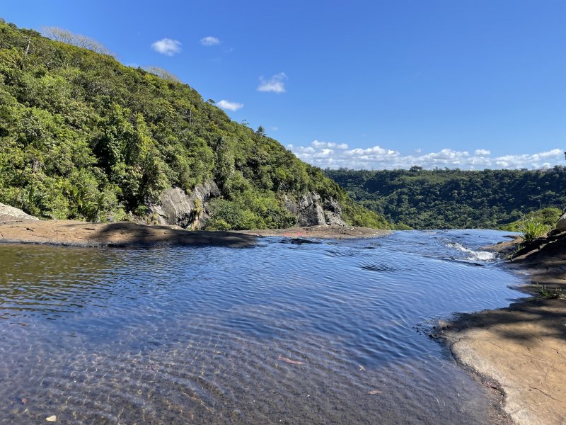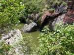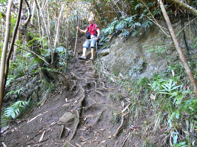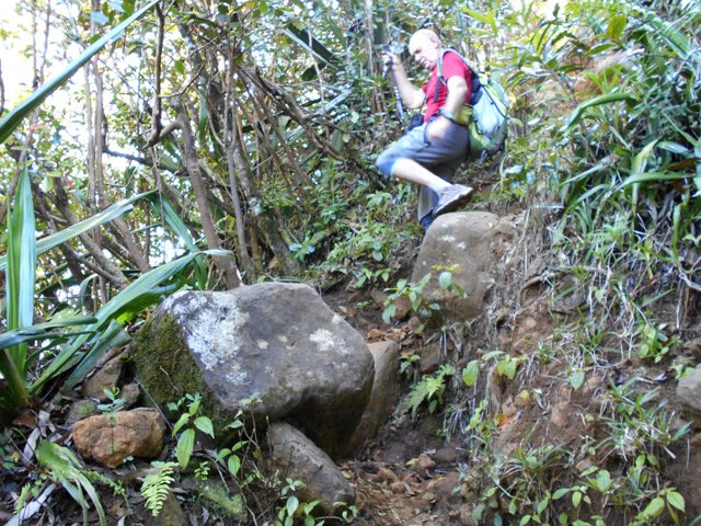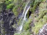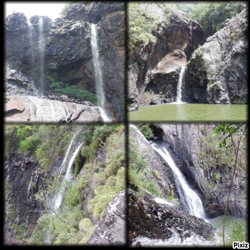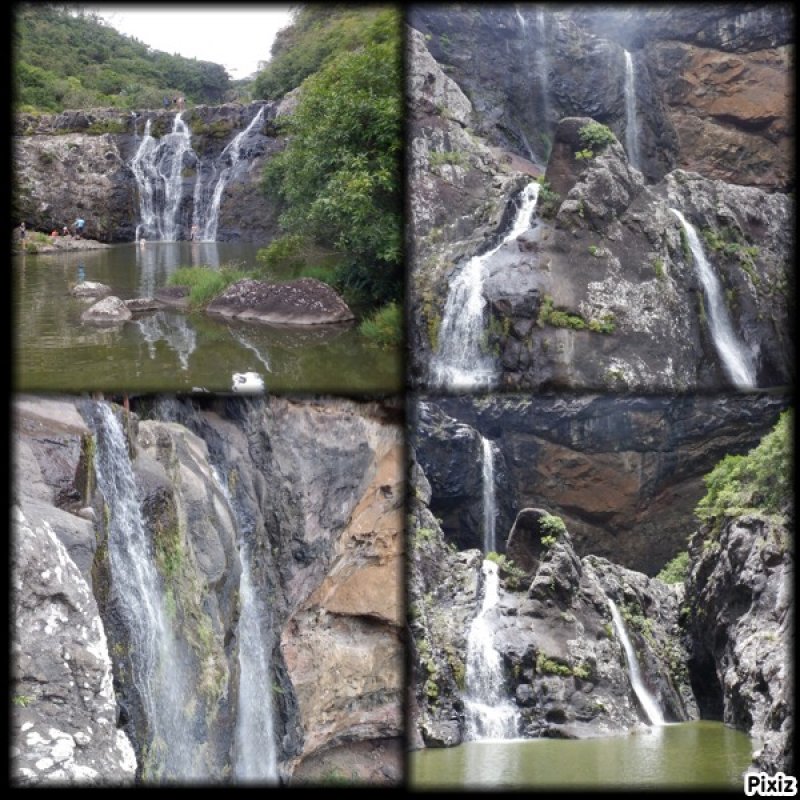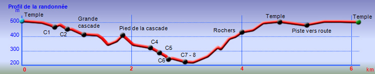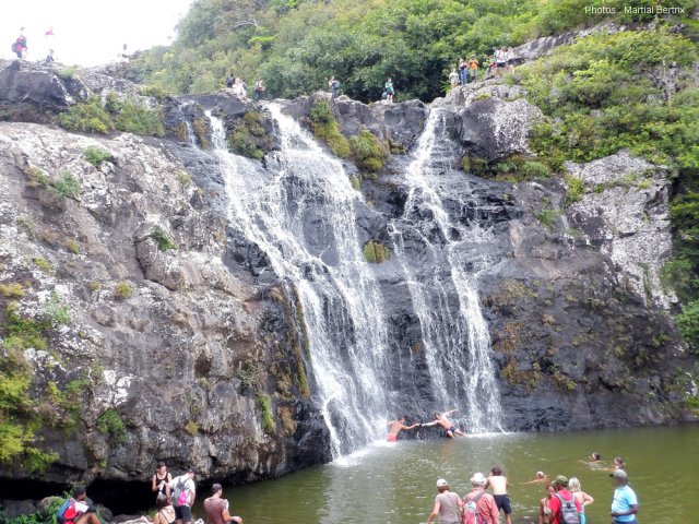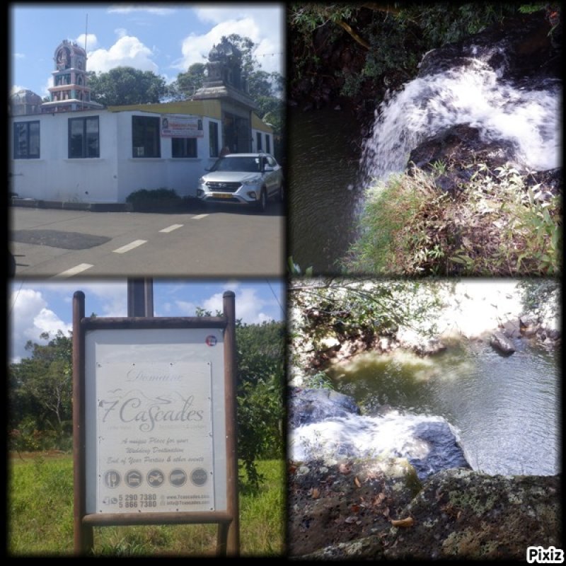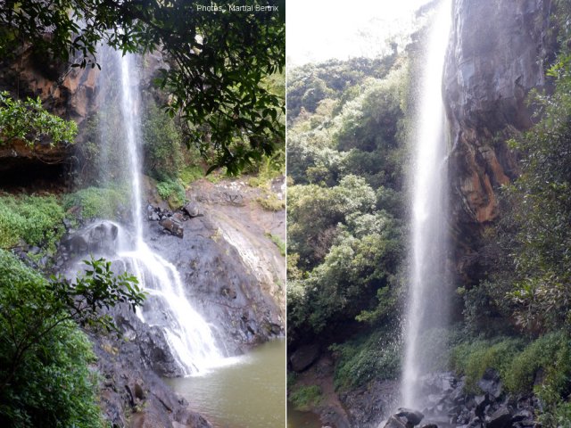 La randonnée débute à la fin d'une petite route de campagne qui file entre les champs de canne vers un restaurant portant logiquement le nom des Sept Cascades. Le départ est situé près du cimetière d'Henrietta et d'un temple vieillissant (Photo 1). Quelques mètres après le départ, un premier sentier étroit se dirige vers la rivière pour y découvrir un bassin sans grand intérêt. Revenir et poursuivre sur la piste entre les sous-bois et le grand champ de canne. Un sentier longe la piste sur la gauche mais il est de bien piètre qualité. Un peu plus loin, un autre repart vers la rivière en débutant sous le couvert des jamrosas (Photo 2). Il descend fortement et l'atteint rapidement. On se retrouve au sommet de la première cascade de la journée (Photo 3). Elle plonge dans un grand bassin, prudence exigée au risque de glisser. A partir de ce bassin qu'on domine, la descente va pouvoir débuter, parfois en rive gauche, surtout en rive droite en suivant des sentiers fréquentés assez faciles à deviner (Photo 4). Certains tronçons sont encombrés de roches ou comportent de courtes mais fortes pentes (Photo 5). On arrive à une haute chute plongeant dans un grand bassin (Photo 6). En suivant le sentier en rive droite on parvient facilement au pied de la cascade pour des vues bien plus impressionnantes (Photo 7). On longe par moments la rivière au plus près en empruntant les berges basaltiques (Photo 8). Il faut surtout cheminer en sous-bois où les racines peuvent être glissantes (Photo 9). Ne pas manquer les nombreux panoramas sur la rivière qui permettent de repérer bassins et cascades à venir (Photo 10). En suivant les sentiers proches de la rivière, on ne peut pas manquer les bassins qui sont parfois très fréquentés en fin de semaine (Photo 11). Très vite on ne compte plus les chutes d'eau qui sont espacées de courtes distances à parcourir sans danger (Photo 13). On arrive ensuite à une zone rocheuse percée de toutes parts par d'énormes marmites et deux arches naturelles pour des photos magnifiques de nature morte (Photo 15). Les cascades qui bordent ce lieu se visitent aussi tout comme les bassins pouvant servir à une baignade (Photo 16). Le sentier se poursuit en rive gauche et n'est pas évident à distinguer. Heureusement, les tâches de peinture sont efficacement réparties. Le sentier est alors un pierrier de roches moussues à l'ombre des jamrosas et goyaviers (Photo 19). Il rejoint la rivière près d'une nouvelle cascade qui coule sur la gauche et d'une autre venant d'un affluent en rive droite. Les deux chutes alimentent un très grand bassin. Il faut traverser la rivière, partir vers la deuxième chute et entamer une montée telle que celles déjà testées depuis le départ. On ne parle plus des roches, des marches de près d'un mètres (Photo 20), des racines, des nouveaux pierriers ou des parties glissantes mais on insiste sur les goyaviers et autres bois de couleurs judicieusement placés pour les mains. Nouvel arrêt près d'un bassin sur la gauche rempli par une fine chute et qui doit sa profondeur à une digue naturelle en basalte (Photo 22). Après cette forte descente, il faudra bien évidement remonter fortement en rive droite avant de descendre une dernière fois vers une nouvelle cascade que l'on dominera. Plus bas, c'est une succession de bassins et de chutes de toutes parts (Photo 21). Le spectacle est magnifique ainsi que sur le reste de la vallée vers l'aval. Quand on est sur la partie basaltique qui domine les bassins le lieu est impressionnant et peut intimider les personnes sujettes au vertige. Partir vers la rive gauche en suivant l'éperon rocheux du sommet pour trouver un sentier qui va très vite plonger vers le pied de toutes ces chutes. On est au milieu de la pente sur d'énormes rochers. Le spectacle est magnifique avec des petites chutes sur cinquante mètres de large (Photo 23). Cette descente se poursuit par un sentier en rive gauche et se termine à une dernière et fine cascade qui coule à l'ombre des grands arbres. On a du mal à apercevoir celle qui se jette dans le bassin entouré de plantes aquatiques en rive droite (Photo 24). Le sentier passe en sous-bois moussu (Photo 25), se rapproche de la rivière au moment où les eaux disparaissent sous les rochers. Le gué est facile à passer pour se retrouver dans le même sous-bois en rive droite. La randonnée, sportive jusque là, devient un plaisir à l'ombre des grands arbres qui poussent près de la rive (Photo 26). Un bruit fracassant d'eau annonce l'usine hydroélectrique avant d'en apercevoir l'important débit qui se jette dans le lit de la rivière. Le sentier à plat se termine. Prendre celui qui monte près du bâtiment et remonter la totalité du rempart par un cheminement en pente lente et régulière. Des arbres centenaires aux troncs impressionnants bordent ce large sentier pavé par endroits. Il se rétrécit près de quelques barres rocheuses et on profite en fin de montée de magnifiques panoramas sur le fond de la ravine, l'usine et même le lagon du côté de Flic en Flac (Photo 27). C'en est fini de toutes les difficultés. Le sentier débouche sur une route près d'un nouveau temple et d'un point de vue aménagé pour les touristes non randonneurs. Emprunter la route en direction du point de départ. En arrivant au point de stationnement des bus il est possible d'emprunter la route du cimetière, cependant une piste longeant les cannes à sucre permet de retrouver celle quittée en début de boucle. On passe près d'un ancien kiosque de pique-nique délabré et envahi d'ordure mais pour un point de vue d'anthologie sur le parcours réalisé qui prendra bientôt fin (Photo 28). La fin est facile à trouver en se repérant grâce au mur d'enceinte du cimetière ou du temple tamoul.