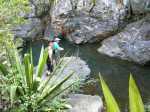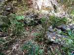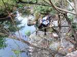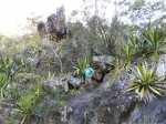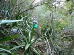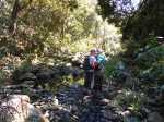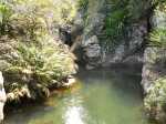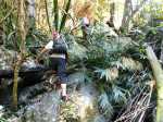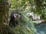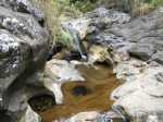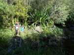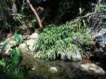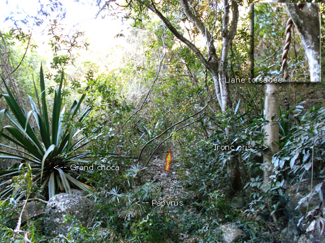 Si on choisit de passer par le Parc du Gol pour effectuer cette boucle il est fortement conseillé de repérer le sentier qui le rejoint lors de la remontée de la rivière. Quelques heures plus tard, avec la fatigue et les dizaines de bassins rencontrés, on est moins attentif. Veiller tout d'abord à se situer par rapport au parc en regardant la carte (et le GPS même si la trace zigzague un peu parfois). A cet endroit, la rivière est étroite et ne comporte pas de bassin. Des gros rochers recouvrent le fond (Photo 13). Repérer tout d'abord le grand choca de 3 mètres en rive droite près d'une petite touffe de papyrus. On distingue une trace partant vers le rempart. Un arbre au tronc gris (Je n'ai pas pensé à l'identifier !) pousse près des rochers de la rive. Un autre, tout proche, supporte plusieurs lianes dont deux sont entremêlées. Passer sous les lianes. Le reste de la montée est facile car le sentier est assez bien marqué jusqu'au palmier (genre dattier).