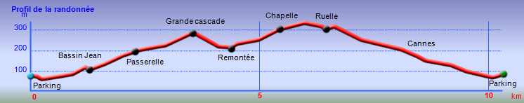 La remontée s'effectue en grande partie en rive droite ou de belles traces de sentier alternent avec des parties moins visibles ou des passages plus délicats. Quand le niveau de l'eau est faible, le parcours peut s'effectuer à même le lit de la rivière si le sentier a disparu. Si le niveau est plus important, il faut chercher un peu plus les passages. Inutile de préciser que ce parcours ne s'adresse pas aux randonneurs qui rentrent à la maison quand il n'y a plus de balises peintes sur les arbres et les rochers. Les griffures et quelques morsures de fourmis font également partie de la balade. L’intérêt réside bien sûr dans la découverte de nouveaux bassins ou chutes d'eau dont trois sortent du lot par leur taille et leur hauteur. Il y en a partout et il faut bien choisir son jour et partir lorsque les lâchers de l'usine sont plus importants afin de régaler les amateurs de photos. Quand il n'y a pas de délestage, on trouve tout de même de l'eau provenant des modestes sources qui, accumulées, offrent de petits filets d'eau comme ceux rencontrés le jour de la création de cette fiche.