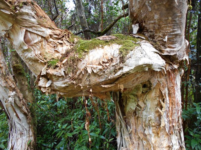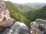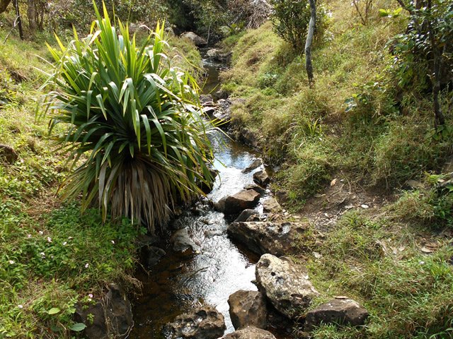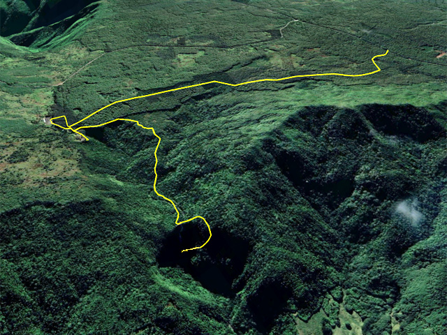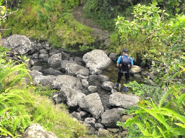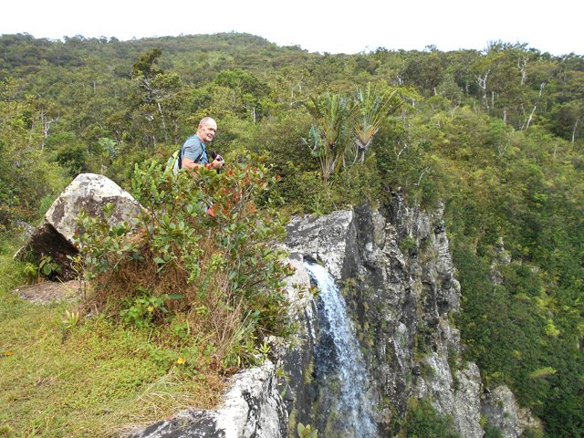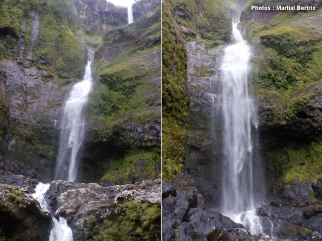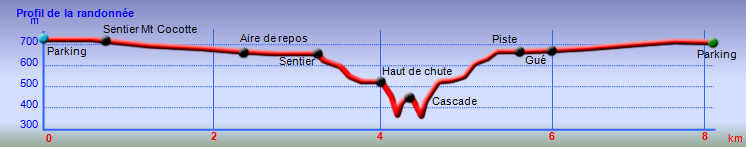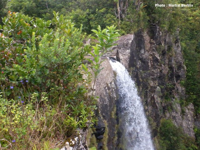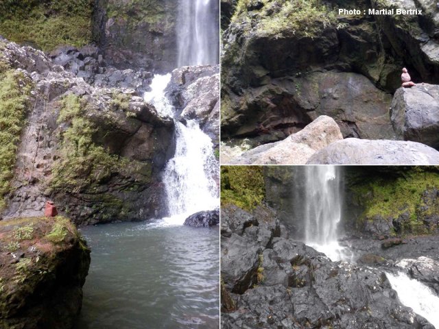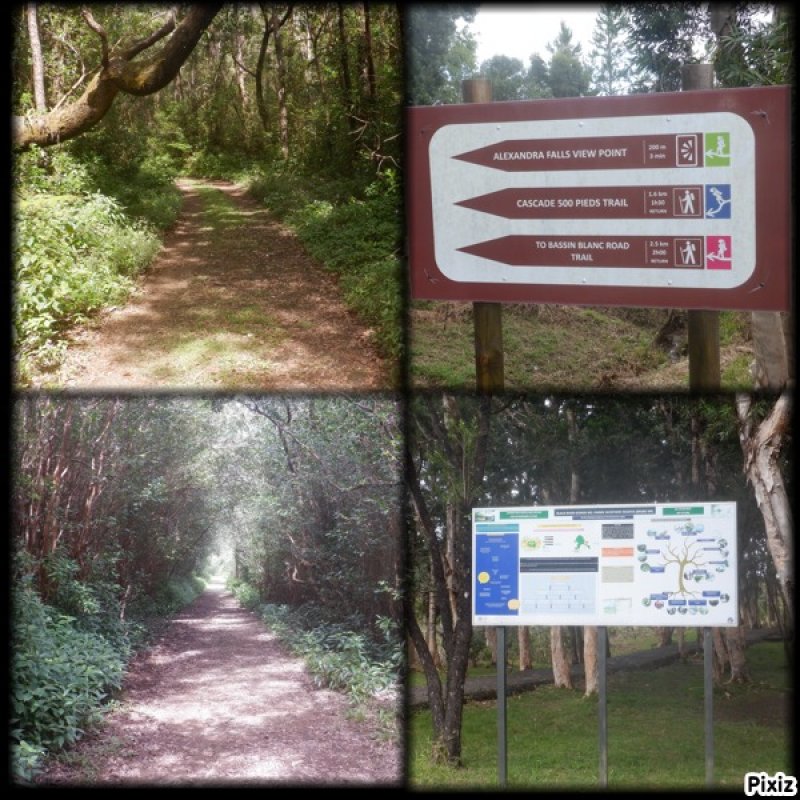 La randonnée débute à la piste située au pied du Piton Cocotte en roulant de Chamouny à Pétrin. Le randonneur peint en jaune annonçant un circuit pédestre est à terre mais il reste très compréhensible. Les 100 premiers mètres peuvent rebuter en raison de la boue ou des ordures jetées çà et là mais tout est oublié en découvrant la piste verdoyante (Photo 1). Le sol est plat pour une marche agréable sans l'herbe (Photo 2). Sur le côté, de magnifiques niaoulis poussent entre les pins et les eucalyptus (Photo 3). On traverse d'immenses plantations de pins, de cryptomerias et d'eucalyptus qu'on ne quittera pas jusqu'à la fin de la piste (Photo 4). Les goyaviers bordent également le parcours qui semble convenir aux singes qu'on aperçoit jouer parfois mais qui ont vite fait de fuir à la vue du randonneur (Photo 6). On coupe plusieurs petites ravines (Photo 7) avant de parvenir à une immense aire de pique-nique ou des dizaines de tables sont dispersées sous les niaoulis procurant une ombre agréable (Photo 8). Franchir un petit pont de bois au-dessus d'un minuscule ruisseau assez calme (Photo 9). En aval de la zone coule une rivière qui se jette par la Cascade Alexandra dans un précipice tout proche (Photo 10). On peut l'admirer en franchissant des passerelles au-dessus de l'eau ou en montant sur un promontoire surélevé offrant un large panorama sur la vallée et l'océan (Photo 11). Un sentier débutant près d'un petit cours d'eau remonte en rive gauche. On le traverse plus loin près d'une autre petite chute. il débute aussitôt après ce ruisseau et grimpe un peu à l'ombre des pins sur un terrain couvert de racines. Un peu plus loin, on chemine sur un magnifique sentier à plat, recouvert d'herbe courte et bordé de superbes bois de couleurs très variés (Photo 12). Les goyaviers prennent hélas rapidement possession des lieux (Photo 13). On pense que tout le sentier sera ainsi jusqu'à la cascade des 500 Pieds (Photo 14). On a quelque vues plongeantes sur la vallée arborée. Le plaisir est de courte durée car, sans transition, une descente s'amorce sur de grosses pierres humides où il faut se méfier de la glissade et se maintenir aux arbustes (Photo 15). Plus bas c'est la terre rouge lisse, la boue et les racines qui prennent le relais (Photo 16). La descente est parfois très forte et on arrive rapidement à une crête qui domine deux cours d'eau. La descente continue dans les mêmes conditions avant de se terminer à la Rivière des Galets (Photo 17). La rivière est étroite et un cairn marque le meilleur endroit pour la traversée (Photo 18). Le gué se franchit sans avoir à mouiller les chaussures qui ont quand même besoin d'être nettoyées de la boue (Photo 19). Après une forte pente pour sortir du lit, la descente reprend. On entend de plus en plus le bruit de la chute d'eau et on arrive rapidement sur le haut de la cascade (Photo 20). Le spectacle est grandiose vers la partie boisée de l'aval de la rivière ! On peut voir la première chute en escaladant les rochers en rive droite (Photo 21). Si l'on s'approche du bord on domine un vertigineux à-pic sans fond où plonge la cascade (de l'Exemple, des Galets ou de 500 Pieds). La falaise est verticale au départ puis se brise sur de nouvelles falaises rougeoyantes (Photo 22). PRUDENCE autour de la chute car les rochers sont lisses et le précipice proche (Photo 23 et 25). La magnifique vallée verdoyante est sauvage et l'on ne se lasse pas du spectacle (Photo 24). En cherchant en rive gauche, on aperçoit le sentier permettant d'entamer une difficile descente de la falaise. Les parties verticales se succèdent, facilitées par des cordes judicieusement placées aux nombreuses racines et troncs poussant à travers les roches glissantes (Photo 26). L'effort est soutenu, la prudence est de mise à chaque instant. Une fois parvenu 150 m plus bas, l'effort n'est pas terminé car on s'est éloigné de la cascade durant la descente. Marcher une centaine de mètres en direction des cascades qu'on devine au bruit. La récompense est à la rivière lorsqu'on parvient au pied de la chute pour en admirer les paliers repérés au sommet (Photo 27). Il est possible de s'approcher du pied de la plus haute en effectuant une courte escalade, là où se situait une échelle qui a depuis disparu (Photo 28). Reprendre le chemin inverse. La remontée vers le bord de la falaise est assez violent mais de courte durée sur la terre rouge lisse. On apprécie encore d'avantage la présence de ces cordes attachées aux arbres. Une fois au sommet, il ne reste plus qu'à parcourir à l'envers le sentier pris à l'aller puis rejoindre l'aire de pique-nique afin de profiter d'un casse-croûte bien mérité. Le retour par la piste est à nouveau un plaisir pour les yeux et les pieds où il est recommandé de marcher en silence pour surprendre les singes s'épouillant au milieu du chemin.