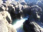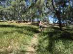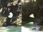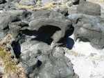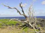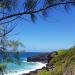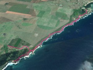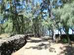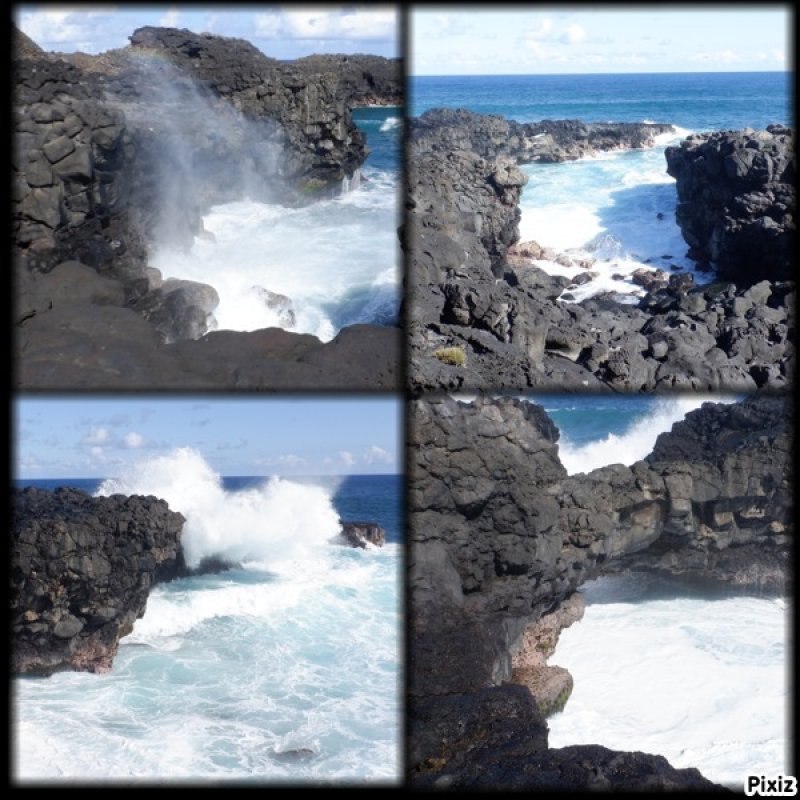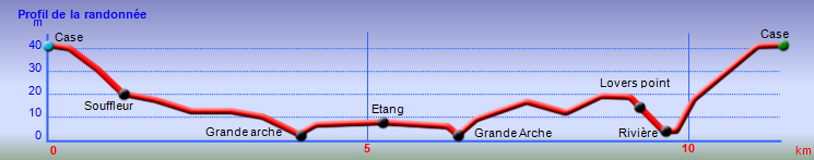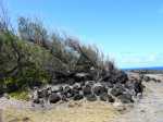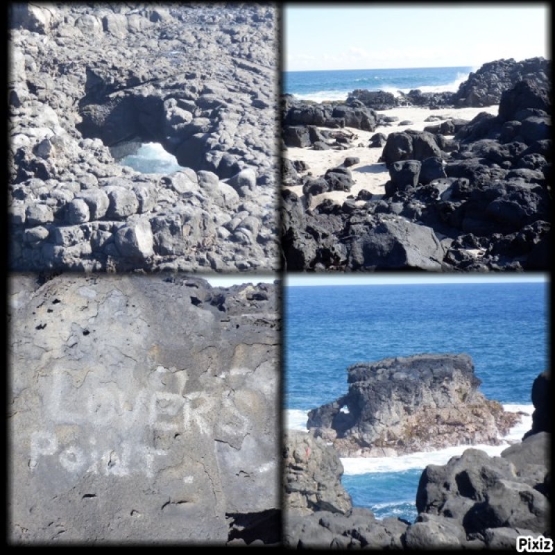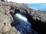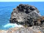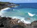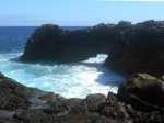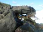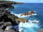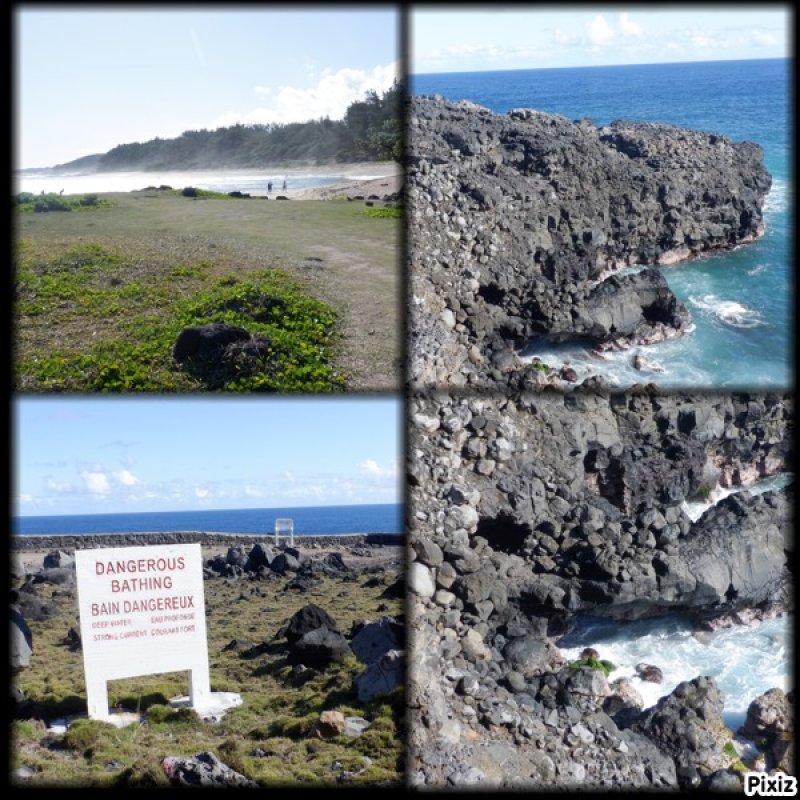 La randonnée débute au parking du Souffleur. La piste reliant la vieille case du hameau du Souffleur est cabossée et maltraite les véhicules. C'est donc un vrai plaisir de garer le véhicule sous les eucalyptus en début de piste (Photo 1) et de relier le bord de mer en marchant entre les murs de pierre sèche dressés de chaque côté (Photo 2). On parvient rapidement à une vaste aire sous les filaos. Le rocher d'où sortait le souffleur est facile à trouver derrière les rambardes bétonnées du belvédère (Photo 3). Partir sur la gauche de criques en caps rocheux, de souffleurs discrets en falaises abruptes pour se régaler du paysage. Attention sur les roches surchauffées dont les aspérités sont coupantes. L'érosion a sculpté des roches et leur a donné des formes parfois très originales (Photo 5). Remarquer les perroquets verts qui nagent en bordure de vagues à la recherche de nourriture. En fonction de la position du soleil, leur couleur vive se voit de très loin. Ne pas manquer également cette succulente poussant dans les embruns et supportant le sel, comme les lavangères à la Réunion (Photo 8). Après 1800 m de progression, on trouve une arche constituée de trois cavités dont l'une a la forme d'une colombe en vol (Photo 12). 600 m plus loin, la plus connue se remarque surtout aux touristes qui la chevauchent pour l'immortalisation photographique (Photo 14). Il y en a six autres à découvrir entre le Souffleur et la fin de la balade proposée. Plus au nord, une piste part vers les cannes près d'une digue artificielle proche d'une plage sauvage sans intérêt (Photo 20). Il est possible de poursuivre ; ne pas hésiter alors à marcher encore 500 mètres jusqu'au lac sur la gauche avant de faire demi-tour en empruntant cette fois la piste ou les sentiers pour plus de confort. Une fois arrivé au Souffleur on peut reprendre la piste bordée de murs puis rentrer ou poursuivre sur 500 mètres le long de la falaise pour découvrir trois autres arches naturelles dont une aussi jolie que celle visitée chaque jour par des dizaines de touristes (Photo 24). L'endroit sauvage, a été baptisé Lovers Point, inscrit sur un rocher avec un cœur (Photo 23). Plus loin, une petite rivière arrive en méandres (Photo 28) pour se jeter dans la mer près d'une longue plage très peu connue que l'on peut rejoindre par le début de piste partant du hameau du Souffleur. Revenir au Souffleur par la belle piste longeant de nouveaux murs et remonter sous les eucalyptus vers le véhicule.