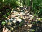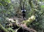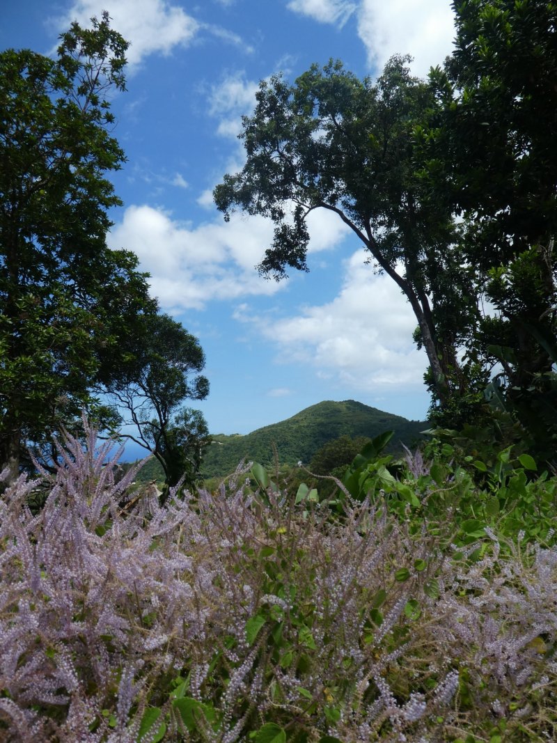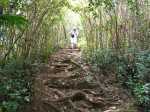 Fait ce jour sous une chaleur torride -35°- un ciel insolemment bleu!, et un sol sec. Montée régulière dans une belle forêt où s'agrippent partout des pieds de vanille en fleurs et de belles gousses.Puis l'océan de palmistes à l'approche du gîte, fermé ce jour.Montée assez raide après le gîte dans la forêt sombre de jamrosats et goyaviers. Descente tout le long de la ravine verte et moussue (et surtout sèche!) de Bras Plat:à faire pour de beaux clichés! puis arbres tordus,troués -bois maigre-racines photogéniques....On a beaucoup aimé mais 3h30 nous semble bien juste!! de même nous qualifierons le niveau de cette rando "moyen" (pas si facile à moins d'effacer les efforts par un bon repas au gîte, ce que nous nous promettons de faire bientôt!! avec en prime les papangues?