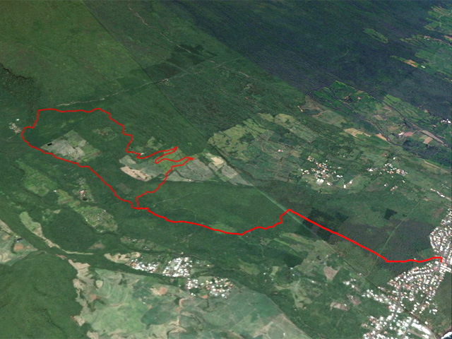 Se rendre dans le Sud Sauvage et rouler en direction de Saint-Philippe - Stationner près de l'église entre Basse Vallée et le Baril - Entreprendre de rallier le GRR2 en commençant la montée sur la Route Forestière de Basse Vallée - Emprunter le GRR2 et couper la route deux fois - A la troisième, prendre à droite par la RF et rejoindre le croisement avec la piste du gîte (panneau bleu) - Remonter jusqu'au gîte en traversant les plantations de palmistes, le dépasser - Repartir vers le nord en traversant la propriété pour rejoindre la Route Forestière des Camphriers - Redescendre vers le Gîte de Basse Vallée puis longer le GRR2 jusqu'à l'église du Baril.