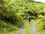 Cette randonnée débute à l'église du Baril, au tout début de la Route Forestière de Basse Vallée. La portion de route jusqu'au début du sentier est facile et courte (Photo 1). Le GRR2 grimpe doucement et régulièrement à travers les bois de couleurs envahis de fougères sur un terrain parfois caillouteux (Photo 2) ou le plus souvent terreux et couvert de racines (Photo 4). Après avoir traversé deux fois la route forestière, obliquer à droite à la troisième, marcher jusqu'au début de la piste et aux panneaux affichant la direction des trois gîtes de la zone. La piste recouverte de cailloux est surtout réservée aux 4x4 et aux marcheurs même si des véhicules légers peuvent atteindre le gîte en roulant au pas. Une minute après le croisement, on rencontre les premiers palmistes (Photo 6). Même s'il y a de nouveaux croisements, la direction est clairement reconnaissable sur la piste principale. En se retournant, on aperçoit le Piton Bernard de l'autre côté de la forêt (Photo 9). La pente est très légère (Photo 7) sur la piste qui effectue trois longs lacets avant de parvenir aux installations d'hébergement et de restauration (Photo 11). La piste se poursuit dans une partie du jardin et du verger de Jim Bègue avant d'obliquer sur la gauche en traversant une forêt de bois de couleurs recouverte de sabres et fougères (Photo 20). La clarté disparait en pénétrant sous le couvert des jamrosas et goyaviers qui bordent une ancienne piste très caillouteuse (Photo 21). La pente est parfois un peu forte. On coupe une ancienne ligne domaniale qui semble encore en bon état avant de rejoindre la Route Forestière des Camphriers dans un lacet (Photo 22). Un panneau indique le gîte mais les marcheurs ont l'habitude de prendre le raccourci à 600 mètres de là. Prendre à droite pour rallonger un peu la boucle et marcher sous les camphriers qui dégagent une agréable odeur (Photo 23). A la fin de la ligne droite, la piste se poursuit par un nouveau lacet vers le sentier botanique de Mare Longue. Le kiosque qui se trouvait là a disparu mais le raccourci qui mène au gîte de Basse Vallée est quant à lui toujours utilisé (Photo 24). La descente est rapide sur les racines qui peuvent être glissantes (Photo 25). A la route, prendre à droite et marcher jusqu'au Bras Plat puis le suivre par le GRR2 qu'on retrouve pour une longue descente. Le sentier est assez rectiligne à travers les bois de couleurs et goyaviers. On longe le magnifique lit du Bras Plat totalement verdi en raison des mousses qui recouvrent le basalte du lit (Photo 26). Ne pas manquer le tunnel de lave sur la droite qui présente encore une grotte assez facile d'accès par temps sec. On recoupe plusieurs fois la route forestière au cours de la descente couverte de racines parfois même de boue. Les bois de remparts rencontrés sont magnifiques. La fin de la boucle est le même circuit que celui employé dans la montée.