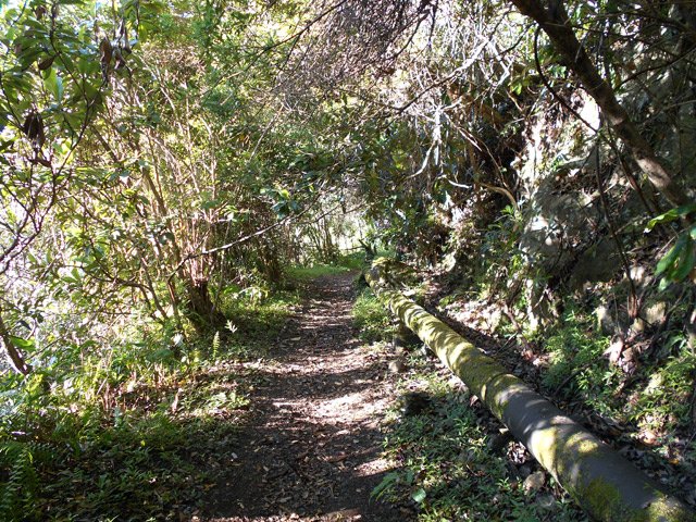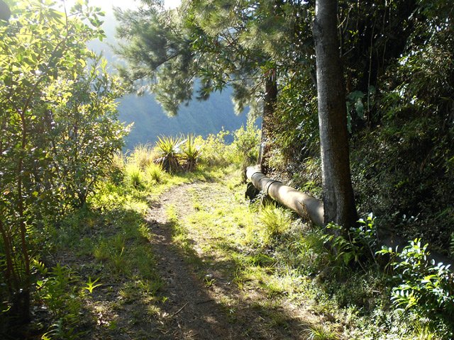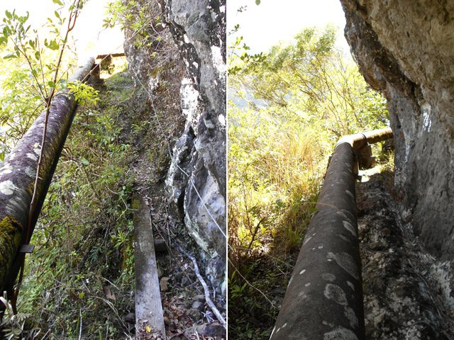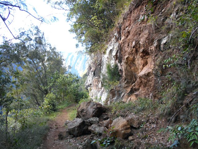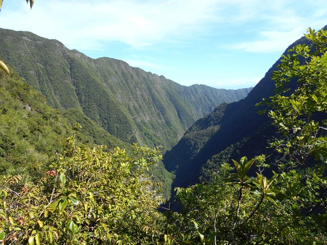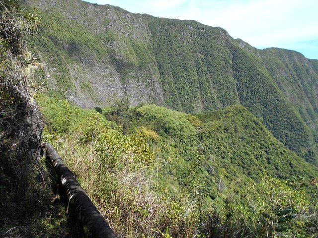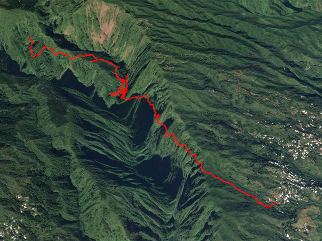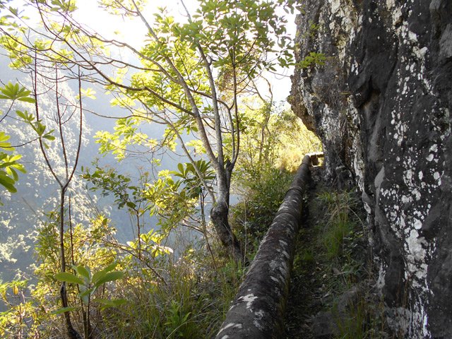La randonnée débute à la route de Saint-Bernard où il est facile de stationner. Le sentier qui remonte à la Fenêtre est facile à suivre sur une montée régulière pouvant être glissante par endroits. Quelques marches facilitent la courte ascension (Photo 1). Il est sombre toute la journée tant les jamrosas poussent ici serrés les uns contre les autres (Photo 2). La montée est directe dès le départ et les muscles ne sont chauds. Des sentiers partent dans plusieurs directions vers le Domaine Telmard, le Colorado ou la RF de la Plaine d'Affouches par le sentier des Goyaviers. Un quatrième sentier débute près du rempart et file en direction de l'Îlet à Guillaume (Photo 3). Lorsqu'il n'y a pas d'éboulis (Photo 4), c'est une formalité que de descendre vers le Bras Guillaume. Le sentier qui longe la tuyauterie est toujours large (Photo 5), en faible pente et offre souvent de beaux points de vue sur la vallée sur la gauche. Le sentier longe constamment la tuyauterie (Photo 6). Comme tous les circuits longeant des canalisations il est en général assez plat (Photo 7). Lorsqu'elle plonge dans le vide, le sentier effectue un écart pour la rejoindre à nouveau un peu plus bas (Photo 8). La falaise est impressionnante mais quelques câbles aident aux passages délicats (Photo 10). La végétation diminue beaucoup les sensations de vertige. Elle n'est cependant pas suffisante à certains endroits pour les acrophobes confirmés (Photo 11). D'autres passages ont été carrément creusés dans la roche et sont parfois à l'origine de quelques chutes de pierres (Photo 12). La canalisation plonge à nouveau dans le ravin et le sentier effectue quelques lacets pour la retrouver (Photo 13). On parvient ainsi en moins d'une heure à la passerelle qu'il n'est plus recommandé d'utiliser pour le franchissement. Un sentier a été aménagé spécialement et ceux qui veulent emprunter la passerelle prennent leurs responsabilités. Pour cela, prendre le sentier qui descend à gauche avant la cuve, passer sous le tuyau blanc et longer l'ouvrage en pierre sèche qui soutient la passerelle. Suivre un sentier en lacets qui rejoint le Bras Guillaume (Photo 14). Remonter le Bras jusqu'à un petit bassin puis retrouver l'itinéraire officiel. Le sentier en rive droite du Bras Guillaume monte parfois très fortement et passe sous d'énormes eucalyptus au tronc spongieux (Photo 15). Plus loin, débutent les premiers vestiges d’occupation de la zone avec, ça et là, des murets en bordure de sentier (Photo 16). La liane papillon est de plus en plus présente et étouffe inexorablement les arbres endémiques ou créent des tunnels sombres (Photo 17). Une dernière montée plus rectiligne sous les eucalyptus amène à l'emplacement de l'ancien pénitencier dont il ne reste qu'une case vieillissante démontée jour après jour pour faire un peu de feu lors des bivouacs des marcheurs de passage. Profiter d'une halte pour contourner la case et s'approcher du rempart. Poursuivre par une piste bordée de cryptomerias qui se dirige vers l'ancien cimetière. Le sentier de la Roche Écrite part sur la gauche au cimetière et entame une longue montée de plusieurs heures vers le gîte de la Plaine des Chicots. Entamer la montée à l'ombre des gros camphriers (Photo 19). Une petite sente sur la gauche rejoint une grande cavité entourée de pierres sèches qui devait certainement servir de réserve d'eau. Des pierres taillées occupent encore le fond dont certaines en forme de boite aux lettres. Heureusement, le sentier est long, la pente forte ce qui a évité à ces vestiges de disparaitre ! Poursuivre, toujours en montée le long de la tuyauterie jusqu'au panneau indiquant la Roche Écrite. Partir sur la gauche et longer simplement le tuyau métallique sans chercher à s'éloigner de la canalisation (Photo 20). Les passages alternent larges parties plates herbeuses (Photo 23) ou étroits sentiers entre tuyau et roche. Franchir calmement les deux passages plus délicats (Photo 21) qui représentent moins de 30 mètres. Profiter de la vue en enfilade de toute la vallée de la Rivière Saint-Denis (Photo 22). Après quelques virages, on parvient à une source contenant sans doute un peu d'oxyde de fer colorant la roche (Photo 24) et l'on aperçoit déjà les installations construites à la fin du tunnel. Pour les rejoindre, passer deux petites passerelles (Photo 25) puis grimper un haut escalier bétonné. Une grille ferme l'accès au tunnel qui domine les ravines du Bras Citron. Ne rien rajouter aux lamentables vestiges de boissons et emballages de gâteaux jetés là puis repartir en sens inverse pour regagner le point de départ par le même itinéraire en profitant cette fois des panoramas sur l'Îlet à Guillaume (Photo 26). En arrivant au Bras Guillaume, les plus courageux ne craignant pas de mouiller les chaussures remonteront le torrent sur une bonne centaine de mètres en sautant de caillou en caillou, en pataugeant dans la rivière ou en escaladant les berges. Un bassin et sa cascade (Photo 27) rendent plus difficile et aléatoire une remontée plus en amont.