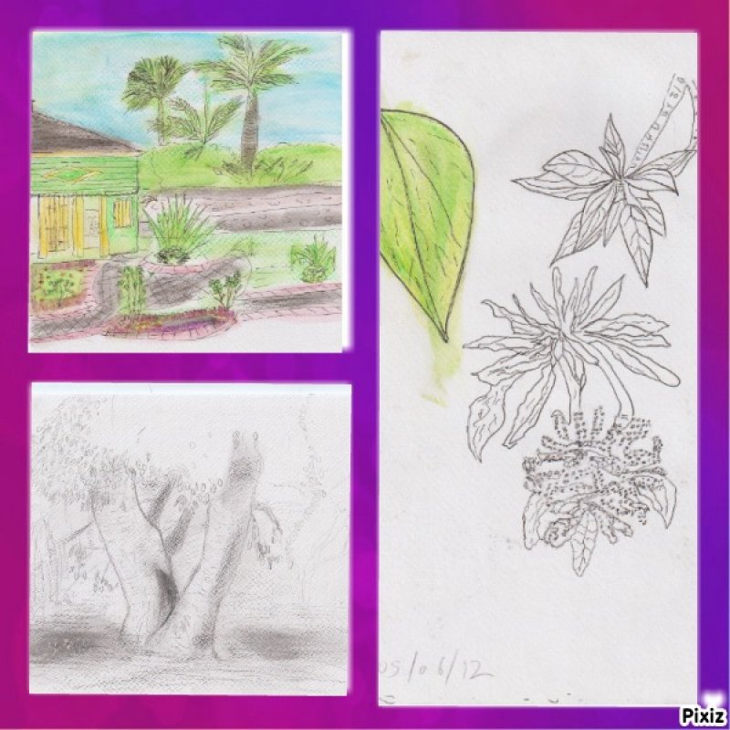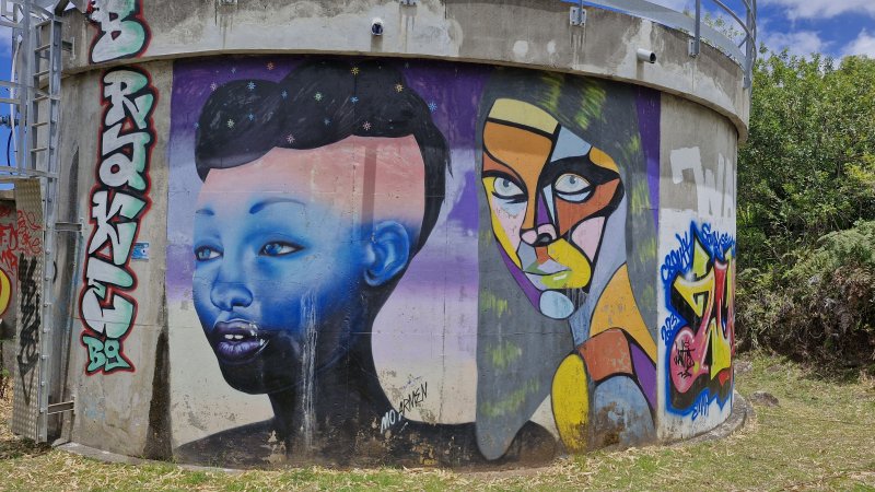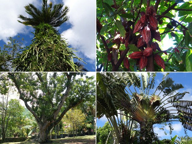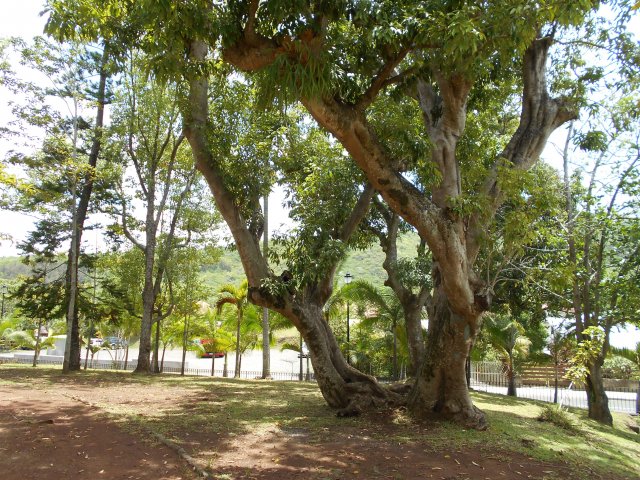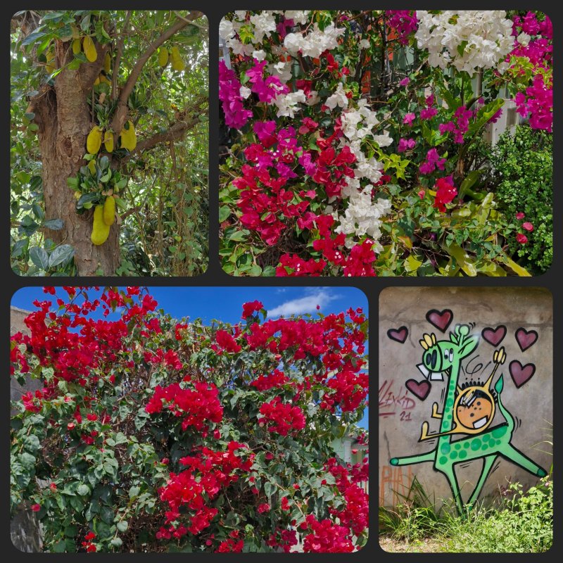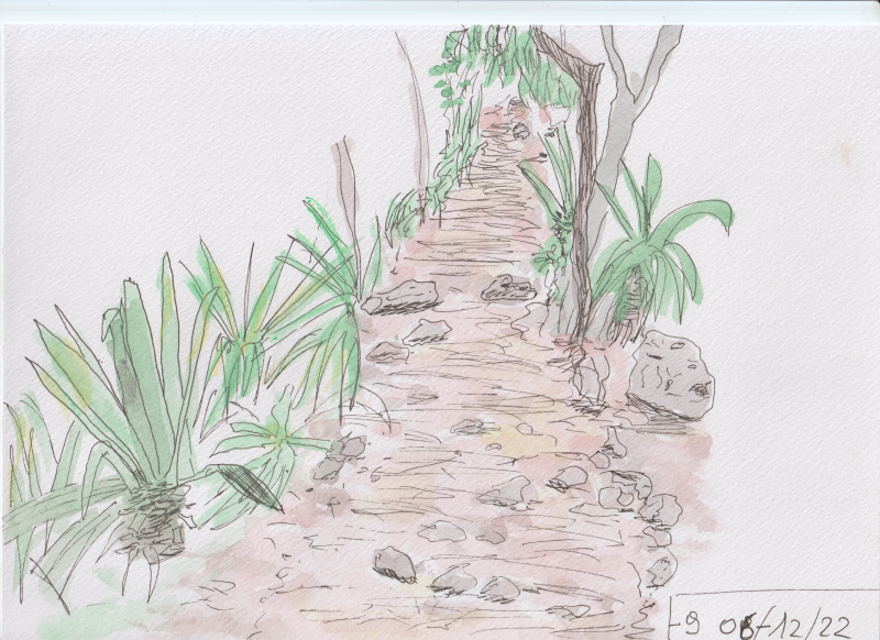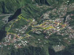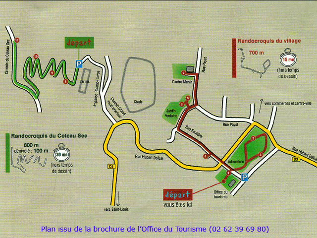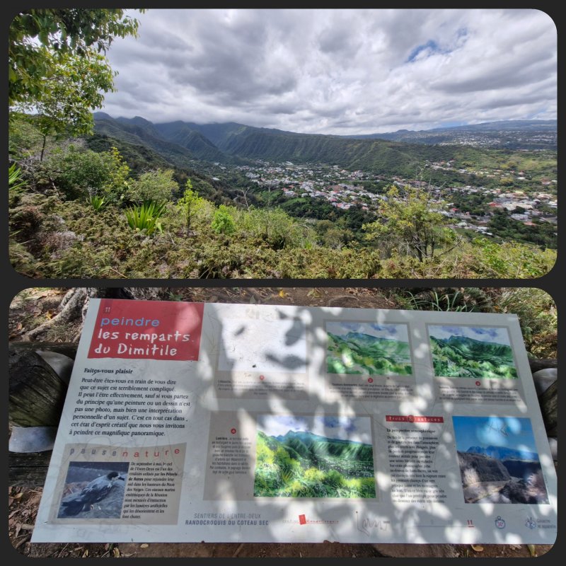 La randonnée débute sur le parking des bus en face de l'arboretum. L'arboretum étant tout proche il est possible d'en faire le tour avant de partir ou comme ici en milieu de boucle. L'endroit abrite les trois premiers stands de dessin. La première case rencontrée près du parking abrite une association de la ville. A la fin de la rue Fontaine, après avoir profité des premiers panoramas sur le Dimitile (Photo 1) et de quelques cases, on parvient au petit Jardin Fontaine. Ne pas chercher d'eau courante car le patronyme Fontaine est un des plus communs de l'île. L'endroit, très bien entretenu, est fleuri, calme, reposant (Photo 2) et entouré de belles cases entourées de jardins. Revenir sur ses pas et descendre en direction de la rivière en empruntant l'escalier situé à la fin de la rue Fontaine (Photo 4). Il y a peu de route à grande circulation jusqu'à la bifurcation vers le stade et les terrains de tennis au début du Coteau Sec. Pour éviter le goudron et le béton, poursuivre sur le chemin Grand Fond et trouver facilement le sentier qui attaque le coteau (Photo 5). La pente est sérieuse mais le sentier ombragé. Il s'approche de la route puis s'en éloigne pour suivre le circuit sportif par quelques lacets et escaliers de terre et de bois (Photo 6). On rencontrera trois nouveaux spots de dessin dans les lacets recouverts de pierres (Photo 10). Ces lacets sont la seule courte difficulté de la boucle ; il suffit de marcher lentement si on manque d'entraînement. Pour voir la onzième station de croquis, il faut partir sur la droite en arrivant sur le Chemin du Coteau. Repartir vers le bas et suivre cette petite route jusqu'au croisement avec la RD 26. La Rue Vienne n'est qu'à quelques pas sur la droite. Partir sur cette rue, prendre la première à gauche puis marcher jusqu'à la fin de la route qui semble un cul de sac mais se termine en réalité par un escalier métallique. On passe de la rue goudronnée aux maisons fleuries à un sombre verger en forte pente. Le sentier, étroit et abrupt, mène à la rivière que l'on entend depuis le haut (Photo 12). Les 5 derniers mètres ont subi les assauts du dernier cyclone mais le passage est bien marqué. Si la boucle s'effectue dans l'autre sens, le départ est moins visible. Retenir que la suite du sentier est exactement en face de l'autre portion, tout près de la petite cascade de la Source Rémy (Photo 13). Une montée sur terre et racines (Photo 14) amène en quelques minutes aux premières habitations. Reprendre alors le chemin de la ville par la Rue Hoareau et remarquer, juste avant la RD26, le cacaoyer couvert de fruits et de minuscules fleurs à même le tronc de l'arbre (Photo 22). La pente sur route est faible jusqu'au parking où se termine la première partie de la boucle, plus végétale. L'autre partie, plus urbaine va débuter par une incursion dans le parc arboretum pour y trouver quelques beaux spécimens d'arbres (Photo 15) et bien sûr des panneaux pour apprendre à les dessiner. Le lieu a subi de graves dégâts par le cyclone Batsirai en 2022 et a perdu beaucoup de son charme. Comme il n'y a qu'une entrée au petit parc, ressortir par la même grille, située en face de l'office du Tourisme et prendre à gauche. Une rue longe le parc et se termine en ruelle (Photo 16). A partir de la mairie, flâner à l'envie ou suivre cet itinéraire qui, reconnu, assure de trouver de magnifiques et vieilles cases (Photo 21) ou de splendides panoramas sur le Dimitile (Photo 20). Profiter aussi de quelques monuments (Photo 17) ou décorations urbaines (Photo 18). Ne pas manquer l'Impasse des Orchidées (Photo 24) pour s'approcher de la Case Pamplemousse qui porte très bien son nom quand l'arbre qui la flanque est couvert de gros fruits jaunes (Photo 25). De nouvelles cases bordent la route jusqu'à l'église Saint-Vincent de Paul qui signe la fin proche de la balade (Photo 28). Remarquer, juste en face de l'église, le cinéma qui porte la croix sur sa façade. Elle date de l'époque ou le bâtiment abritait les offices religieux durant la construction de l'église. Rejoindre la mairie puis le parking.