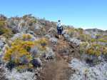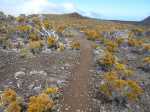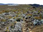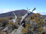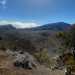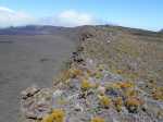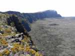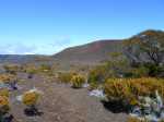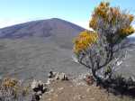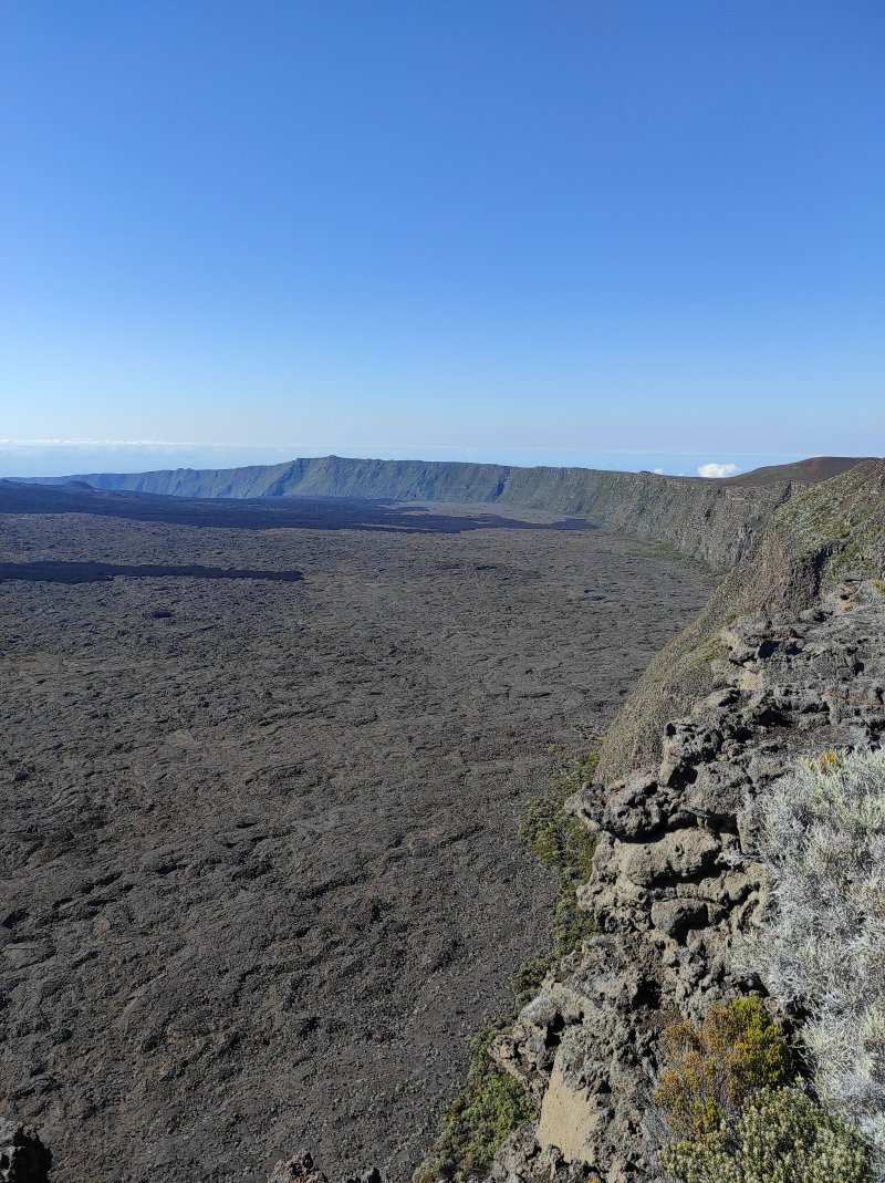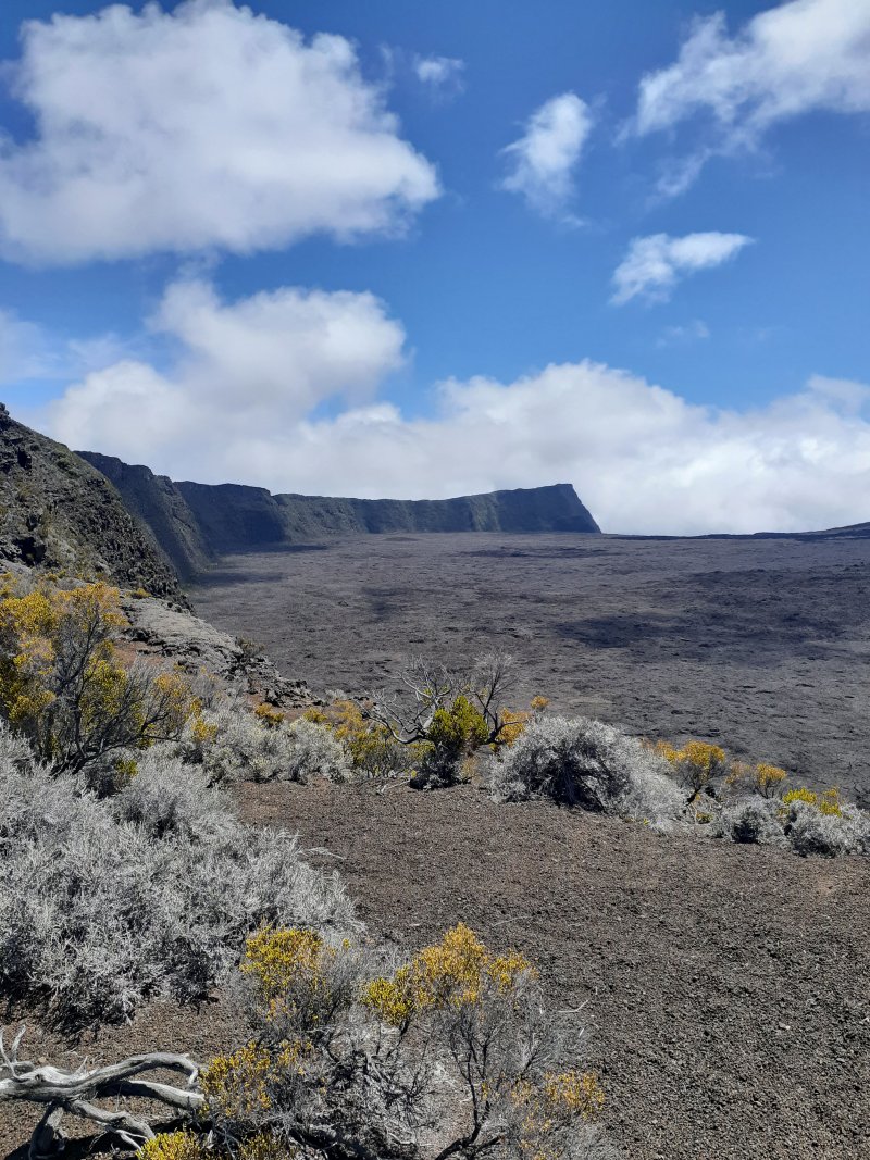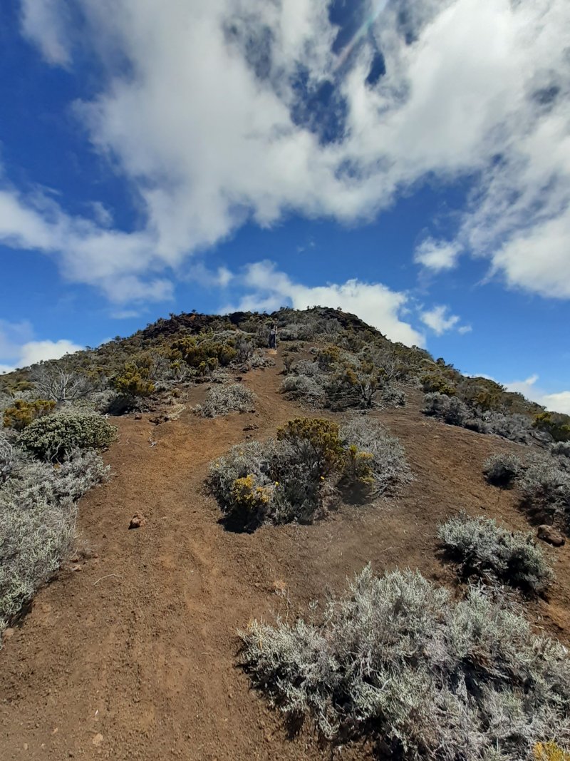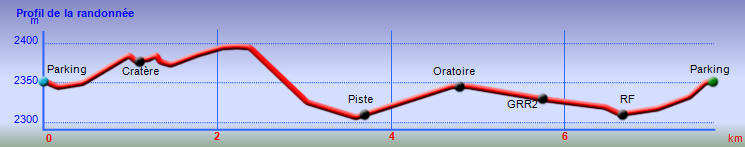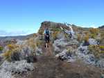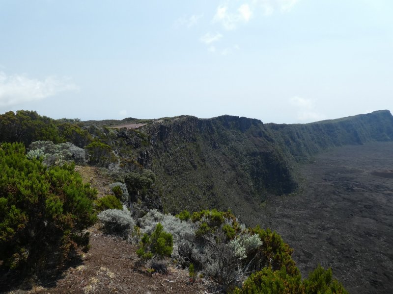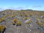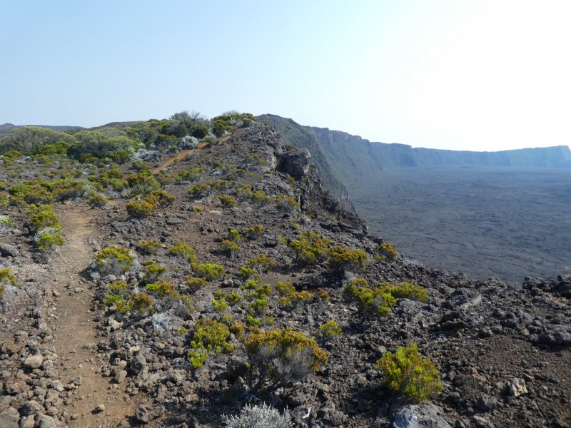 La randonnée débute juste derrière le petit bar et point d'information. Une petite murette sert de clôture et se passe sans difficulté. On longe ce qui peut s'apparenter à une ancienne piste bordée par des clôtures délabrées (Photo 1). On se retrouve très vite en bordure de rempart sur des traces très visibles (Photo 2) pour les premiers panoramas sur la Fournaise (Photo 3). Le rempart quasi-vertical est impressionnant et il ne faut pas s'approcher du bord lorsqu'on voit des roches qui semblent instables (Photo 4). Suivre simplement les traces de pas laissées dans le sable sur un sentier qui s'éloigne très rarement du bord. Quand on arrive en face du petit cratère qu'on aperçoit sur la droite, filer vers la clairière et se diriger vers la butte créée par le petit volcan (Photo 8). La courte pente amène au sommet, en bordure de deux cratères. Celui de droite est petit mais chaotique et difficile d'accès. Celui de gauche est plus vaste et comporte un fond plat recouvert de sable et de quelques herbes (Photo 10). La meilleure manière de l'apprécier est d'en faire le tour en marchant sur les bords de l'ancien cratère très érodé (Photo 9). Une fois le tour terminé, reprendre au hasard vers le rempart en marchant sur de grandes plaques sableuses. Une minuscule ravine donne assez d'eau pour abreuver les bovins à en juger par les traces de sabots. La balade reprend, toujours aussi facile et agréable entre les plantes rases (Photo 12). Avant d'arriver au Piton Rouge qu'on aperçoit déjà de loin, ne pas hésiter à grimper le minuscule piton sans nom dont le sommet se situe à 2395 m. De là, on domine de quelques mètres tout le circuit déjà pratiqué ou restant à faire (Photo 16) et on bénéficie même d'une belle vue plongeante vers la Fournaise (Photo 17). Le terrain devient de plus en plus sableux, les plantes de plus en plus rabougries (Photo 18). Il est possible de poursuivre ainsi jusqu'au pied du Piton Rouge, là où la piste et le GRR2 rejoignent le rempart (Photo 22) ou simplement couper à travers le désert vers le piton lui-même (Photo 23). En moins de 2 minutes, on se retrouve sur la piste qu'il n'y a plus qu'à suivre sans réfléchir (Photo 25) jusqu'au parking du sentier du Piton de Bert. Il est également possible de poursuivre ce semblant d'aventure en marchant à quelques dizaines de mètres de la piste dans un hors sentier sans danger pour le marcheur comme pour la végétation. Le relief sur la droite est plus difficile que de l'autre côté de la piste. On parvient au grand parking connu des amateurs d'éruptions et d'embouteillages monstres les jours d'observation. On peut terminer par la route forestière mais le sentier qui la longe est bien plus tranquille et moins poussiéreux que la piste terreuse (Photo 26). On profite alors du paysage vers le Demi-Piton et le Piton Haüy. Quand le sentier coupe la route et se poursuit vers la Griffe du Diable, longer la route et parvenir sans effort au parking, fin de la boucle.