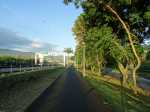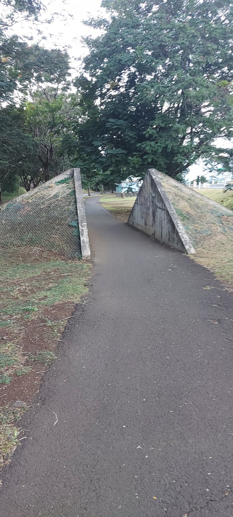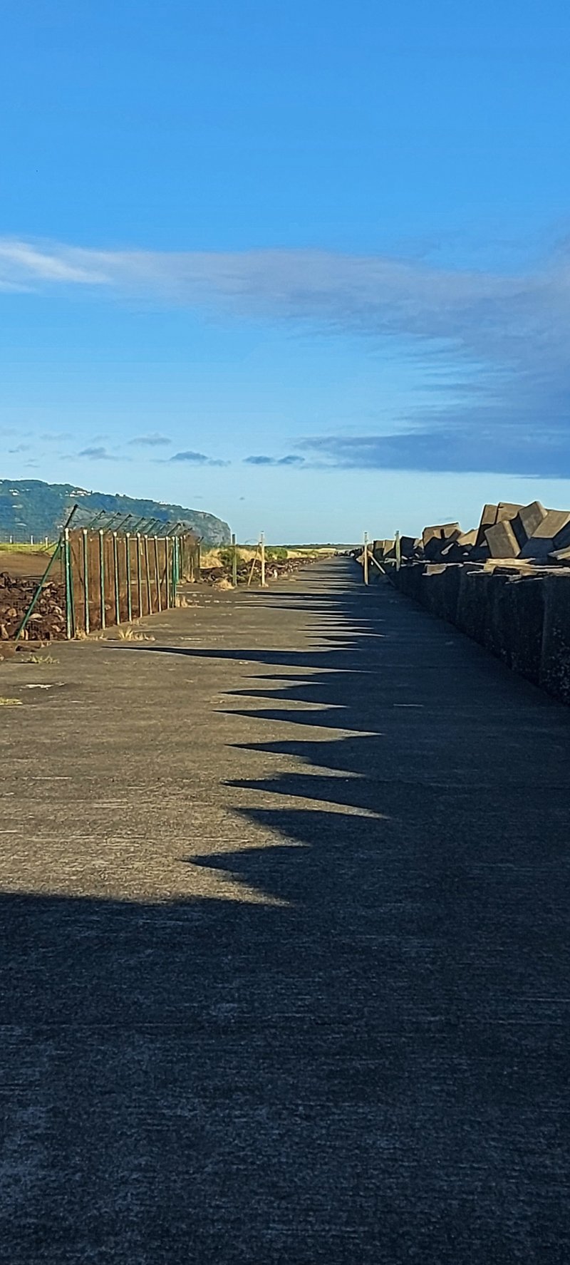 Quelle drôle d'idée d'aller randonner autour d'un aéroport ! L'expérience tentée à Pierrefonds n'était pas si désagréable malgré la chaleur, on y rencontrait déjà de nombreux coureurs qui s'entraînaient. A Gillot, beaucoup plus de personnes connaissent ce circuit depuis très longtemps et ce n'est pas ici qu'il faut venir chercher la solitude ou le silence car les routes principales ne sont jamais loin. En cumulant toutes les montées on a du mal à parvenir à 60 mètres répartis sur 12 kilomètres et, pour un peu, on pourrait même effectuer la boucle avec une poussette pour endormir bébé. Attention cependant au danger : si la route est de l'autre côté des murettes ou de la glissière de sécurité, les cyclistes arrivent parfois très vite et assez silencieusement. Il vaut mieux respecter le code et partager équitablement la piste en marchant sur le côté. Ne pas hésiter à effectuer quelques écarts pour visiter la chapelle tamoule et l'ancienne usine de la Mare ou le cimetière la Peste à la Jamaïque (voir § plus bas).
