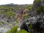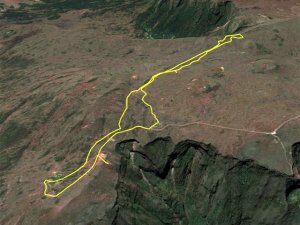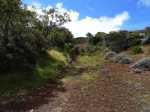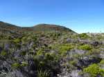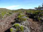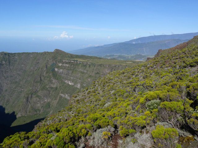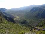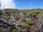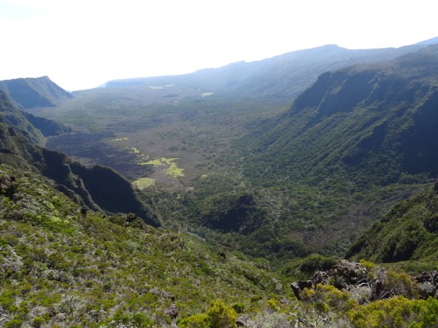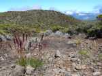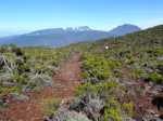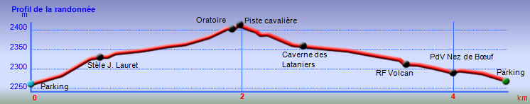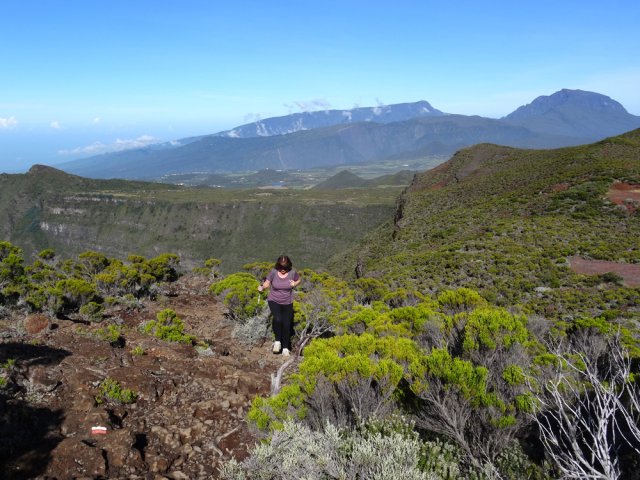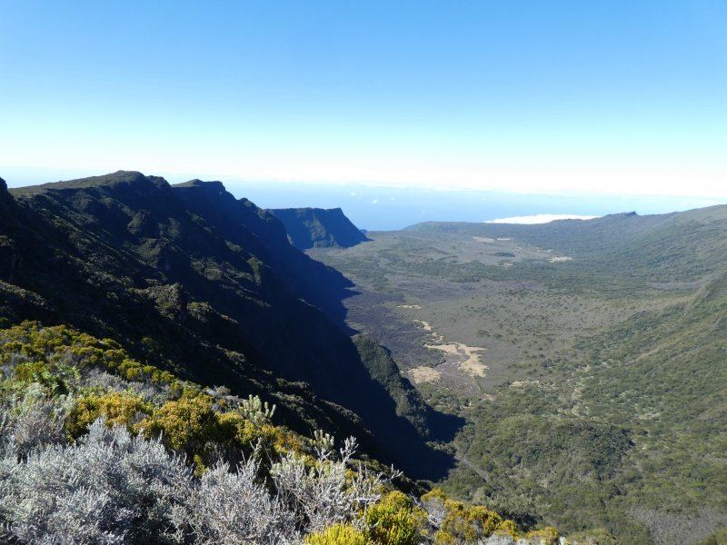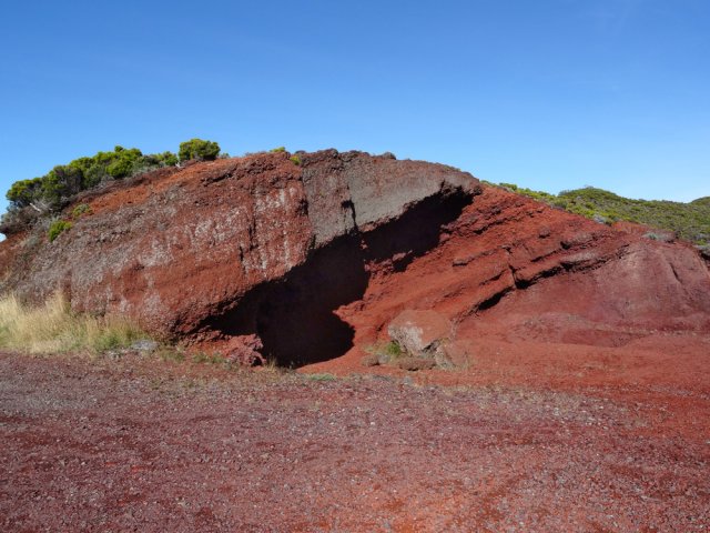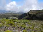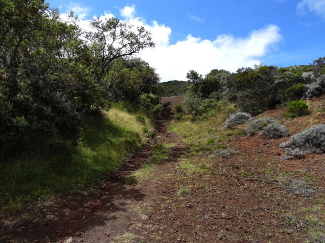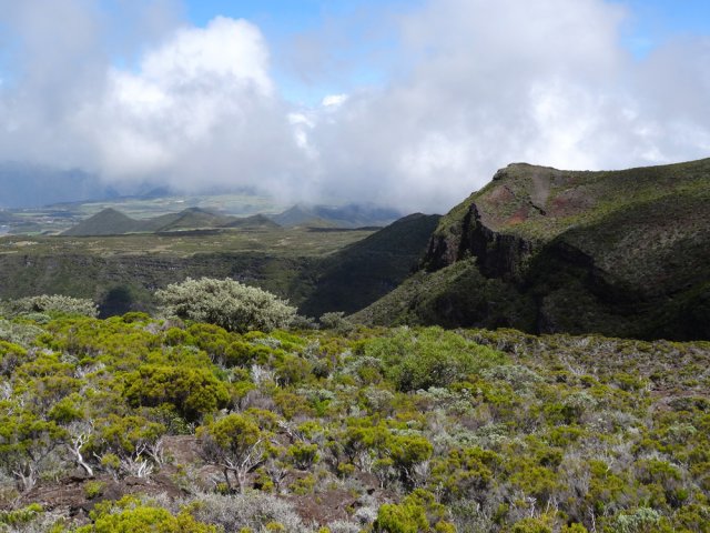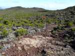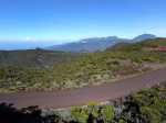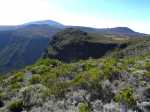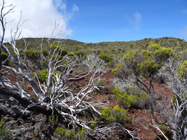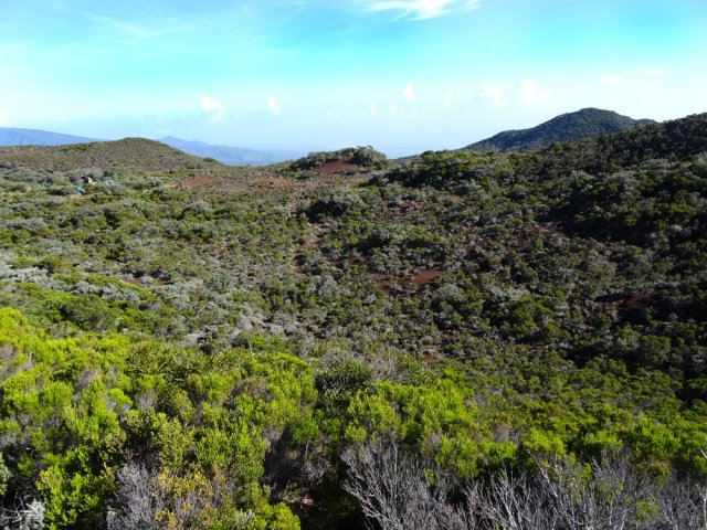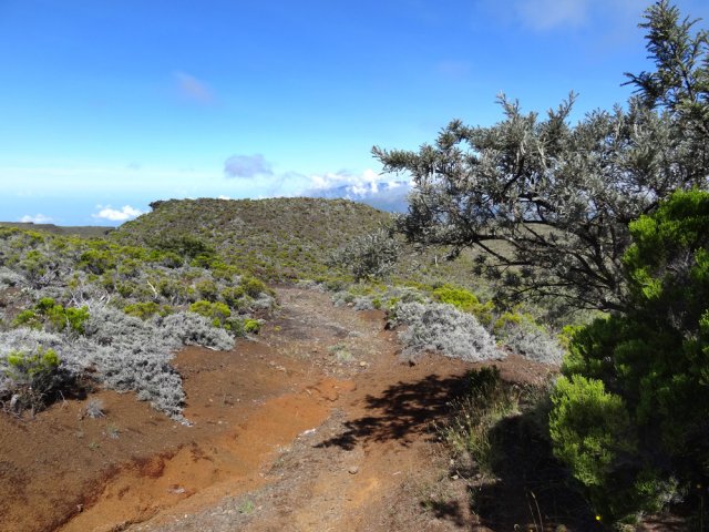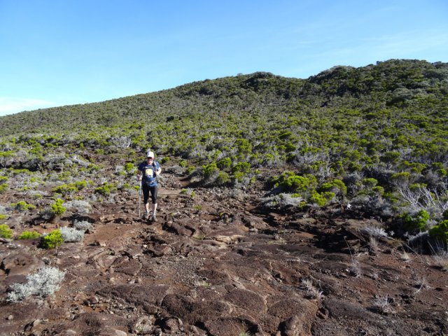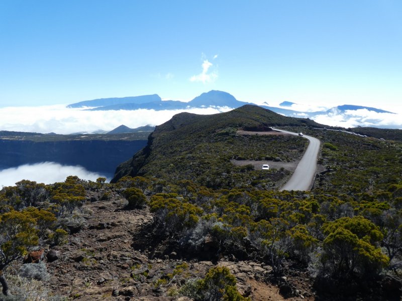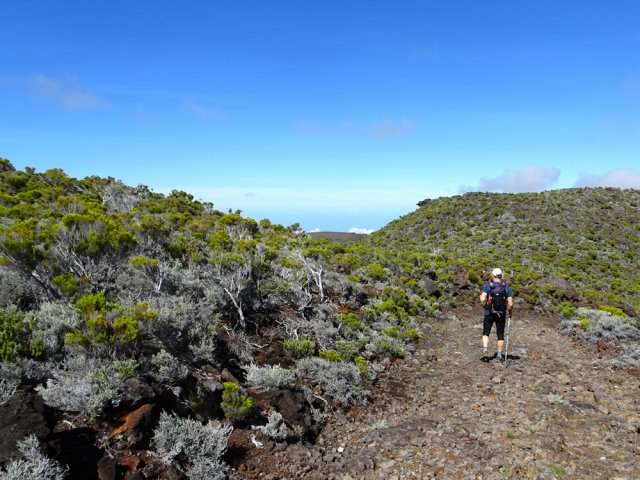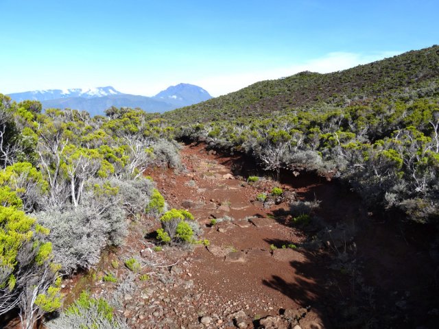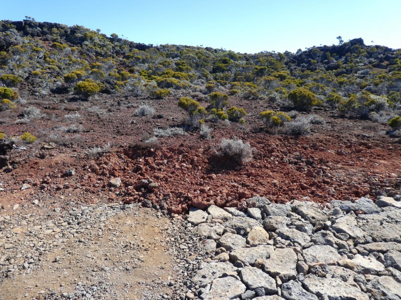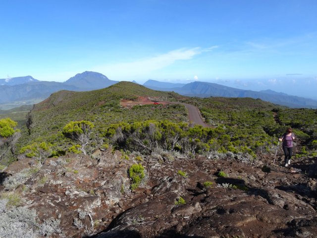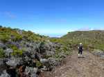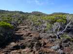 La randonnée débute au plus près de l'agréable aire de repos de Bois Ozoux, située à l'ombre d'une cinquantaine de petits tamarins. Les emplacements de stationnement sont vastes et l'endroit est calme et reposant.Penser à le repérer pour y manger un bon casse-croûte après cet aller-retour qui peut tout de même s'appeler boucle. Le GRR2 qui vient du Piton Textor a coupé plusieurs fois la route du volcan avant d'arriver à l'aire. Récupérer ce sentier sur la droite et entamer la montée (Photo 1). La pente est faible mais le sentier est caillouteux obligeant à regarder où poser les pieds (Photo 2). On profite déjà de larges panoramas sur la vallée de la Rivière des Remparts et le Nez de Bœuf cependant on pourra s'en approcher de bien plus près au retour (Photo 3). Les petits tamarins diminuent et les branles verts augmentent en nombre mais pas en taille (Photo 4). On frôle la route à l'endroit où il sera préférable de la quitter au retour si la circulation est importante (Photo 5). Quand les cailloux laissent la place à de larges plaques basaltiques rugueuses, on peut admirer, en se retournant, une grande partie de La Réunion, de l'Etang Salé à Saint-André en passant par les pitons habituels(Photo 6). On arrive très vite à la Stèle Josémont Lauret, toujours fleurie malgré l'altitude (Photo 8). Le sentier est relativement plat en traversant une lande constituée presque exclusivement de petits branles verts (Photo 9). La pente reprend sur les plaques pour une marche plus facile en direction du Piton des Basaltes dont on aperçoit la petite pointe surmontée de quelques antennes à l'horizon (Photo 13). Cette montée s'achève à l'Oratoire Sainte-Thérèse, très connu des randonneurs car quatre sentiers passent par là (Photo 16). La piste débute un peu plus haut mais ne pas quitter le lieu sans aller au plus près du rempart à 20 mètres de là pour admirer de nouveaux panoramas en direction du Fond de la Rivière de l'Est (Photo 18). Le Plateau des Basaltes avec ses aires dénudées entourées de brandes est à quelques encablures et peut donner lieu à un détour de 1500 m afin de rallonger cette balade (Photo 17). La piste équestre, une ancienne piste caillouteuse de mise en place des antennes, débute près d'un petit tamarin (Photo 19). La sortie, qui n'était guère difficile jusque là devient encore plus facile sur cette piste large (Photo 22). La taille des branles, à 2400 m d'altitude a encore diminué et il est possible sans danger d'effectuer de courts hors sentier, ne serait-ce que pour grimper le petit piton sur la gauche (Photo 21). Plus bas, repérer sur une roche située sur la gauche, un amoncellement de cailloux qui permet de trouver sans hésitation la Caverne des Lataniers. Emprunter le discret sentier qui s'approche des fourrés (Photo 23). On peut trouver ici la sérénité et l'abri pour la nuit. Pas d'eau pour la douche, un plafond bas, du bois sec et assez de place pour loger une demi-douzaine de sacs de couchage font de cet endroit le lieu idéal pour la halte lors d'une traversée de l'île (Photo 24). Reprendre la piste qui rejoint parfois le sentier à le toucher (Photo 25) et rejoindre la route par un long virage à angle droit. Marcher sur la route quelques dizaines de mètres puis partir sur la gauche à un petit parking de terre rouge. On s'approche alors au plus près du bord du rempart pour de nouvelles vues impressionnantes sur la Rivière des Remparts et le Trou Fanfaron, sur la gauche, très difficile d'accès (Photo 26). A partir du petit cratère rouge situé au plus près de la route (Photo 28), repérer quelques sentiers qui rejoignent le GRR2 si on ne veut pas arriver à Bois Ozoux par la route.