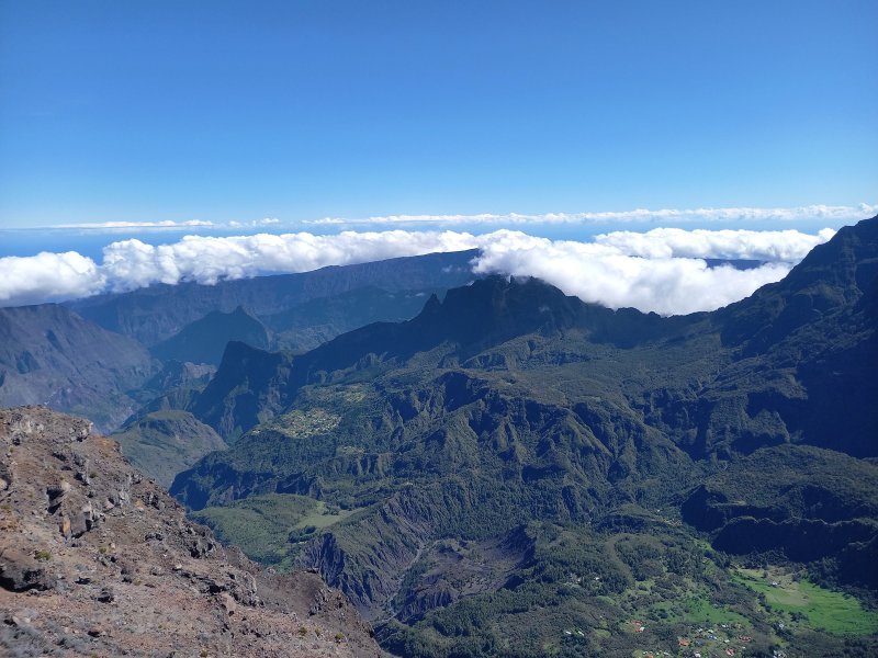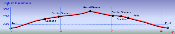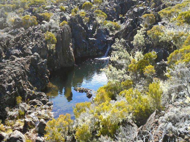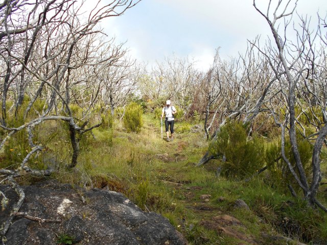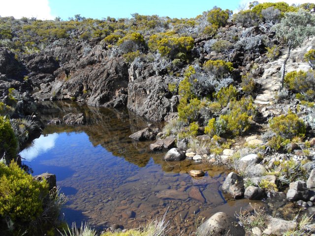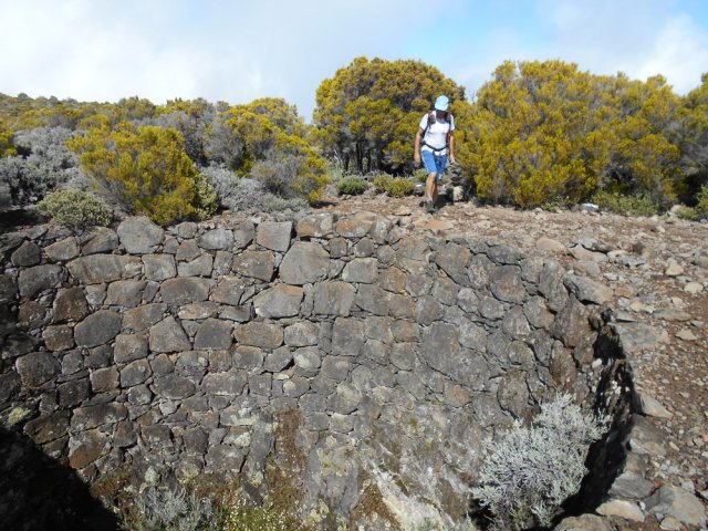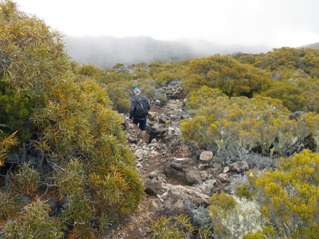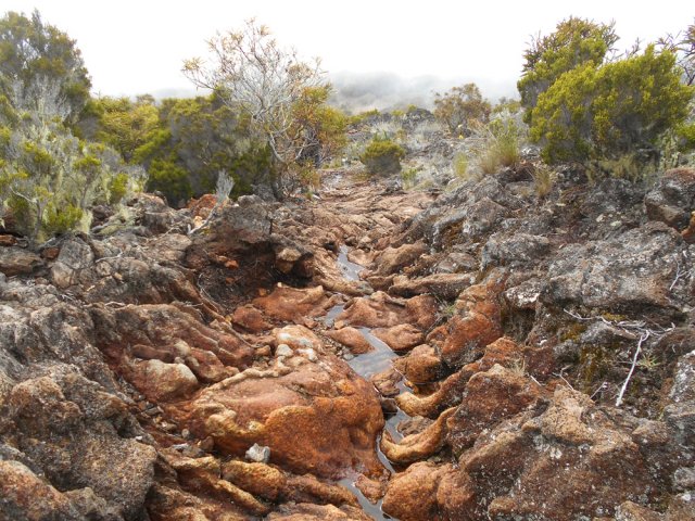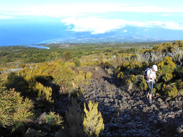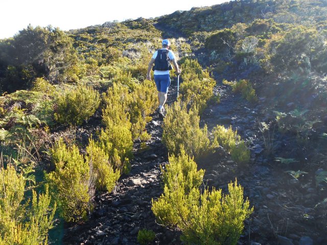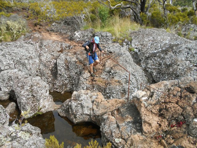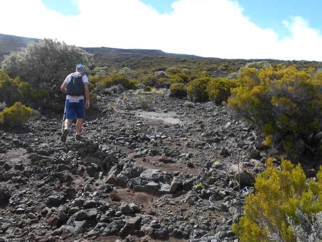 La randonnée débute entre deux ponts qui enjambent les fonds basaltiques extrêmement découpés de la Grande Ravine et un de ses affluents. La piste qui débute devient de jour en jour plus discrète et imposera bientôt de la repérer au GPS. Le ton est vite donné par les premiers acacias noirs tombés au sol (Photo 1). Ils ne sont pas énormes mais gênent le passage. Il faut les enjamber ou les contourner. On craint le pire mais l'on retrouve une vraie piste assez rapidement (Photo 2). La pente n'est jamais forte mais si régulière qu'il faut dès le départ adopter une allure et la conserver jusqu'au sommet ou tout du moins jusqu'au sentier du Piton Rouge. Penser à se retourner pour profiter des larges panoramas sur le lagon et l'océan (Photo 6). Les cailloux sont partout, emportés par les ruissellements et glissent parfois sous les pieds (Photo 7). Ailleurs, ce sont les branles verts ou les hautes herbes qui prennent possession de l'espace laissé par le peu de passages (Photo 8). Les grands arbres, déjà rares au départ, diminuent avec l'altitude (Photo 9). On aperçoit donc de mieux en mieux la fin de la montée vers le Grand Bénare (Photo 11). Le bruit de l'eau, après une pluie, attire l'attention quand on longe les bras de la Grande Ravine. Ne pas hésiter à s'en approcher pour découvrir de profonds bassins aux eaux noires alimentés par de petites chutes. On parvient ainsi au sentier du Piton Rouge et de la Glacière que l'on va suivre par la gauche sur une cinquantaine de mètres avant de traverser la Grande Ravine qui n'est ici qu'une succession de bassins (Photo 13 et 14). Plus loin, on se retrouve face à l'un des puits encore bien conservés construits en pierres sèches (Photo 15). Le sentier se poursuit vers la Glacière mais prendre celui qui part à l'opposé dans les cailloux en direction du Grand Bénare qu'on devine à l'antenne dépassant à l'horizon. L'angle de la pente est toujours le même et la présence de cailloux n'a pas changé (Photo 16). Au rempart, jeter un œil sur les impressionnants cassés qui dominent Cilaos. On y remarque les couches successives représentant chaque fois d'importantes éruptions datant de plusieurs millénaires. Un petit raidillon amène au sommet dominé par une croix blanche (Photo 17). Par beau temps on a ici les meilleures vues sur l'île, du Piton des Neiges jusqu'à la Fournaise. C'est reparti sur les cailloux pour redescendre vers le Maïdo en longeant le rempart (Photo 18). Des panneaux annoncent des failles et crevasses dont certaines sont assez importantes (Photo 19). A mi-chemin du Maïdo, obliquer sur la gauche et filer en direction de la Glacière sur un sentier tout d'abord assez plat qui se termine par d’innombrables lacets aménagés de manière anarchique. Les raccourcis qui facilitent l'érosion, balisés de blanc, sèment parfois la confusion sur la direction à prendre. Peu de difficultés ensuite pour suivre le sentier assez terreux (Photo 19) qui se termine à la voie très large repartant vers le Maïdo. On ne présente plus la Glacière, cet endroit entouré de bassins qui, gelés en hiver, servaient à alimenter les puits aménagés pour recevoir la glace transportée par les esclaves vers Villèle ou Saint-Paul (Photo 21). A partir de la Glacière, débute l'interminable descente sur les désormais inévitables cailloux. On frôle à nouveau un puits en bordure de ravine près duquel il est possible d'admirer quelques bassins impressionnants. La pente est parfois assez forte et les cailloux cessent pour quelques dizaines de mètres, remplacés par des plaques de basalte rougissantes et glissantes (Photo 23). Quand on parvient, les chevilles en feu, au gué sur la Grande Ravine où une rambarde sommaire a été installée, on sait que le "supplice" va bientôt prendre fin (Photo 25). De nouveaux bassins se repèrent dans les parages en s'éloignant un peu du sentier (Photo 27). On se retrouve un peu plus bas dans une zone beaucoup plus plate recouverte d'une forêt de tamarins brûlés entourés de verdure (Photo 28). Quelques kiosques d'une aire de repos proche du Gîte des Tamarins signent la fin de la boucle.