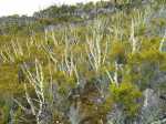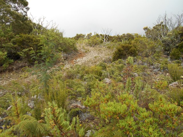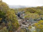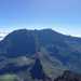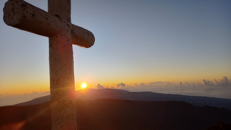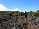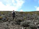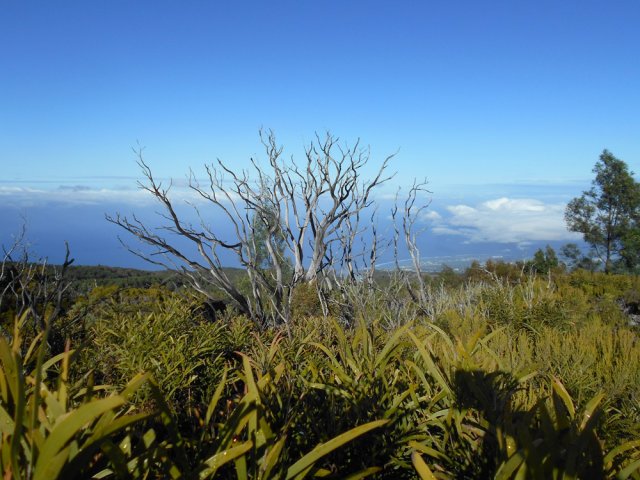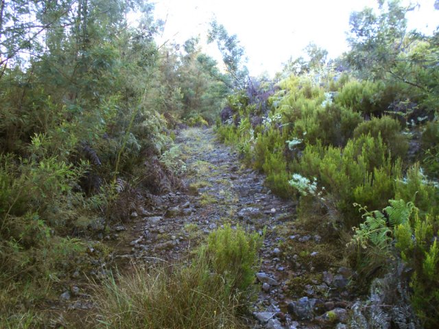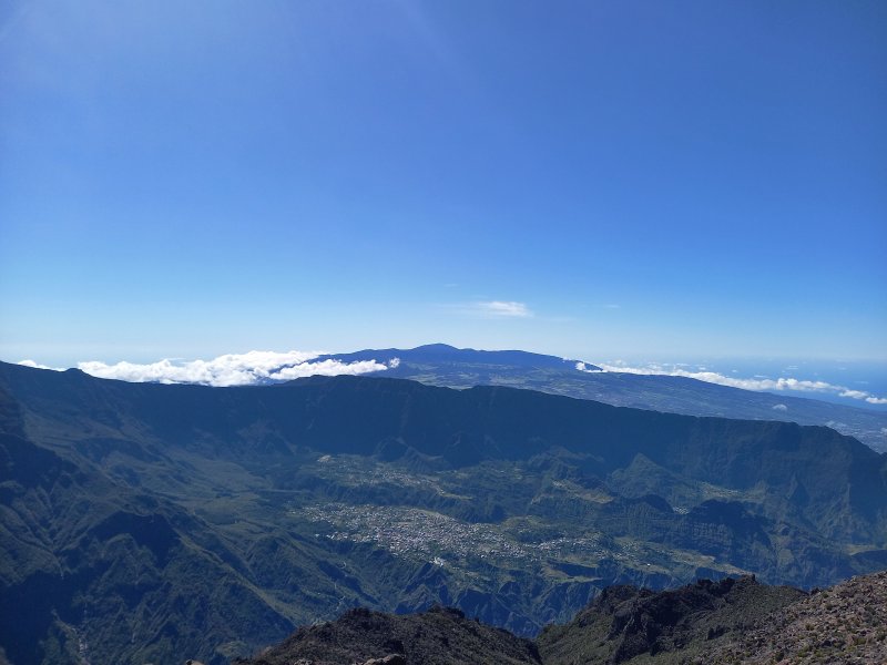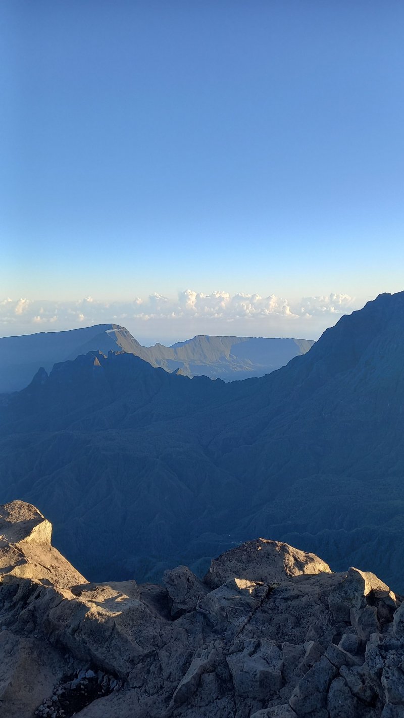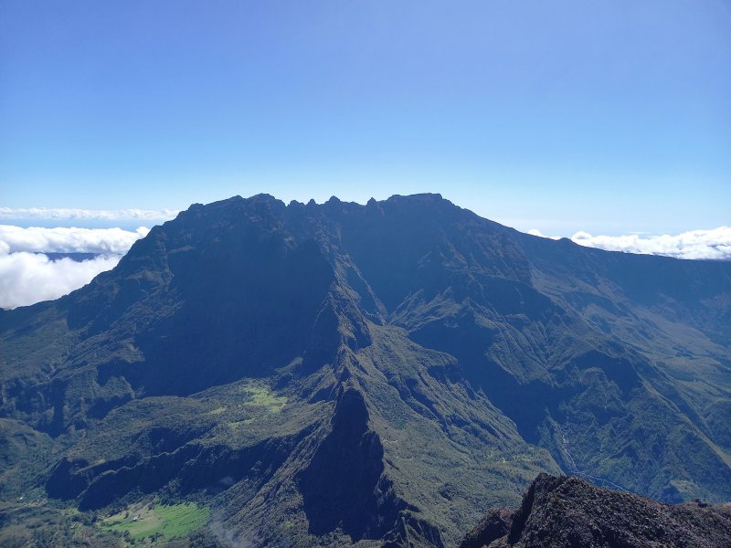 La randonnée débute entre deux ponts qui enjambent les fonds basaltiques extrêmement découpés de la Grande Ravine et un de ses affluents. La piste qui débute devient de jour en jour plus discrète et imposera bientôt de la repérer au GPS. Le ton est vite donné par les premiers acacias noirs tombés au sol (Photo 1). Ils ne sont pas énormes mais gênent le passage. Il faut les enjamber ou les contourner. On craint le pire mais l'on retrouve une vraie piste assez rapidement (Photo 2). La pente n'est jamais forte mais si régulière qu'il faut dès le départ adopter une allure et la conserver jusqu'au sommet ou tout du moins jusqu'au sentier du Piton Rouge. Penser à se retourner pour profiter des larges panoramas sur le lagon et l'océan (Photo 6). Les cailloux sont partout, emportés par les ruissellements et glissent parfois sous les pieds (Photo 7). Ailleurs, ce sont les branles verts ou les hautes herbes qui prennent possession de l'espace laissé par le peu de passages (Photo 8). Les grands arbres, déjà rares au départ, diminuent avec l'altitude (Photo 9). On aperçoit donc de mieux en mieux la fin de la montée vers le Grand Bénare (Photo 11). Le bruit de l'eau, après une pluie, attire l'attention quand on longe les bras de la Grande Ravine. Ne pas hésiter à s'en approcher pour découvrir de profonds bassins aux eaux noires alimentés par de petites chutes. On parvient ainsi au sentier du Piton Rouge et de la Glacière que l'on va suivre par la gauche sur une cinquantaine de mètres avant de traverser la Grande Ravine qui n'est ici qu'une succession de bassins (Photo 13 et 14). Plus loin, on se retrouve face à l'un des puits encore bien conservés construits en pierres sèches (Photo 15). Le sentier se poursuit vers la Glacière mais prendre celui qui part à l'opposé dans les cailloux en direction du Grand Bénare qu'on devine à l'antenne dépassant à l'horizon. L'angle de la pente est toujours le même et la présence de cailloux n'a pas changé (Photo 16). Au rempart, jeter un œil sur les impressionnants cassés qui dominent Cilaos. On y remarque les couches successives représentant chaque fois d'importantes éruptions datant de plusieurs millénaires. Un petit raidillon amène au sommet dominé par une croix blanche (Photo 17). Par beau temps on a ici les meilleures vues sur l'île, du Piton des Neiges jusqu'à la Fournaise. C'est reparti sur les cailloux pour redescendre vers le Maïdo en longeant le rempart (Photo 18). Des panneaux annoncent des failles et crevasses dont certaines sont assez importantes (Photo 19). A mi-chemin du Maïdo, obliquer sur la gauche et filer en direction de la Glacière sur un sentier tout d'abord assez plat qui se termine par d’innombrables lacets aménagés de manière anarchique. Les raccourcis qui facilitent l'érosion, balisés de blanc, sèment parfois la confusion sur la direction à prendre. Peu de difficultés ensuite pour suivre le sentier assez terreux (Photo 19) qui se termine à la voie très large repartant vers le Maïdo. On ne présente plus la Glacière, cet endroit entouré de bassins qui, gelés en hiver, servaient à alimenter les puits aménagés pour recevoir la glace transportée par les esclaves vers Villèle ou Saint-Paul (Photo 21). A partir de la Glacière, débute l'interminable descente sur les désormais inévitables cailloux. On frôle à nouveau un puits en bordure de ravine près duquel il est possible d'admirer quelques bassins impressionnants. La pente est parfois assez forte et les cailloux cessent pour quelques dizaines de mètres, remplacés par des plaques de basalte rougissantes et glissantes (Photo 23). Quand on parvient, les chevilles en feu, au gué sur la Grande Ravine où une rambarde sommaire a été installée, on sait que le "supplice" va bientôt prendre fin (Photo 25). De nouveaux bassins se repèrent dans les parages en s'éloignant un peu du sentier (Photo 27). On se retrouve un peu plus bas dans une zone beaucoup plus plate recouverte d'une forêt de tamarins brûlés entourés de verdure (Photo 28). Quelques kiosques d'une aire de repos proche du Gîte des Tamarins signent la fin de la boucle.