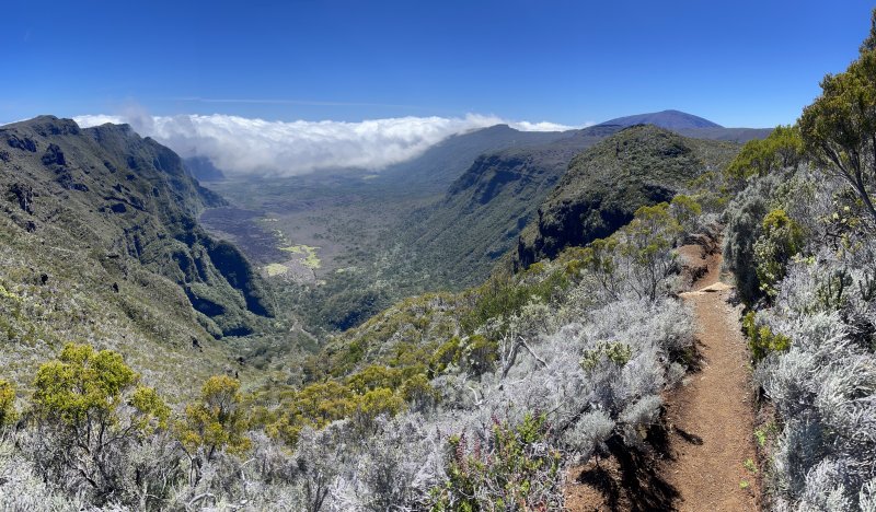 Après une trentaine de sorties sur la Plaine des Sables, il est surprenant de constater que le sentier qui part de la piste vers la GRR2 n'apparaît sur aucune fiche. Voilà qui est réparé avec cette boucle qui comporte la moitié de sa distance en hors sentier. La première partie traverse la Plaine des Sables et monte à l'Oratoire Sainte-Thérèse en suivant les trajets officiels. La deuxième sillonne dans la nature avec le pari réussi de ne jamais marcher sur une plante. Il faut alors, on s'en doute, effectuer des centaines de petits contournements pour toujours trouver les cailloux, lapilli ou prairies sauvages afin d'éviter branles verts et ambavilles qui ont souffert d'anciens incendies. Ce qu'il en reste rivalise de beauté sauvage et incite à ralentir le pas pour rechercher les plus élégants. On traverse également des zones où les sculptures de basalte créent de magnifiques natures mortes. On n'est jamais loin de la route où circulent les visiteurs du volcan. Même pari sur le Plateau des Basaltes dont on peut en faire le tour, profitant ainsi de grandioses points de vue sur le Fond de la Rivière de l'Est.