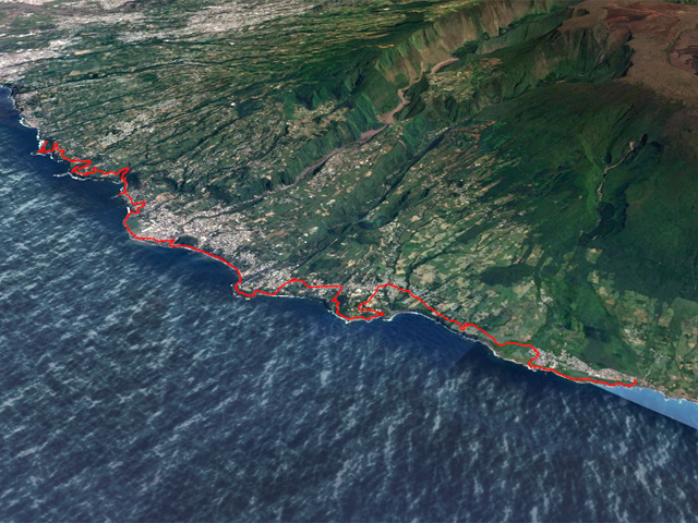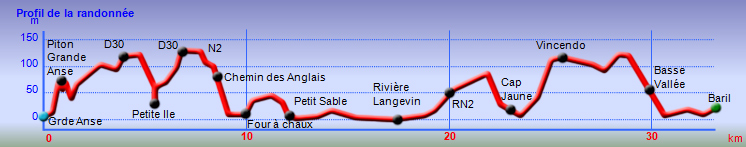 La randonnée débute au parking de la plage de Grande Anse. Emprunter une des pistes longeant la plage et rejoindre le début du sentier, au pied de la falaise. La montée est assez raide sur de nombreuses marches en rondin (Photo 1). Ne pas poursuivre sans aller profiter du point de vue sur la plage (Photo 2), soit directement vers le parking soit en descendant se régaler des paysages au Cap Auguste. Une fois la descente terminée, traverser le petit parking du point de vue sur le rocher et remonter la route jusqu'au croisement avec la D30. Prendre à droite et marcher sur l'ancienne nationale puis plus loin sur le bien nommé Chemin du Panorama qui offre de belles vues plongeantes sur les cannes à sucre et l'océan (Photo 3). Continuer jusqu'au pont sur la Ravine de Petite Île. Bifurquer immédiatement après le pont dans les maraîchages et cannes à sucre en descendant vers le point de vue sur le rocher de Petite Île par une piste en pente régulière. Même si les cannes sont hautes, la pente permet d'admirer la région vers le Piton de Grande Anse (Photo 4). Le sentier qui part sur la droite à hauteur du rocher permet de s'approcher du point de vue officiel. Avec des jumelles, on peut voir sur la gauche de l'îlot des dizaines de macouas (Anous stolidus) qui ont pris possession des lieux. Des sentiers un peu partout permettent aux pêcheurs de gagner le rivage au plus près des vagues. Ils sont escarpés mais très courts et présentent l'avantage d'admirer l'îlot sous d'autres angles (Photo 5) mais la randonnée est longue et il faut éviter les détours qui retardent. Reprendre la piste vers la droite et regagner la D30 par un large virage de la piste (Photo 6). Poursuivre jusqu'à la RN2 par le très agréable Chemin Neuf (Photo 7) et descendre vers le pont enjambant la Ravine de Manapany, très profonde à cet endroit. Après avoir acheté un fruit au marchand sur la droite, emprunter un peu plus loin le chemin pavé des Anglais qui descend rapidement vers la plage de Manapany (Photo 9). Les anglais n'y sont jamais venus mais on a pris l'habitude de nommer ainsi les chemins pavés. On pénètre sur le territoire du gecko de Manapany dont la population diminue plus rapidement depuis que le lézard vert de Madagascar les dévore. Pour les apercevoir, lever la tête et guetter dans les vacoas et palmiers (Photo 10). Il est très rare de passer sans en voir un. On laisse à droite le bassin de baignade et on entame une longue traversée du village par la rue de l'Océan en cherchant les jardins fleuris, les cases typiques ou en effectuant un petit détour vers l'office du tourisme, le four à chaud ou le Cap Chevron aux vagues démontées. On retrouve la RN pour moins de 300 mètres puis on bifurque à droite sur la rue des Anones puis à gauche sur la Rue François Martin Manapany. Entamer la descente vers la mer en passant près d'un séchoir à plantes. Ralentir en bas de la descente et trouver le petit sentier qui rejoint l'étroite piste en direction de la plage de Petit Sable (Photo 11). L'endroit est toujours aussi enchanteur avec ces falaises qui bordent l'endroit (Photo 12). Rejoindre le Butor, un quartier de Saint-Joseph en longeant les falaises sur un superbe petit sentier extrêmement plat (Photo 13). Poursuivre jusqu'aux Quais, un autre quartier de Saint-Joseph. Comme la route est encore assez longue, éviter la plage de galets et privilégier la Rue de l'Amiral Lacaze pour franchir le radier et rejoindre l'ancienne usine du Piton Babet (Photo 15). Contourner le terrain de sport par la droite et poursuivre jusqu'à la fin du sentier en s'approchant de l'océan. Si la mer est très forte, remonter en ville par la Rue Claude Debussy sinon, oser une escapade sur la plage de galets en partant sur la droite. La marche y est plus difficile qu'en ville mais on s'approche d'endroits connus seulement des pêcheurs sur une longueur de 1500 mètres. La marche s'effectue principalement sur les galets. Un passage étroit a été sécurisé sommairement par les pêcheurs et il faut traverser la Rivière Langevin quand on arrive sur ses berges (Photo 16). Cette traversée est une petite aventure sans danger sur des roches, galets, bois flottés ou proche de grottes, amoncellements, falaises ou magnifiques filaos (Photo 17). On arrive les pieds mouillés à la marine de Langevin pour entamer une nouvelle balade le long de la mer en marchant sous les filaos (Photo 18). De larges pistes permettent de marcher vite mais de petits sentier s'approchent au plus près de la mer démontée et des gouffres écumants (Photo 19). Poursuivre le long de la plage de galets en marchant sur la petite route littorale. On pourrait poursuivre vers le Puits de Langevin sur un itinéraire qui a été testé. Ce détour est sportif, aléatoire et a nécessité de traverser 20 mètres de canne fourragères ; éviter donc ce tronçon en préférant le Chemin de la Source suivi d'un long kilomètre de RN pour prendre à droite le Chemin de Terre Rouge et descendre retrouver la mer au magnifique bassin entouré de falaises jaunes (Photo 20). Nouvelle balade sur les gazons ras endémiques qui recouvrent le sol (Photo 21). Arches, grottes, gouffres battus par les vagues peuvent ralentir un peu pour les photos de nature et on arrive en vue de la Marine de Vincendo, un modeste plan incliné pour mettre les bateaux à la mer (Photo 22). Guetter le splendide souffleur qui se voit de très loin si les vagues sont présentes. Le sentier qui partait de Cap Chien vers la ville est obstrué et termine en propriété privée. Reprendre donc le Chemin du Port en partant sur la gauche (Photo 23), passer devant le restaurant l'Oiseau de Mer puis bifurquer à droite sur la Rue Georges Fourcade, en sens interdit pour les véhicules, qui monte très fort entre les cannes puis entre les habitations en arrivant à la RN. Un nouveau tronçon de 1300 m goudronnés permet de se reposer en prenant garde à la circulation mais l