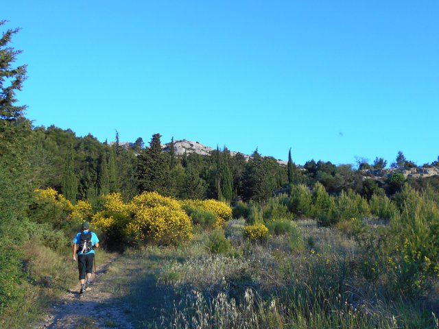 Quand on roule sur l'autoroute des Deux Mers entre Carcassonne et Narbonne, on remarque sur la droite de belles concrétions de calcaire qui dépassent de la végétation. Un panneau indique le Mont Alaric et on devine déjà que de beaux sentiers doivent le parcourir. Le Signal d'Alaric culmine à 600 mètres, soit 500 m au-dessus du point de départ. Le départ est ici proposé près d'un endroit original à deux pas du petit village de Moux. C'est à cet endroit paisible qu'Henri Bataille, dramaturge et poète, a décidé d'être enterré (voir § ci-dessous). La petite chapelle qui jouxte la fontaine surmontée par une sculpture de François Pompon est à l'abri de grands pins et de cyprès. Des plaques de marbre fixées au mur d'enceinte comportent certains textes de l'auteur, expliquant son désir de reposer en ce lieu. Le petit parking suffit amplement à fixer ici le point de départ. La boucle est courte et passe par les points les plus remarquables de la région recouverte de bois de résineux et de garrigue très fleurie en ce mois de mai. La randonnée comporte quelques montées mais n'est pas difficile car le sentier est toujours en bon état même si on rencontre quelques portions très caillouteuses.