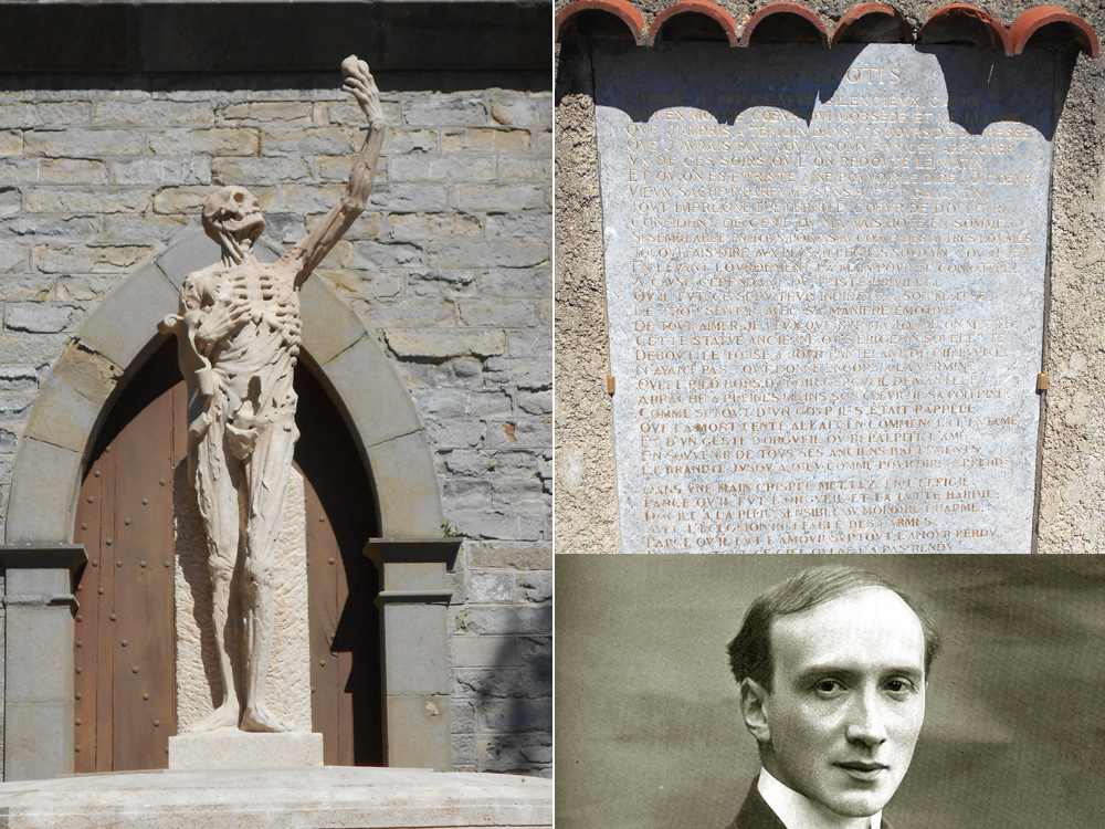 Henri Bataille (1872 – 1922) est un écrivain, dramaturge et poète français qui connut un franc succès à l'époque où il écrivait. Son père, magistrat à la cour d'appel de Paris est né dans l'Aude où la famille possède une crypte à 200 mètres du cimetière de Moux. C'est donc là qu'est inhumé le poète. Son tombeau est une fontaine en marbre finement sculptée (reproduction de la fontaine de Beaune, à Tours), surmontée d'une sculpture de François Pompon, représentant une copie du Squelette (ou le Décharné ou Monument au cœur de René de Chalon, attribuée à Ligier Richier en 1545) que l'auteur aimait particulièrement. Un large escalier permet de rejoindre la modeste chapelle entourée de pins et cyprès. Sur les murs d'enceinte du tombeau familial sont fixées des plaques de marbre gravées de poèmes d'Henri Bataille.