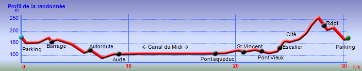 La randonnée débute ici au grand parking du Lac de la Cavayère mais peut également commencer n'importe où puisque on coupe ou utilise une dizaine de tronçons de routes. En période estivale, le lac présente l'avantage de pratiquer une baignade réparatrice à la fin de cette longue sortie (Photo 1). Le tour du lac est une balade très agréable pratiquée par de nombreux joggeurs ou cyclistes. Une petite route longe les berges sinueuses en effectuant quelques courtes montées et descentes (Photo 3). Quand on s'élève, on distingue mieux l'étendue d'eau ou les infrastructures aquatiques de loisir (Photo 2). C'est de la digue d'une trentaine de mètres de hauteur qu'on a les plus belles vues sur le lac (Photo 4). Si on poursuit après le barrage vers la gauche, on s'approche de l’accrobranche. Partir donc à droite en direction du château de Gaja entouré de quelques habitations. Filer plein nord en direction d'un échangeur de l'autoroute et bifurquer à droite en arrivant à la première bretelle. On se retrouve sur un agréable chemin dans les herbes où la marche est très agréables dans les fleurs et les aromatiques (Photo 5). La piste descend puis se rétrécit à l'approche de l'autoroute qu'il faut franchir en employant un tunnel qui a beaucoup souffert des tragiques inondations d'avril 2018 (Photo 7). La remontée vers Trèbes, également touchée par ces crues, s'effectue sur une belle piste dans les herbes et les pins (Photo 8). Couper la D3 et filer tout droit vers la ville et le pont qui enjambe l'Aude. Effectuer une première pause au théâtre de plein air de la ville (Photo 9) avant de rejoindre les berges de l'Aude (Photo 10). Contourner ou traverser la vieille ville puis rejoindre les berges du canal du Midi, début d'une très longue marche jusqu'aux premières habitations de Carcassonne. Ne pas manquer au départ le premier pont aqueduc sur l'Orbiel, récemment remis en état puis le beau pont enjambant le canal quelques centaines de mètres plus loin (Photo 11). Dès qu'on s'éloigne des routes, on se retrouve le long du canal sur une piste (Voie Verte) plate et propre dans la verdure et au bord de l'eau (Photo 12). On marche ainsi 10 km au calme et dans la verdure sans jamais chercher sa route (Photo 13). Le canal et l'Aude sont parfois séparés de quelques mètres seulement. Les écluses se multiplient et donnent l'occasion de quelques haltes pour voir des bateaux de plaisance les franchir. A Pont Rouge, on parvient aux écluses de Fresquel qui sont constituées de trois paliers consécutifs pour un spectacle garanti en cas d'arrivée de péniche ou de bateau (Photo 16). Tout près, un nouveau pont permet au canal d'enjamber l'Aude (Photo 14). Poursuivre sur la Voie Verte en utilisant de belles pistes bordées de cyprès centenaires (Photo 18). Après avoir aperçu les premières habitations de Carcassonne qui dominent le canal, on se retrouve à l'entrée de la ville et du port situé en face de la gare SNCF (Photo 19). A partir de la gare, il est possible, avec un guide touristique, de se balader dans la ville à la recherche de monuments caractéristiques. Mais après plus de 6 heures de marche et encore quelques kilomètres avant de revenir au lac, il faut choisir un itinéraire court. Rejoindre le Dôme, un monument facile à trouver près du Square Gambetta. Le Pont Vieux mérite un petit détour, ne serait-ce que pour le point de vue sur la citadelle. On peut rejoindre directement la citadelle à partir du Pont Vieux mais un autre itinéraire, plus original, ne fait pas perdre de temps. Remonter l'Aude par la zone verte entre le Quai Bellevue et la berge puis repérer l'escalier qui descend vers l'Aude. Il termine à une passerelle en béton qui traverse la rivière (Photo 22). Traverser un parc puis remonter vers les murs de la cité qu'on aperçoit entre les arbres puis les habitations. Trouver la Petite Côte de la Cité puis entamer une montée sur un escalier bordé de murs (Photo 23). L'escalier finit près de la Porte d'Aude. Partir au hasard dans cette cité médiévale extraordinaire qui mérite à elle seule plusieurs heures de visite. Que ce soit par l'intérieur de la ville ou par les remparts extérieurs (Photo 24), on relie facilement la Porte Narbonnaise (Photo 25). Partir ensuite à droite entre le cimetière et la cité en suivant les balises rouges et blanches du GR36. Ces balises sont utiles pour trouver le GR qui emprunte tout d'abord une petite route entre les vignes avec ce belles vues sur les Pyrénées enneigées (Photo 27). Ne pas manquer au passage un calvaire érigé à l'emplacement d'une chapelle (Photo 26). La route se termine près d'une agréable propriété puis se transforme en piste caillouteuse en montée constante dans les bois et landes (Photo 28). Elle passe à 50 mètres du parc Australien ou on peut distinguer émeus et kangourous à travers le grillage. En bas de la descente, prendre à droite la piste cyclable et rejoindre facilement le Lac de la Cavayère pour un repos bien mérité.