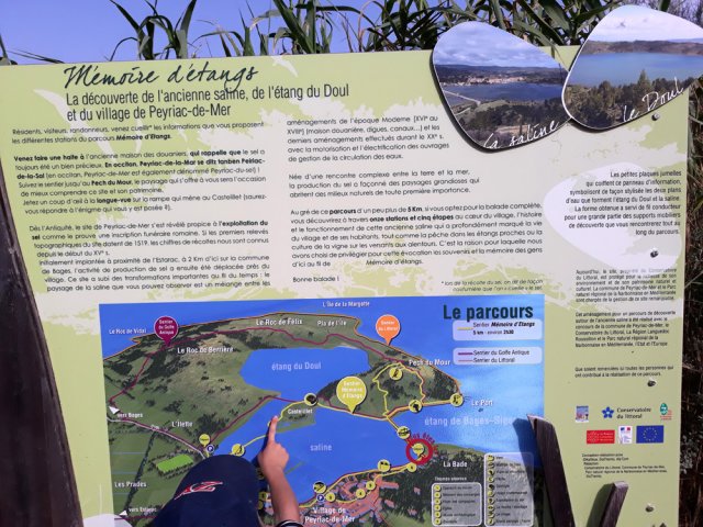 La randonnée débute à la Rue des Salins, près d'une aire de jeux pour enfants. Longer l'étang en marchant vers le nord jusqu'à un panneau explicatif sur la saline, l'étang et le village de Peyriac (Photo 1). Se diriger vers la saline à la fin du parking et débuter la balade sur un long ponton en bois qui domine l'eau de quelques dizaines de cm (Photo 2). L'eau n'est guère transparent ni très profonde. On laisse quelques bandes de terre recouvertes d'une végétation très typique de cette région (Photo 3). Difficile de faire plus facile comme marche sur un plancher de bonne qualité et totalement plat (Photo 4). Des pancartes ça et là donnent de précieux renseignements sur le milieu (Photo 5). Le plancher est parfois remplacé par des digues en terre, toutes aussi plates que les planchers (Photo 8). En face, du côté de l'Îlette, commencent les première pentes du Roc de Berrière qu'on peut facilement atteindre ou longer si on quitte les pontons (Photo 1). Dans un agréable cadre de verdure subsiste une petite cabane en pierre qui servait d'abri au douanier (Photo 10). Il faut parfois franchir de courtes passerelles surplombant de minuscules canaux qui maintiennent le niveau de l'eau (Photo 13). On s'approche d'une minuscule colline dominant l'eau de ses 21 mètres en marchant sur le plus beau ponton de la boucle qui ondule sur la saline (Photo 14). En se retournant, on embrasse d'un seul regard le village de Peyriac-de-Mer (Photo 15). La montée à la colline prend moins d'une minute et permet de mieux distinguer les lieux, les pontons, canaux et l'étang du Doul sur la gauche (Photo 17). On remarque également mieux les murailles de l'espèce de cratère qui entoure l'étang d'origine tectonique (Photo 18). Plusieurs sentiers bordés de petits pins parcourent les berges (Photo 19). Marcher alors plein sud après avoir utilisé une montée pour rejoindre l'autre côté de la colline. On se retrouve sur une petite route étroite et très agréable qui se termine à un croisement vers la colline du Mour (60 m). L'endroit est plus vert que le circuit déjà effectué (Photo 20). Un chemin existe également entre la route et la saline (Photo 21). On se retrouve sur une route plus fréquentée entre le Sel Fort et l'Etang de Peyrac-de-Mer. On retrouve des cabanes en pierre ayant abrité des pompes chargées de réguler le niveau de l'eau de la saline (Photo 23). Cette petite route s'achève au début du village. Prendre à gauche et longer l'eau au plus près en direction de l'aire de jeu repérée au départ.