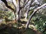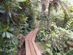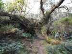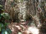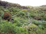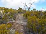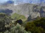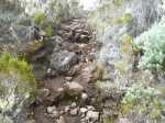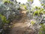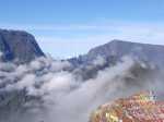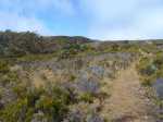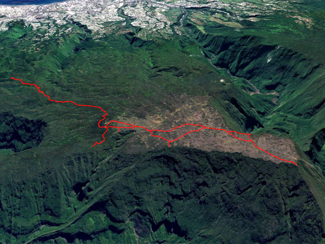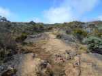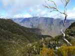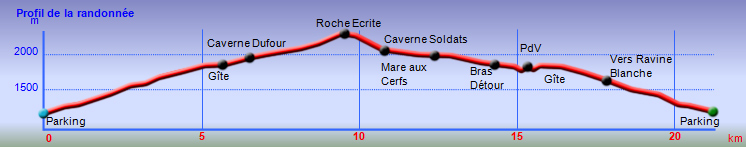La randonnée débute à la toute fin de la route du Brûlé. Un grand kiosque très bien aménagé attend les pique-niqueurs du dimanche avec un foyer où l'on peut allègrement rôtir un mouton. Le sentier débute sur les racines de cryptomerias et emprunte un tracé bordé de planches pour traverser sous le couvert des conifères (Photo 1). Cent mètres plus haut débute le parc national indiqué par son poteau en bois. Tout près un grand panneau attire l'attention du randonneur sur le domaine du tuit-tuit, un oiseau endémique dont la population est parmi la plus faible au monde. Attention pour les non résidents car le point "Vous êtes ici" situe le départ à 5200 mètres à vol de tuit-tuit du point réel (Photo 2). Le sentier, toujours bien entretenu, montera constamment jusqu'à la Roche Ecrite avec seulement une demi douzaine de faux-plats de moins de 100 m. L'effort est donc à fournir durant les trois premières heures, sans échauffement depuis le parking. Jusqu'au gîte, on rencontre tous les types de végétation allant des branles, sabres et fougères du départ aux forêts de calumets, bois de tamarins et de bois de couleurs plus en hauteur. Le sol est tantôt terreux et glissant par temps humide, tantôt envahi de racines ou de boue sur de courtes distances. Les portions marécageuses se franchissent sur des planchers plus ou moins sophistiqués isolant de la gadoue (Photo 4). Des trouées sur la droite permettent parfois de voir la vallée de quelques Bras Sec ou Grand Bras ou de vastes clairières exploitées par l'ONF pour en débarrasser les bois morts (Photo 3). Plus on monte et plus les tamarins des Hauts sont nombreux (Photo 7). On parvient au gîte en moins de deux heures de marche (Photo 8). L'endroit est calme et reposant et sa position à près de 1900 m d'altitude procure de la fraîcheur. Si tous les autres sentiers de la forêt n'ont pas été repérés en montant, débute alors une exploration de la planèze dominant le gîte. Partir vers la gauche en suivant le petit panneau "Bâtiment Bois de Nèfles, 100 m". On passe près de la station météo, d'une réserve d'eau, d'une zone de posé des hélicoptères de secours avant de tourner à angle droit sur un large sentier herbeux pour une progression facile vers le sud (Photo 9). 500 mètres plus loin, partir sur la droite pour 20 mètres de zone dégagée et emprunter le sentier officiel de la Roche Ecrite. La première partie s'effectue sur un terrain terreux parsemé de petits cailloux (Photo 12) ou sur des planches pour les portions humides (Photo 11). Plus haut, on retrouve les larges plaques de lave où la marche est très facile. Les repères de peinture blanche sont si nombreux qu'il est impossible de s'égarer même avec un fort brouillard. On ne décrit plus les paysages sur les deux cirques quand les nuages ne sont pas trop installés (Photo 13). Une fois lues toutes les inscriptions présentant un intérêt littéraire, c'est à dire 5 secondes plus tard, reprendre le chemin inverse jusqu'au premier croisement. Poursuivre tout droit sur les plaques de lave et à travers les brandes réussissant à pousser jusqu'à la Caverne Soldats. Cette vaste cavité peut abriter plusieurs personnes en cas de forte pluie (Photo 14). Il arrive parfois qu'une petite chute d'eau coule de son toit pour la douche du soir en cas de bivouac ! Cette chute modeste est l'une des nombreuses sources de la Rivière des Pluies dont on aperçoit la vallée en repartant sur le sentier vers le gîte. Il est beaucoup plus étroit que celui de la descente et mérite de l'attention (Photo 15). Plus loin, laisser sur la droite le sentier menant à la Bretagne puis obliquer à gauche sur les larges plaques menant à la Mare aux Cerfs (Photo 16). Repérer dans la boue les traces de sabots des cervidés venant boire paisiblement si on ne leur tire pas dessus. La mare est minuscule au milieu des joncs et ses abords marécageux sont couverts de sphaignes (Photo 17). Un petit sentier part sur la droite vers un point de vue sur Mafate (Photo 18). Cet aller-retour ne prend que 5 minutes. Reprendre ensuite la descente vers la Caverne Dufour sur un sentier en pente assez forte à travers les branles (Photo 19). Profiter de la hauteur pour repérer les Pitons Plats qui dépassent à peine de la Plaine des Chicots. Après la traversée de larges prairies entourées de branles, on s'approche de la Caverne et de sa petite mare situées à la jonction des sentiers (Photo 20). La caverne est aussi vaste que la précédente mais elle est moins accueillante en raison de la hauteur de son plafond. On retrouve les plaques de lave usées par les semelles (Photo 21) jusqu'à un petit marécage à sec traversé par le sentier en planches. Chercher à ce moment le nouveau petit sentier qui file vers le rempart du Bras Détour dont on aperçoit la haute cascade à sec (Photo 22). Moins de 300 m plus loin, dans une clairière coupée en deux par une rigole profonde, essayer de trouver le début du sentier qui reliait celui de Dos d'Ane (Photo 23). Il a beaucoup souffert des cyclones et les arbres abattus empêchent de suivre sereinement son tracé. En revanche, les 100 premiers mètres sont aisés à suivre (Photo 24). Traverser une profonde ravine rocheuse et profiter d'un nouveau point de vue sur le Bras Détour et la Crête d'Aurère (Photo 25). L'endroit est prisé des cerfs comme le prouve les nombreuses fumées laissées au sol. Rebrousser encore chemin et reprendre la direction du gîte. Aux premières habitations, s'il n'est pas encore l'heure de revenir vers Mamode Camp, oser un détour de 500 m en partant sur la gauche vers Dos d'Ane. On frôle la Caverne Basse, modernisée en son temps par un mur mais qui décourage désormais tout candidat à un bivouac (Photo 26). Le sentier est très agréable dans les bois de couleurs et les tamarins au sol (Photo 27). Le sentier menant au point de vue est beaucoup plus étroit et permet d'admirer pour l