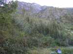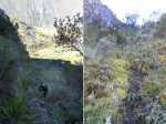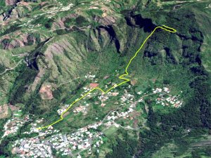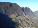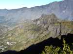 La randonnée débute à la petite poste de Palmiste Rouge. Une ruelle bétonnée en pente commence à la bâtisse jaune et se termine en cul de sac à l'entrée de trois propriétés privées. Le sentier part sur la gauche et s'élève assez rapidement en direction du Chemin des Gaulettes par des centaines de marches bétonnées (Photo 1). Il longe des propriétés privées en offrant déjà de beaux panoramas sur les pitons et remparts qui entourent Palmiste Rouge (Photo 2). On peut emprunter un sentier qui part sur la droite au croisement à mi-chemin ; il mène à l'autre extrémité du Chemin des Gaulettes, créé en fer à cheval. Une fois sur le Chemin des Gaulettes, profiter à nouveau des beaux points de vue sur le Gros Morne de Gueule Rouge et le Piton Morel (Photo 3). En haut de la rue, prendre à droite et redescendre une courte portion du Chemin Morel. En face d'une maison au jardin fleuri, au numéro 295, prendre à gauche le sentier qui débute le long d'un grillage. Ce sentier sans marches bétonnées donne une idée du Chemin des Gaulettes il y a une décennie (Photo 4). Il se termine rapidement à quelques cases isolées. Longer la piste suivante jusqu'au premier virage à droite et prendre à gauche sur une nouvelle piste bordée par un champ de lentilles. Ne pas manquer sur la droite une nouvelle piste pénétrant entre les champs jusqu'à quelques ruches sur le bord (Photo 5). Ne pas quitter cette piste qui est privée sur une cinquantaine de mètres. Aux ruches, poursuivre jusqu'au grillage et laisser le sentier qui mène aux arbres fruitiers derrière une clôture grillagée. Obliquer sur la gauche à un jeune longani et longer le grillage sur une vingtaine de mètres. La balade est terminée et l'ascension peut débuter. On se retrouve sous le couvert de quelques bois de couleurs envahis de néfliers du Japon (bibassier) sur un "sentier" étroit, difficile à suivre dans les jouvences déjà envahissantes (Photo 6). La pente est parfois très forte et on s'élève rapidement malgré la lenteur de la marche (Photo 7). L'essentiel du passage s'effectue sur un immense pierrier qui recouvre les flancs du Grand Piton (Photo 8). La montée est lente en raison de la pente mais également du temps qu'il faut passer à chercher où poser les pieds sur les pierres les plus stables. La muraille du Grand Piton grandit au fur et à mesure de l'ascension et on devine qu'il faudra obliquer pour la franchir (Photo 10). Certaines roches sont si grosses qu'elles créent de très hautes marches (Photo 11). Après de bons coups de rein où il aura fallu s'agripper à tout ce qui peut aider au passage pentu, le sentier oblique sur la droite à l'approche de la muraille (Photo 14). Le passage semble impossible mais un tunnel végétal entre le rocher et un eucalyptus attire le regard (Photo 15). La vigne marronne tente de reboucher l'endroit mais quelques coup de bâton au passage remettra à plus tard cette invasion. Plus loin, le passage longe au plus près le rocher sur une pente toujours aussi importante (Photo 16). Attention de ne pas s'appuyer à la falaise car des roches, uniquement coincées par la mousse et des racines de jouvences, tombent au moindre contact, rendant très dangereuse la montée pour ceux qui suivent. Le passage plonge un peu vers le bas à partir d'un rocher en surplomb près d'un filao (Photo 17). Marcher sous ces filaos, enjamber quelques branches tombées du dernier coup de vent et retrouver la falaise qui se termine pour se transformer en rein. On se retrouve sur la trace du "sentier officiel" qui n'a sans doute jamais été utilisé depuis près de 50 ans ! (Photo 18). Malgré les inévitables jouvences, il grimpe en lacets vers le haut du rein au milieu des chocas (Photo 19). La suite de la montée va s'effectuer sur l'arête en partant sur la gauche. Sur la droite, on ne distingue pas encore l'espèce de cratère qui constitue le haut du Grand Piton. Une petite forêt d'eucalyptus semble en pleine forme, sans doute à l'abri des coups de vents durant les cyclones (Photo 20). Plus de trace de la source dont parlaient les anciens mais une profonde ravine sombre montre bien que de l'eau a coulé ici à une époque moins sèche. La remontée de la crête est ardue sur un sentier très étroit mais protégé du vide par une végétation de bois de couleurs assez dense (Photo 22). On profite enfin de magnifiques panoramas sur la vallée de la Ravine des Calumets et de Palmiste Rouge (Photo 21) et sur le Gros Morne de Gueule Rouge (Photo 23). Le sentier ne suit pas toujours la crête, ne s'en éloigne jamais vraiment mais la rejoint à un moment à un petit cul de sac qui sera la fin de cette montée sportive (Photo 24). ATTENTION, le promontoire est étroit, glissant et un vide de 100 mètres le rend très dangereux. Il ne peut accepter plus d'un randonneur avide de contempler le paysage. Depuis le beau bois de rempart qui pousse au sommet (Photo 26) on peut profiter de tout le sud du cirque en direction de Saint-Louis (Photo 25), de la forêt de bois de couleurs qui recouvre le sommet (Photo 27) et l'on devine très bien le creux du très ancien effondrement donnant au sommet un aspect de cratère (Photo 28). La descente vers Palmiste Rouge emprunte le même itinéraire mais n'est cependant pas une partie de plaisir. Si les fortes montées glissantes et moussues ont pu s'escalader à quatre pattes, la descente usera certainement le fond du pantalon. Pire, les cailloux du pierrier réagissent plus vite à un pied qui descend parfois trop vite qu'à celui qui monte lentement en cherchant la bonne position.