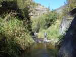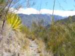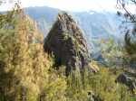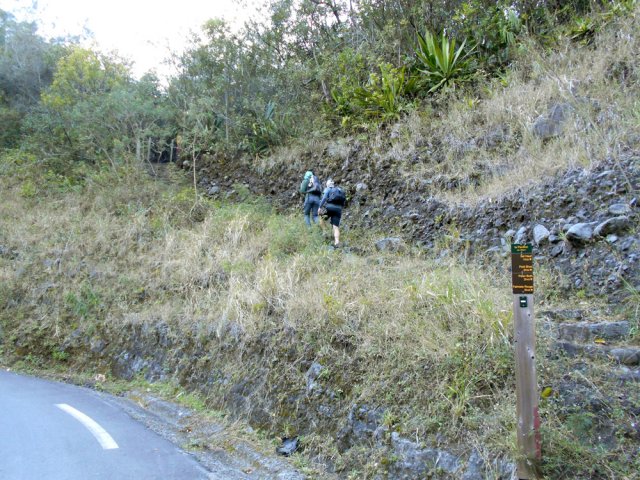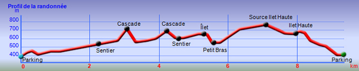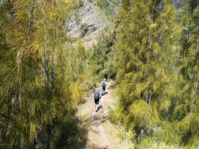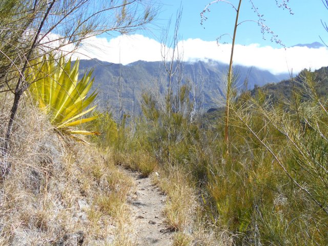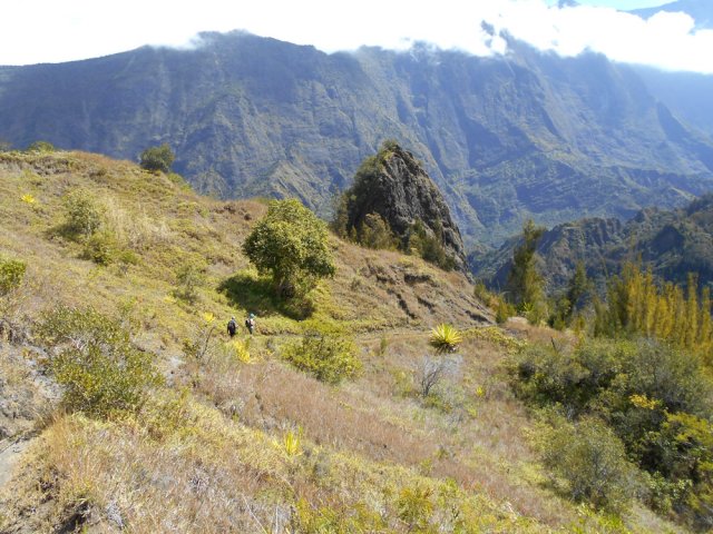 La randonnée débute au Pavillon où quelques emplacements permettent de stationner après avoir franchi le pont bruyant proche du gîte. Marcher 300 mètres sur la route vers Cilaos et emprunter le sentier en direction de Palmiste Rouge (Photo 1). Après une courte montée sur marches en pierre, il redescend en lacets sur de nouvelles marches soutenues par des planches en direction du Petit Bras de Cilaos qu'on atteint rapidement. Délaisser le sentier qui remonte vers l'Îlet Haute et partir vers l'amont par la gauche le long du torrent, tout près d'un toboggan et son bassin. Ni sentier, ni itinéraire conseillés pour remonter cette rivière sur quatre kilomètres. Le fond du torrent est toujours aisé à pratiquer et il ne faut pas hésiter à mouiller les pieds depuis le départ puisque les passages aquatiques seront inévitables. Cette remontée alterne portions rocheuses sur des basaltes (Photo 2), escalade sans danger de gros rochers (Photo 3) ou marche sur le fond sableux du petit cours d'eau (Photo 5). Les hautes falaises qui bordent le bras empêchent le plus souvent de voir loin mais quelques trouées permettent de beaux panoramas en direction de Palmiste Rouge ou de la Fenêtre des Makes (Photo 4). Le Bras semble parfois totalement fermé par d'énormes blocs tombés des falaises mais il y a toujours un passage sous une de ces roches ou au plus près de la falaise avant de reprendre la remontée aquatique (Photo 6). Un peu partout, des murettes en galets sont là en prévision de "pêches artisanales" qui consistent à dévier pour un temps le cours d'eau afin de récupérer plus facilement les occupants des lieux (Photo 8). On rencontre des endroits charmants constitués de rives basaltiques abritant des bassins (Photo 9) ou des petites chutes d'eau qui se franchissent sans danger ni effort (Photo 10). En rive droite, difficile de retrouver des traces du sentier de l'Îlet Elizabeth, pourtant très bien représenté sur la carte IGN. On croise le discret sentier de l'Îlet Haute qu'on utilisera en fin de boucle mais on poursuit toujours la balade aquatique vers l'amont. C'est là que l'on tourne à droite si on craint un peu l'aventure qui suit. Plusieurs ravines finissent dans le Petit Bras de Cilaos en rive gauche. La première d'entre elles débute par de gros rochers sous les filaos. La remontée est sportive mais sans grand danger. On parvient à une fine cascade où des cordes et mousquetons indiquent qu'elle est connue des canyonistes. Gare à la glissade si l'on s'en approche (Photo 13). Redescendre jusqu'au Petit Bras et poursuivre vers l'amont jusqu'au confluent de la discrète ravine Clain prenant sa source près de l'Îlet à Calebasse. Sa remontée est plus facile que la dernière qui vient d'être entreprise. La vallée est un étroit canyon encombré de rochers et de filaos tombés lors du dernier cyclone. La pente est forte et on parvient de rocher en rocher à une première petite cascade qu'on contourne par la rive droite (Photo 14). Quelques mètres plus haut, une seconde chute se termine dans un beau petit bassin surmonté de la voute d'une caverne (Photo 15). L'endroit est un plaisir pour les yeux mais la falaise qui l'entoure ne peut pas se franchir sans matériel. Il faut donc faire demi-tour et retrouver assez rapidement le Petit Bras de Cilaos. Le but consiste désormais à rejoindre l'Îlet Haute. Deux solutions pour cela : redescendre le Petit Bras de Cilaos jusqu'au croisement avec le sentier ou prendre tout bonnement le sentier venant de Palmiste Rouge qui frôle le torrent à cet endroit. Il traverse tout d'abord un bois de filaos sur un terrain terreux (Photo 16). Très vite, il grimpe très fortement en lacets faits de marches en bois. Il redescend aussitôt tout aussi fortement pour devenir plus plat à l'approche d'anciens îlets semblant totalement abandonnés. On traverse cette ancienne zone de culture sans rien remarquer de particulier si ce n'est une case, un vieux manguier, des murettes et des lignes électriques venant de Peter Both. Les paysages alentours donnent une idée de la vue qu'avaient les habitants à l'époque où la forêt actuelle était cultivée (Photo 17). Au croisement du sentier remontant vers Peter Both, prendre à gauche et entreprendre une courte descente caillouteuse vers le Petit Bras de Cilaos. Traverser la rivière sans se mouiller les pieds est quasiment impossible à moins d'utiliser le tronc du filao couché en amont. On se retrouve dans les hautes cannes fourragères pour quelques mètres mais le sentier se trouve encore facilement. Débute alors un des plus beaux sentiers du cirque. Il monte parfois fortement sur de hautes marches en pierre, bordé de filaos rabougris ayant du mal à pousser sur ce sol aride et sec. Même les chocas, si verts de l'autre côté de la vallée, sont ici jaunes et mettent des années à fleurir (Photo 18). Les paysages sont extraordinaires et les panoramas embrassent la totalité du cirque. Le terrain recouvert de savane permet de voir loin et de repérer le sentier qui monte et descend au gré du relief (Photo 19). A certains endroits, les filaos ont réussi à atteindre une hauteur correcte, signe de la présence d'eau (Photo 20). De plus en plus de tuyaux jonchent le sentier ou ses abords, signe que le problème de l'eau est un des premiers à résoudre si l'on veut vivre en ces lieux isolés du monde. Le sentier traverse d'ailleurs quelques sous-bois verdoyants coupés de petites ravines longées par ces tuyaux. On contourne par la gauche une dent rocheuse culminant à 746 mètres, impossible à grimper (Photo 24). De là, on a sous les yeux tout un plateau couvert de grosses touffes de bambous d'où surgissent quelques toitures de l'Îlet Haute. La première case rencontrée est l'antique gîte Dan Tan Lontan qui souffre des années (Photo 25). La traversée du plateau ne prend que quelques minutes et l'on se retrouve près d'un oratoire rempli d'effigies de la Vierge.