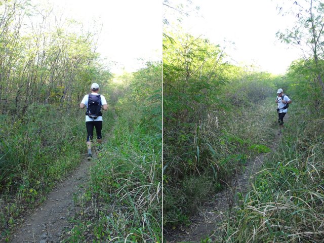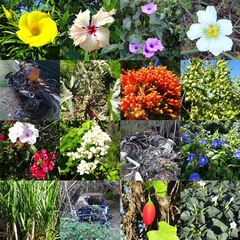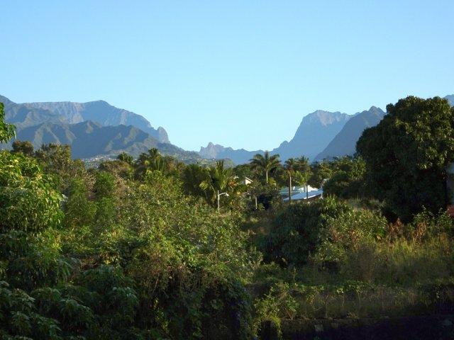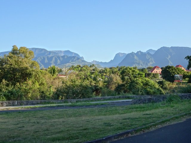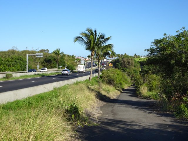 La randonnée débute au terrain de sport de Bois d'Olives où quelques places de stationnement se situent près des petits commerces. Marcher quelques mètres sur la Rue Baba Selly puis bifurquer sur le sentier qui traverse un semblant de parc arboré, peu entretenu mais éclairé ! (Photo 1). On profite des premiers rayons de la journée qui éclairent les cirques et les pitons qui les entourent (Photo 2). Le sentier se termine à la RD 38 à quelques pas du pont enjambant la Ravine des Cabris. Cette ravine, uniquement en eau durant les cyclones, a le fond couvert de verdure et se prête peu à des balades hors sentier (Photo 3). Marcher vers Saint-Pierre et bifurquer aussitôt sur le Chemin Palma, une rue très calme de Bois d'Olives qui descend en pente douce vers les ruines du Canal Saint-Etienne (Photo 5). Cet ancien canal qui alimentait Saint-Pierre a été totalement abandonné mais un sentier qui en longe une partie sillonne entre nature et habitations (Photo 6). On se retrouve à nouveau à la Ravine des Cabris qu'on franchit sur une passerelle (Photo 7). Le fond est déjà plus rocheux qu'en amont avec toujours les mêmes panoramas sur le Gros Morne qu'on ne quittera pas de la matinée (Photo 8). Le sentier longeant le canal se poursuit encore sur un bon kilomètre. Il est parcouru par le trail mais abandonné pour cette boucle. Aussitôt la passerelle franchie, trouver le sentier qui démarre à gauche. Il est emprunté par les joggers qui s'entraînent vers le circuit de motocross de Saint-Pierre. Il traverse presque à plat une grande étendue couverte d'acacias, épineux et grandes herbes (Photo 9). Il se termine à une rue bordée d'arbres qu'on évite pour partir à gauche sur une piste plus large mais également herbeuse (Photo 10). On se retrouve à marcher dans une forêt inextricable de jeunes acacias, le long d'un petit canal envahi par les plantes et les feuilles (Photo 11). La piste se transforme en sentier pour franchir la Ravine des Cabris puis on parvient dans une zone industrielle et commerciale qui ronge chaque année la forêt d'acacias (Photo 12). La piste, toujours présente sur la carte, est devenue une route goudronnée et c'est sur un large trottoir que se poursuit la boucle. Au premier rond-point, contourner et prendre à droite, longer un grand bâtiment puis retrouver une piste fréquentée par les coureurs à deux pas du circuit de motocross. On peut poursuivre tout droit en direction de la station service proche de la RN1. Pourtant, la piste partant sur la droite est plus agréable dans son écrin de verdure (Photo 13). A l'approche de la Ravine des Cabris, elle oblique sur la gauche et se poursuit dans le même type de végétation (Photo 14). Plus loin, les acacias sont remplacés par des chocas et des tamarins dont les fruits pendent au bout d'un long pédoncule. Les branches couchées par le vent ont été taillées pour créer un tunnel végétal (Photo 15). Le bruit de la circulation grossit de plus en plus lorsque l'on arrive à la petite route qui longe la voie rapide. Cette route étroite permet cependant le passage des camions qui viennent ici déverser impunément leur contenu créant des panoramas bien différents de ceux observés au départ (Photo 16). Les caméras sont présentes partout le long de la RN1. Si l'une d'entre elles était orientée sur cette petite route, il y a de fortes chances que la pollution diminuerait mais qui prendra un jour une telle décision ? C'est parti pour deux km durant lesquels le bruit ne cessera pas car, même la nuit, cette RN1 est toujours encombrée, donc bruyante (Photo 17). Curieusement, cette région sèche et surchauffée où aucun bovin ne paisse, est surtout recouverte de prairies régulièrement fauchées (Photo 18). Après avoir frôlé des oratoires différents mais complémentaires (Photo 19), on aperçoit au loin une vieille cheminée du côté de Pierrefonds qu'on rejoint en quelques minutes (Photo 20). Attention à la circulation pour traverser la route et rejoindre ce village coincé entre la Rivière St-Etienne, la RN1 et les champs de canne. Emprunter n'importe quelle rue et se diriger vers l'ancienne usine qui tombe en ruine et occupe une très grande superficie. Certaines dépendances ont été rénovées et sont occupées tandis que le corps principal de l'unité de production plie sous le poids de la rouille (Photo 22). Deux énormes grues de déchargement vieillissent également (Photo 21). Ne pas manquer au retour l'église sur la gauche qui ressemble plus à un magasin à sucre qu'à un édifice religieux. Seule la croix permet de la deviner dans son écrin de verdure. Regagner et traverser la D26 et partir dans les cannes pour retrouver la campagne. Paradoxalement, la circulation sur cette piste existe et il faut en tenir compte. Après un grand virage vers la gauche, on se rapproche de Bois d'Olives dans un paysage calme et verdoyant sur une piste reposante (Photo 23). Les prairies se multiplient avant d'être remplacées par de la canne à sucre et des palmeraies (Photo 24). La fin du parcours campagnard retrouve les acacias et savane du départ (Photo 25). Après avoir franchi le Canal St-Etienne sans trop le voir puis longé le collège, on rejoint la RD38 par le Chemin Vilris. Le parcours officiel du trail urbain file sur la gauche vers la chapelle qui se délabre d'année en année et ne résistera pas au prochain cyclone (Photo 27). Les puristes suivront tour à tour l'Allée des Bois Noirs, le Chemin Bancoule puis le Chemin de la Ligne d'Equerre avant d'arriver au lycée (Photo 28). Le terrain de sport, fin de la boucle, est à une centaine de mètres.