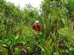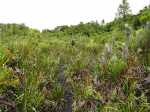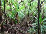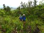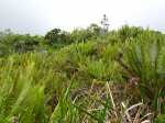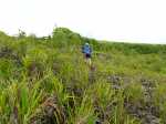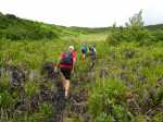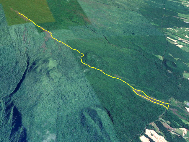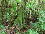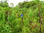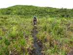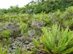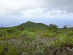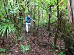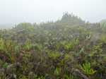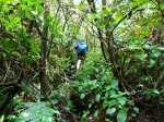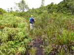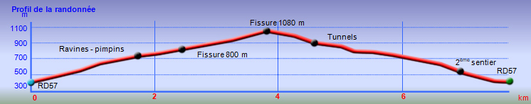La randonnée débute sur le bord de la route des Radiers (ou Chemin Touzet) à quelques pas de la borne 407. Deux sentiers séparés d'une centaine de mètres se remarquent dans le fossé et il est possible d'emprunter l'un ou l'autre (Photo 1). On est immédiatement frappé par la qualité de ce sentier sans doute maintes fois emprunté à l'époque où la coulée était nue, avant l'implantation de la végétation (Photo 2). La pente est assez faible et surtout régulière ce qui permet de doser son effort (Photo 3). Les laves ne sont presque plus visibles, recouvertes par de petits lichens gris. Ailleurs, ce sont surtout les sabres marrons, les fausses osmondes (Blechnum tabulare (Thunb.) Kuhn) et les orchidées bambou qui ont envahi les parties creuses (Photo 4). Lorsque l'on marche au cœur de la coulée, reconnaissable à l'absence d'arbres, le sentier est constamment présent (Photo 5). Ce sera moins évident dans les portions arborées. L'absence de végétation permet de larges fenêtres sur la côte en direction du Piton de Sainte-Rose (Photo 7) et des fermes éoliennes de Sainte-Rose (Photo 9). Plus on monte et plus les sabres, orchidées et autres fougères (Nephrolepis abrupta) grandissent (Photo 10). La coulée disparaît par endroits, là où elle a surgi trop vite pour créer de larges surfaces, on se retrouve alors dans des zones boisées en jeunes bois de couleurs (Photo 11). Puis on pénètre en sous-bois très humides et boueux où la mousse recouvre tous les troncs pour de belles photos si le soleil est présent (Photo 12). Le sentier est moins instinctif et il faut guetter les passages au sol ou quelques rubalises posées par d'autres marcheurs (Photo 13). La traversée est courte et l'on se retrouve dans la coulée recouverte de fougères de différentes espèces à chercher le sentier plus des mains que des yeux (Photo 14). Il faut se baisser quelquefois sur de courtes distances pour éviter des branches (Photo 16). La montée se poursuit alternant hautes fougères et sabres, jeunes arbres ou landes basaltiques arides où la végétation a du mal à s'implanter (Photo 17). Sur la gauche, le Piton Trois Têtes dépasse mais est difficilement accessible à partir de ce sentier (Photo 18). Après une nouvelles coulée, on pénètre dans un sous-bois humide en suivant une ancienne ravine recouverte de lave et d'une végétation touffue (Photo 21). Sur la carte IGN, on repère d'ailleurs plusieurs traits bleus interrompus par les taches blanches de la lave. On atteint ainsi une importante concentration de pimpins, ce pandanus des Hauts qui passe sa vie à chercher la lumière en créant de très longues branches qui retombent facilement au sol en raison du poids des rameaux (Photo 22). Le sol est humide, la lumière traverse difficilement et les rubalises sont encore utiles pour ne pas s'égarer dans ce sous-bois, seule véritable difficulté de la montée. Les coulées s'enchainent avec un sentier qui chemine toujours à travers les fausses osmondes (Photo 23). Par endroits, elles semblent donner l'impression d'avoir été semées tellement elles sont nombreuses et touffues (Photo 24). A l'approche des 1000 m, les petits tunnels de lave se multiplient. Le sentier passe sur certains et il vaut mieux ne pas frapper du pied car la vieille lave n'a que quelques centimètres d'épaisseur et peut casser sous le poids d'un randonneur (Photo 25). Cette remontée, arrêtée à 1080 m en raison du brouillard, soit à 250 mètres de l'éruption supérieure prend fin à la deuxième faille. Une courte descente au cœur de cette dépression permet de remarquer qu'elle est insignifiante et moins spectaculaire que les hauts cratères éruptifs créés ailleurs lors d'autres coulées. (Photo 28). Le retour, en descente cette fois, emprunte le même itinéraire. Il est facilité par la trace GPS créée lors de la montée qui enlève des hésitations toujours possibles à cause de la végétation gênant le regard en direction du sentier. 600 mètres avant le Chemin Touzet, on peut emprunter comme ici le sentier qui part sur la gauche et arrive 100 mètres en aval du parking de départ.