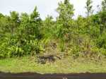 L'éruption de 1977 a longuement marqué les esprits par son caractère exceptionnel et surtout par le symbolique contournement de l'église de Notre Dame des Laves (voir § ci-dessous). Née à 1100 mètres d'altitude, cette coulée, issue de failles, a dévalé très rapidement les pentes de la forêt de Sainte-Rose pour se jeter dans la mer. 3500 mètres ont déjà été présentés lors d'une boucle entre le Chemin Touzet et la mer. Cette fiche se propose de remonter la coulée jusqu'aux premières failles totalement recouvertes de divers types de fougères. Un sentier existe sans doute depuis cette coulée historique et se remarque très bien depuis la route des Radiers. Cet aller-retour obligatoire ne s'adresse qu'aux inconditionnels de la pratique des sentiers lontan. Si les quatre kilomètres de sentier ne se perdent jamais des yeux, ils sont en revanche une véritable épreuve sportive pour fendre des bras la végétation sur les abords allant jusqu'à masquer le sentier sur les trois quarts de la montée. A mi-parcours, une courte traversée de forêt touffue et moussue mérite plus d'attention qu'ailleurs mais des rubalises rassurent en cas de doute sur la route à suivre. Cette montée est à privilégier en période sèche car les sabres et fougères mouillés détrempent très vite vêtements et chaussures. La boucle du premier kilomètre (voir la carte ci-dessous) peut être effectuée par toute la famille ou rajoutée à la plus longue boucle venant de la mer.