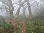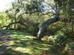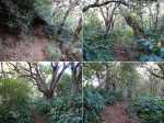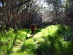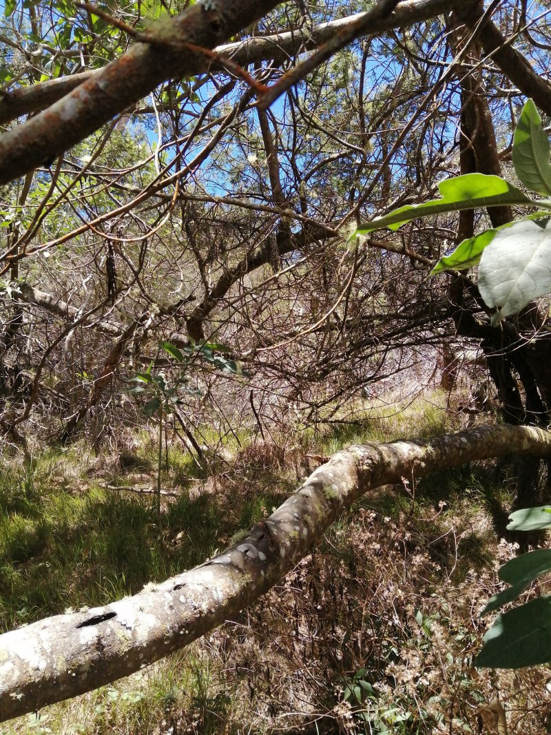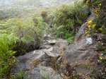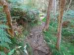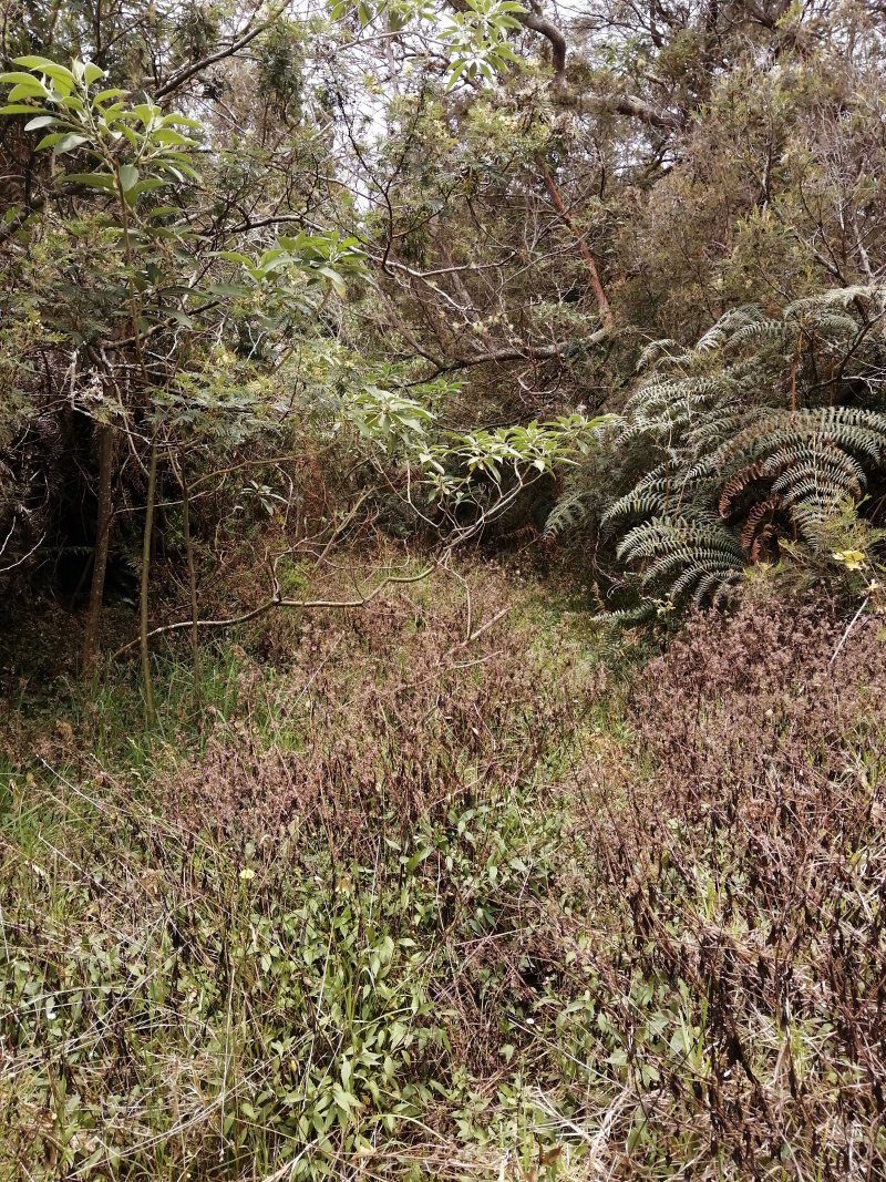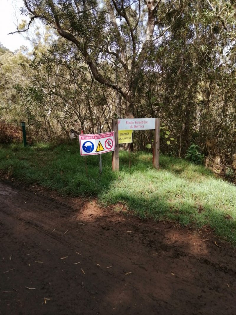 La randonnée familiale débute à deux pas de la Piste Forestière (PF) du Bernica qui serpente entre les tamarins ou bois de couleurs et se termine à la Route Forestière (RF) des Tamarins. La pente est faible, le sol recouvert d'une herbe courte ou d'une bande de roulement terreuse plus agréable pour éviter la rosée qui mouille très vite les chaussures. La piste qui comporte peu de lacets franchit plusieurs ravines modestes. Après 1500 mètres, elle effectue un grand virage à gauche. Guetter sur la droite l'escalier en bois qui franchit une clôture vers un ancien sentier dévoré par la végétation. Très vite, un autre sentier débute sur la droite et plonge dans la forêt (Photo 1). Les balisages VTT confirment les traces de pneus que l'on remarque au sol. Sur le bord du sentier, on découvre des arbres remarquables comme des tans rouges, des bois maigres avec bien sûr les inévitables tamarins des Hauts (Photo 2). Après un tunnel végétal, ce sont les longoses qui bordent le parcours tout en descente se terminant à la PF des Palmistes. Prendre à gauche sur cette piste plus étroite et humide que la précédente. On marche le plus souvent sur de l’herbe humide ou dans la terre mouillée (Photo 3 et 4). Repérer au passage la très sauvage Ravine la Pompe qu'on retrouvera quelques centaines de mètres plus haut. Après deux longs lacets, repérer le sentier qui débute à gauche à quelques mètres de la Ravine la Pompe. Ce sentier, également de bonne qualité, rejoint rapidement la PF du Bernica par une pente sans difficulté (Photo 5). Débute alors une longue portion reposante sur une piste large, presque plate, herbeuse (Photo 7) et bordée de magnifiques tamarins (Photo 8). Ces grands arbres qui résistent assez facilement aux cyclones ploient comme le roseau mais ne se brisent pas (Photo 9). On passe d'ailleurs très près du sentier botanique des Tamarins que l'on contourne avant de parvenir à la Rf des Tamarins. Partir sur le béton en direction du Maïdo et rejoindre rapidement une belle clairière ayant servi à une époque de lieu de pique-nique. Sur la droite débute une piste herbeuse et couverte de jouvences qui mouillent beaucoup les pieds (Photo 10). Elle traverse un bois d'acacias noirs avant de parvenir à la sommière Bernica. Cette sommière, à l'inverse, est surtout constituée de lave qui facilite grandement la marche (Photo 11). Après avoir franchi la ligne domaniale, le sentier marqué de quelques cairns se rapproche de la très sauvage ravine la Source qui a créé un véritable petit canyon étroit dans cette lave très dure (Photo 12). On retrouve la PF des 1800, reconnaissable à son revêtement caillouteux et la poussière dégagée par temps sec (Photo 13). C'est là que la randonné familiale oblique vers la gauche pour rejoindre la PF Belon et retrouver le point de départ.
