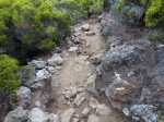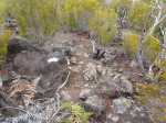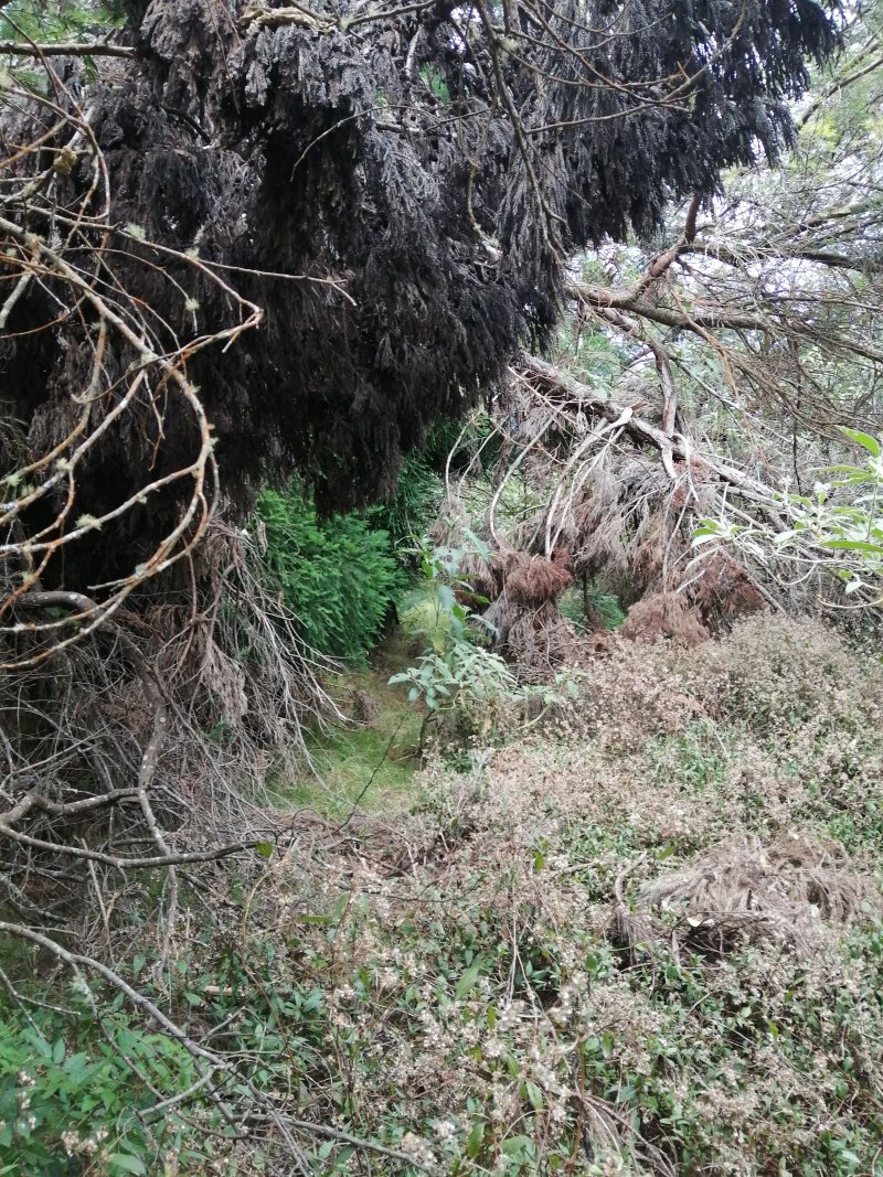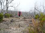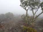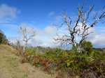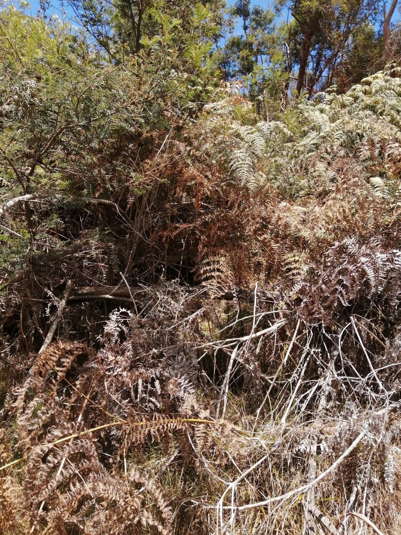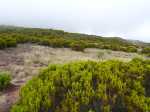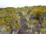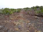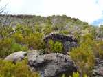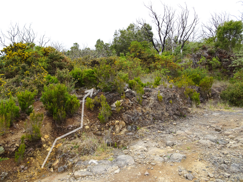 La deuxième partie, plus sportive et plus compliquée pour la remontée vers le Grand Bord, emprunte la PF des 1800 vers la droite pour une nouvelle séance de repos. Elle est large, sèche, caillouteuse, bordée de beaucoup d'ajoncs d'Europe, de fougères et de carcasses d'arbres calcinés (Photo 14). Après avoir franchi une demi-douzaine de ravines, guetter particulièrement la Ravine Saint-Gilles, insignifiante à cette altitude mais très importante comme repère. C'est à moins de 10 mètres de la traversée que débute l'ancien sentier matérialisé par une très discrète flèche blanche peinte au sol (voir § ci-dessous). Le GPS est recommandé pour éviter de perdre la trace des pointillés de la carte IGN dont on ne s'éloigne jamais de plus de 10 mètres sur le terrain en raison de certains obstacles créés par les incendies. Des rubalises très rares au départ, des traces de peinture qui diminuent également dans la montée ou de rares cairns viennent régulièrement rassurer sur la direction empruntée. Garder en mémoire qu'on longe la rive gauche de la Ravine Saint-Gilles sur les trois quarts de la montée. Le sentier est fréquemment présent (Photo 15) puis disparaît pour quelques mètres avant de resurgir entre des fougères, des branles verts (Photo 16) ou des bois calcinés qui laissent des traces noires sur les vêtements (Photo 17). A mi-parcours, on remarque un cratère qui dépasse de la planèze (Photo 20). Il ne s'agit pas du Piton de la Ravine Saint-Gilles marqué sur les cartes sur le bord du rempart de Mafate. Il faut d'abord partir à gauche, traverser la Ravine Saint-Gilles, le rejoindre et le grimper par la gauche en rejoignant tout d'abord un gros bloc de basalte érodé (Photo 21). Près du bloc, un cairn indique l'ancien passage mais il est assez difficile à discerner en raison des fougères qui l'obstruent. Ne pas hésiter à franchir ces dix mètres qui griffent un peu pour parvenir au sommet d'un plateau bien dégagé. De la lèvre du cratère on a de belles vues sur le fond infranchissable. La fin de la montée s'effectue toujours au plus près de la ravine, dans le fond même ou dans les petits branles verts qui la bordent. On se retrouve enfin, après 80 minutes de montée sportive, sur le sentier de la Glacière bordé à cet endroit de nombreuses clairières invitant au bivouac (Photo 23). Pas de conseil particulier pour se rendre au Piton Bernica. Les sentiers et pistes, très nombreux et maintes fois décrits, partent tous vers le Maïdo. La reconnaissance effectuée a suivi le sentier de bord du Piton de la Ravine Saint-Gilles jusqu'au point 2263 pour obliquer à gauche vers l'Observatoire de l'Air. Après une très courte portion de béton, partir à gauche vers le Piton Bernica reconnaissable à son mirador que l'on n'a guère quitté des yeux depuis le départ de la boucle. Un sentier débute au pied du mirador et plonge rapidement vers la route du Maïdo. Il est étroit, en bon état mais rendu difficile par la quantité de pierres qui l'encombrent (Photo 25). Ne pas emprunter la route mais partir légèrement sur la gauche et suivre longuement une piste couverte de laves aux couleurs chaudes parcourue par les cyclistes et les randonneurs (Photos 26 et 27). Cette piste en descente constante se termine à la PF des 1800 qu'on emprunte sur une courte distance en partant vers la droite. Très vite, la PF Bolon se présente sur la gauche, très proche d'un sentier de vététistes. Ce sentier est très agréable entre de beaux tamarins (Photo 28). Le quitter au premier croisement et emprunter la piste Bolon qui effectue plusieurs virages également en descente constante vers la RF des Tamarins et le parking laissé au départ.